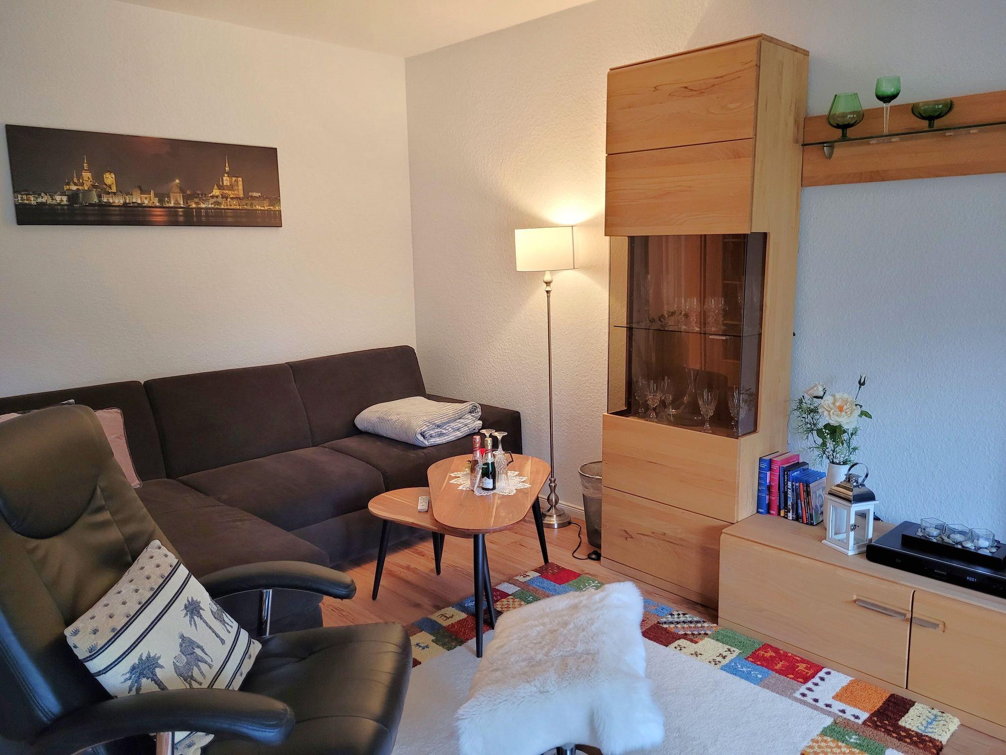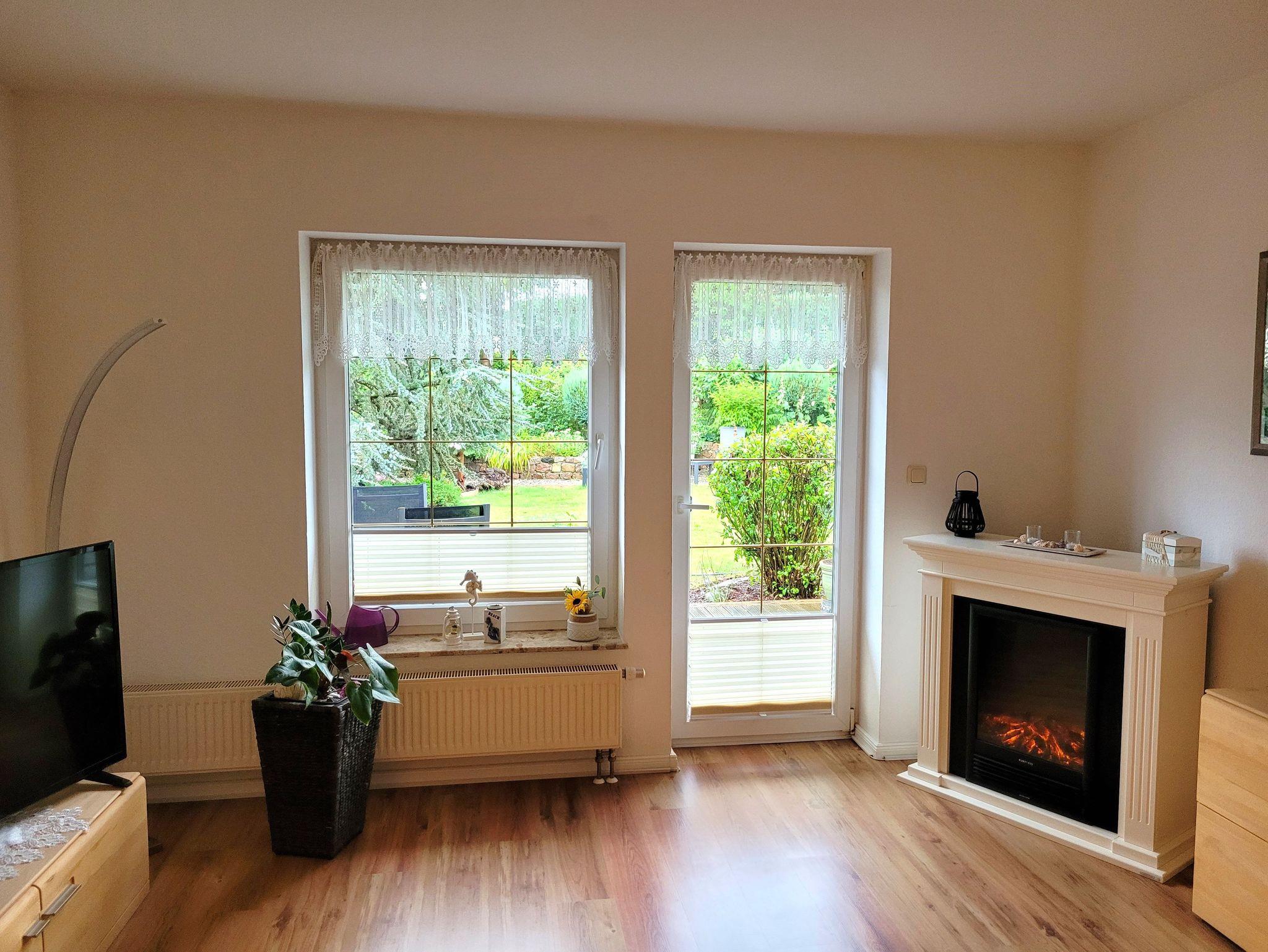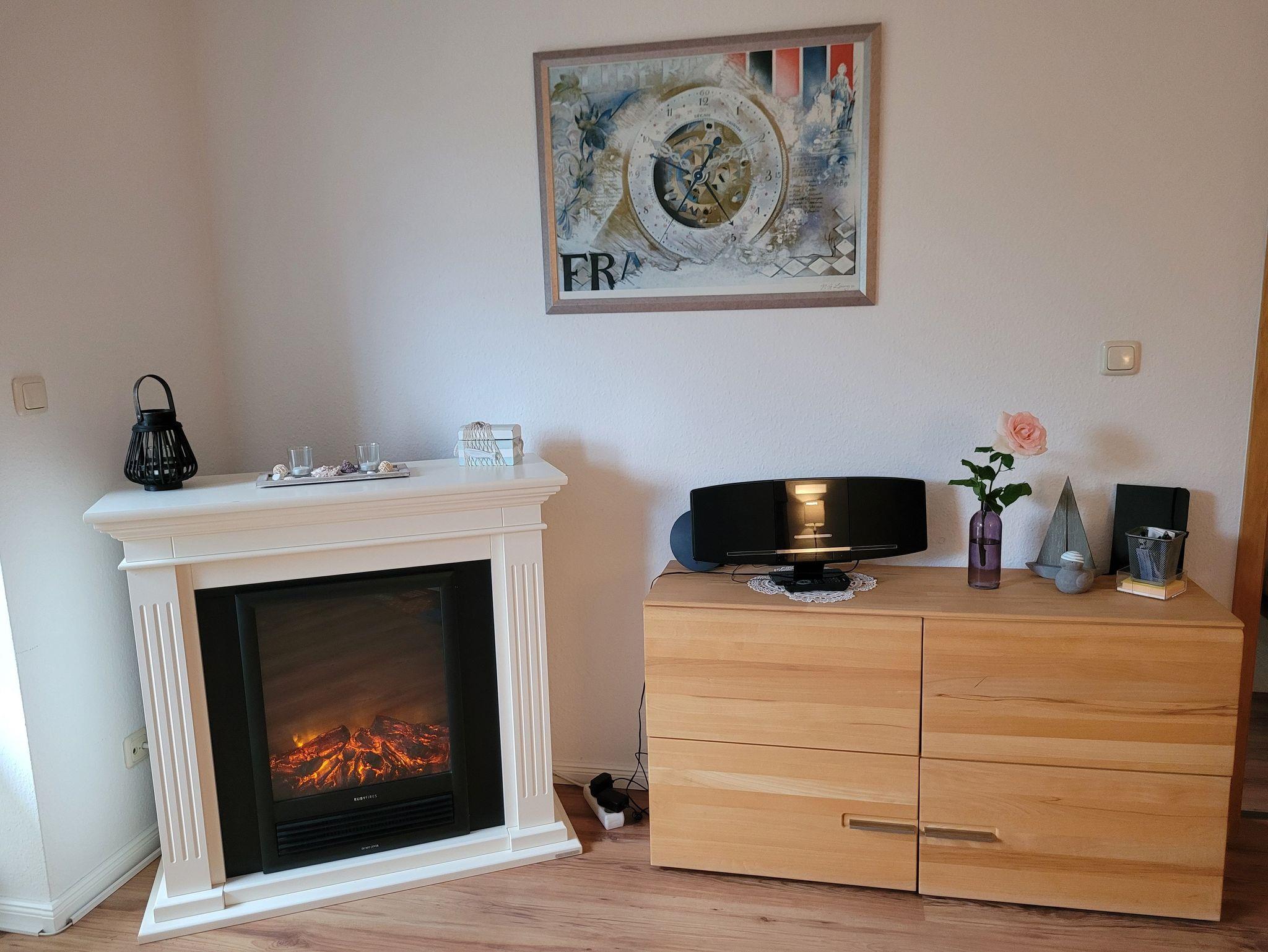 Die Ferienwohnung mit 56m² besteht aus einem Wohnzimmer mit gemütlicher Couch (Aufbettung für 2 Personen), TV und E-Kamin für gemütliche Stunden.