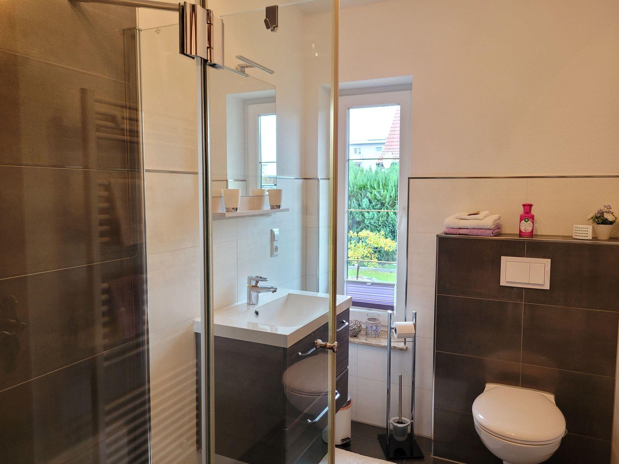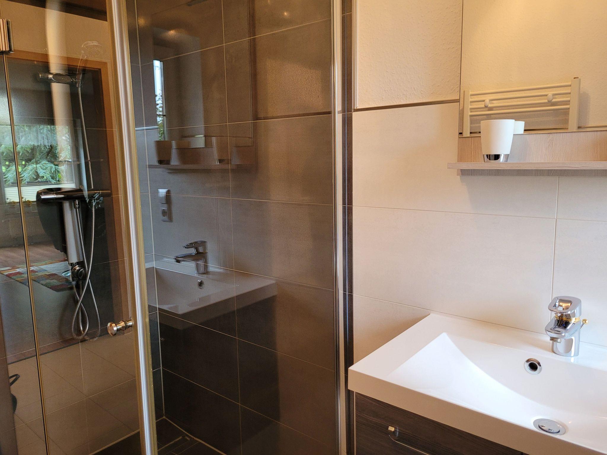 Das Badezimmer hat eine ebenerdige Dusche. Frische Handtücher und ein Föhn sind selbstverständlich vorhanden, sodass Sie sich nach einem erlebnisreichen Tag bestens pflegen können.