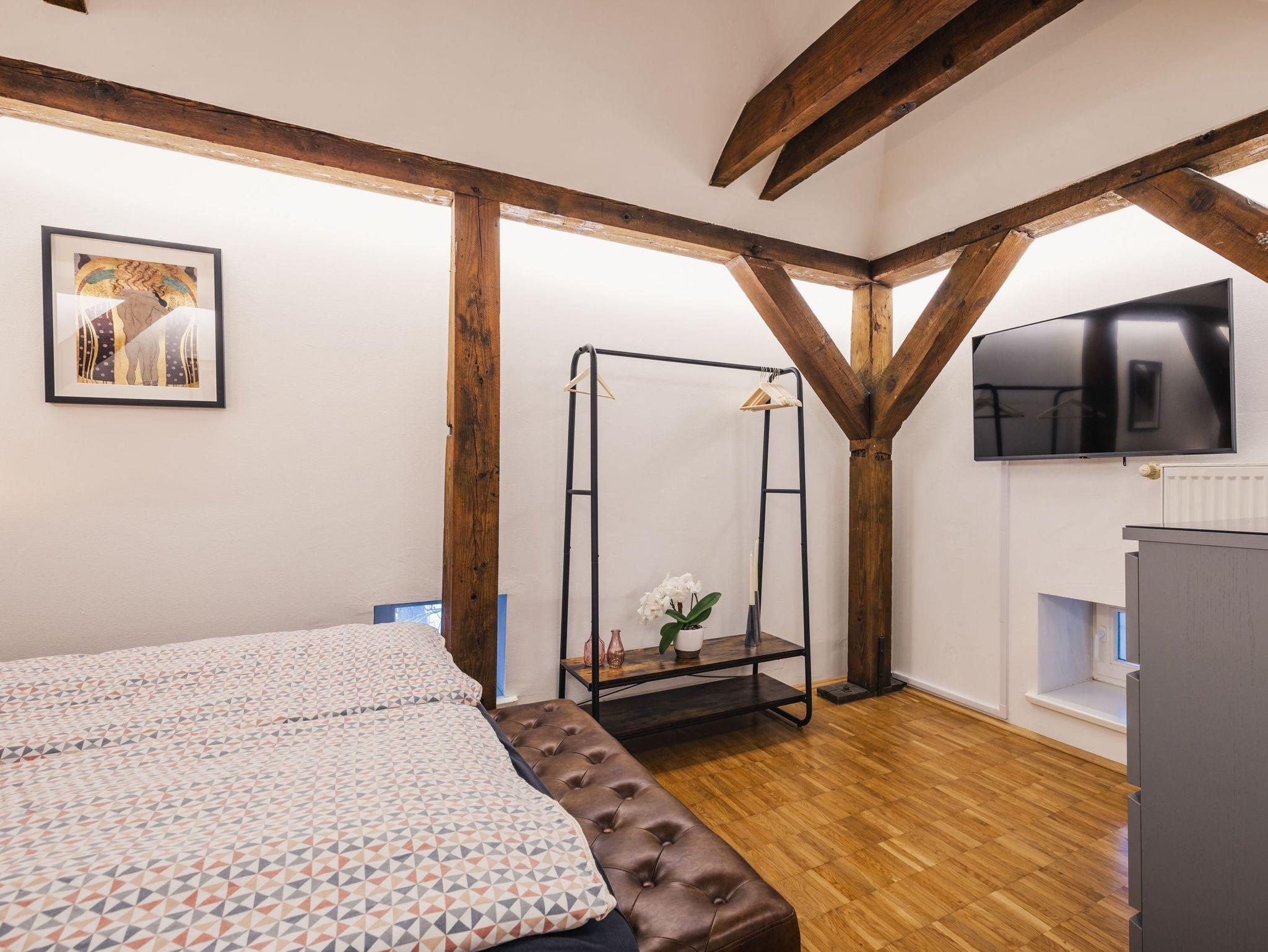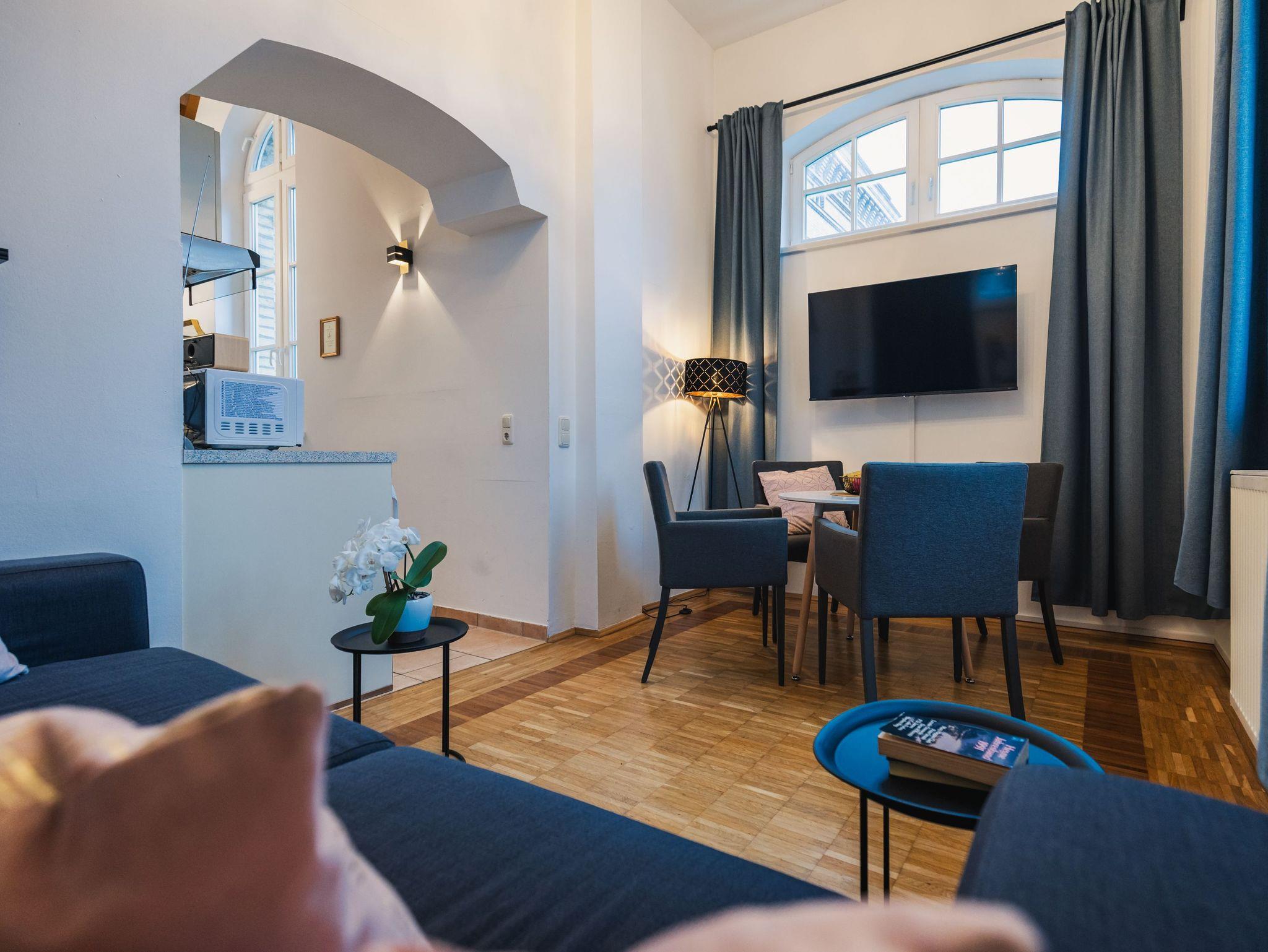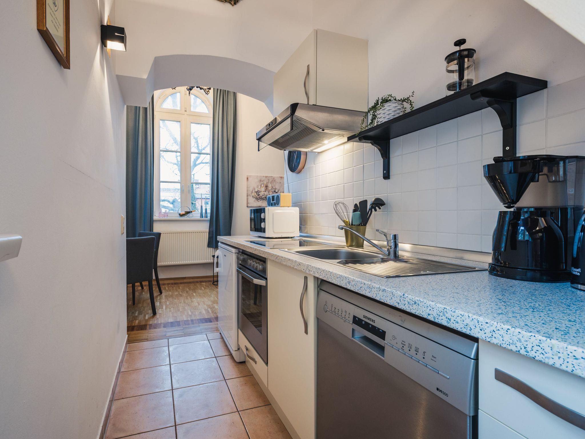 Modernes Maisonette-Studio im Herzen der Stralsunder Altstadt mit offener Küche und rustikalem Charme.