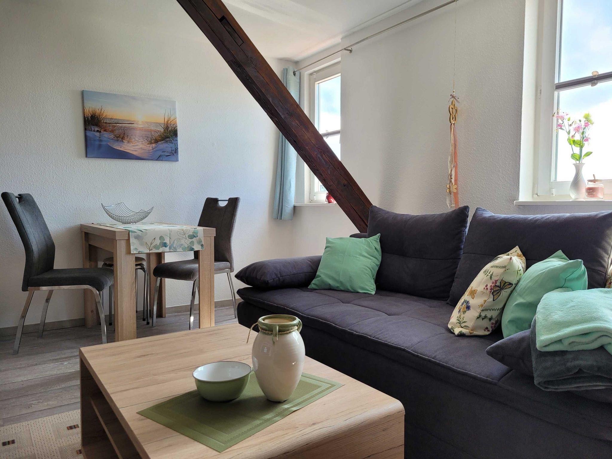 Gemütliche Dachgeschoss-Ferienwohnung mit Blick auf die Marienkirche in Stralsund, zentral und familienfreundlich gelegen.