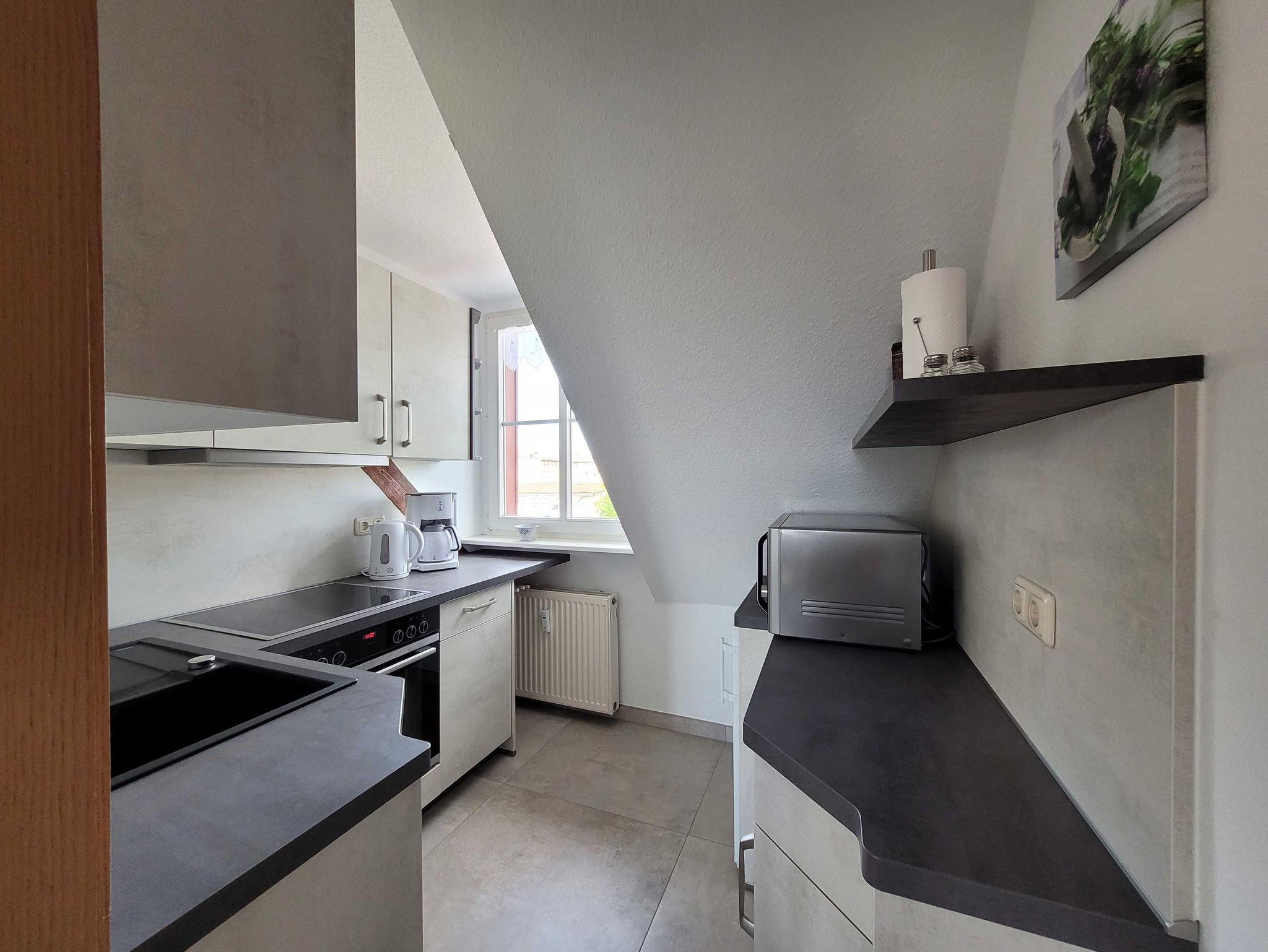 Die 40 qm große Dachgeschoss-Ferienwohnung befindet sich im 2. Obergeschoss eines Reihenhauses. Sie verfügt über eine voll ausgestattete Küche (z.B. Geschirrspüler, Mikrowelle, Herd), ein Bad mit Dusche/ WC sowie Waschmaschine und ein Schlafzimmer (Bett 1,80x2,00 mit getrennten Matratzen) mit großzügigem Kleiderschrank und Sitzgelegenheit. Das Wohnzimmer mit Blick zur Marienkirche und Schlafcouch (1,60x2,00) verfügt über eine Essgarnitur. Die Ferienwohnung ist für Paare und Familien mit bis zu einem Kind bis 16 Jahre geeignet.