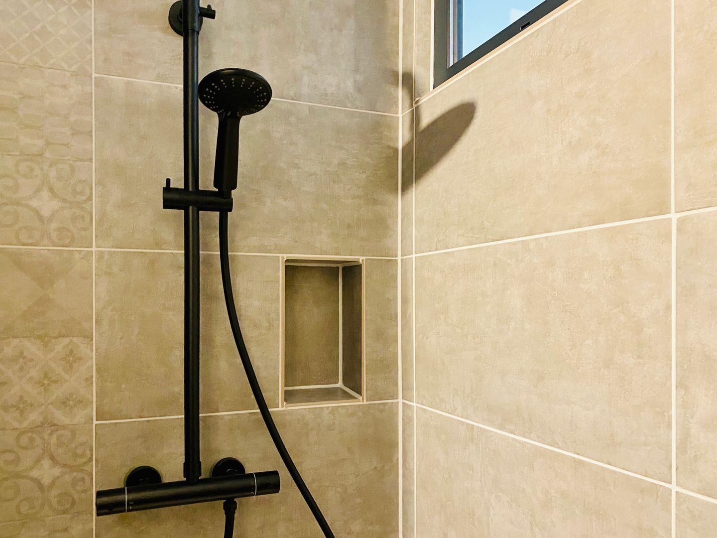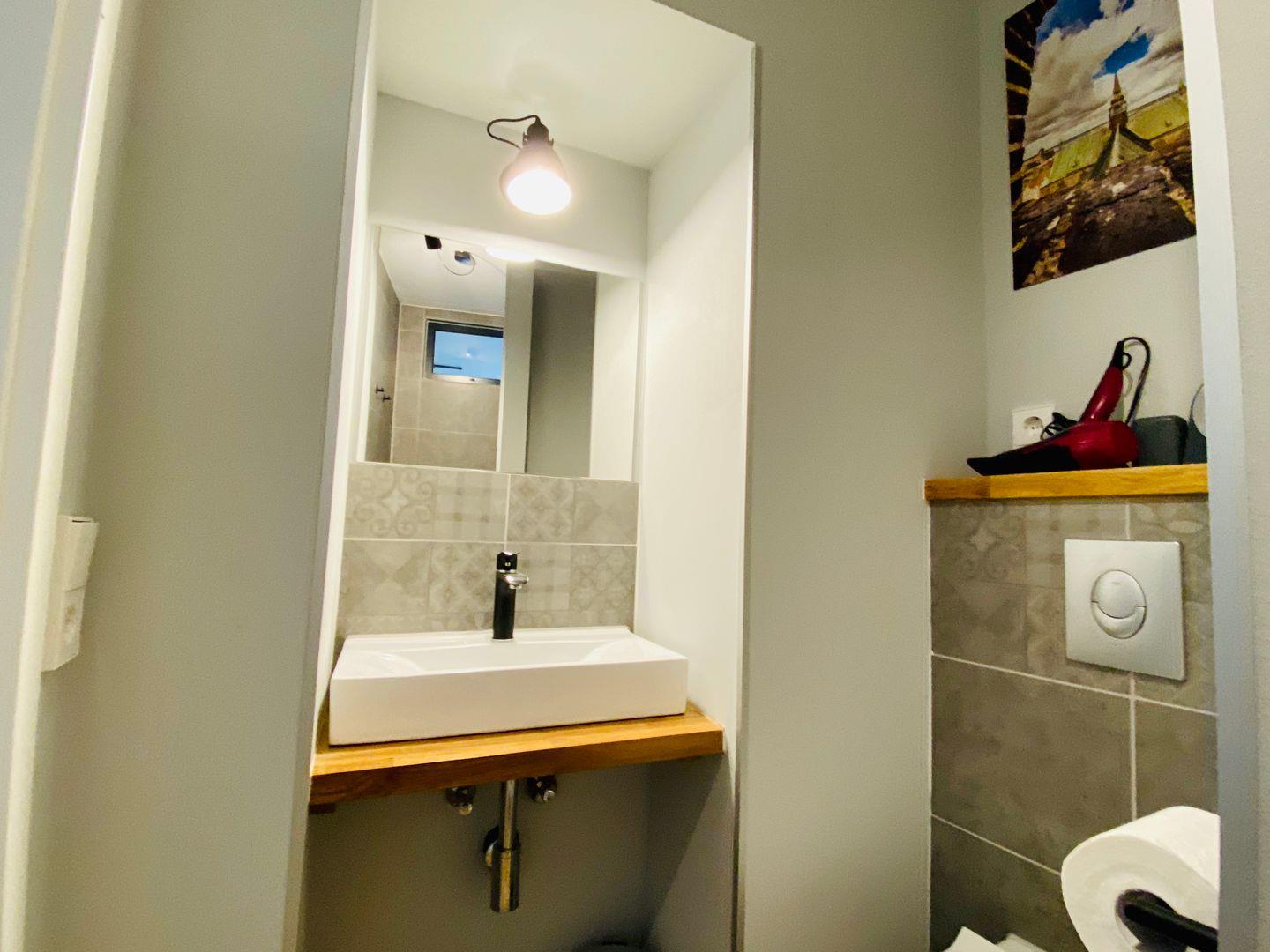 Das schicke Badezimmer verfügt neben ebenerdiger Regendusche, Waschtisch und WC über Föhn und Kosmetikspiegel und liegt direkt neben dem Schlafzimmer. Im Schlafzimmer befinden sich zwei Kommoden und eine große Kleiderstange mit genügend Platz für Gepäck von 2 Personen.