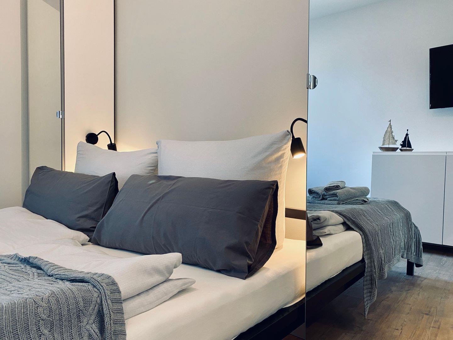 Das Bett ist zur Anreise bezogen und Handtuch-Sets liegen in der entsprechenden Anzahl der gebuchten Gäste bereit. Eine Erstausstattung an notwendigen Utensilien für die Küche ist ebenso vorhanden. WLAN ist kostenfrei in allen Räumen nutzbar.