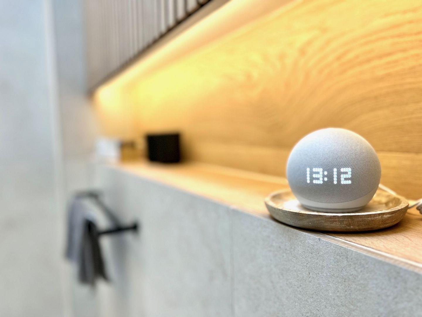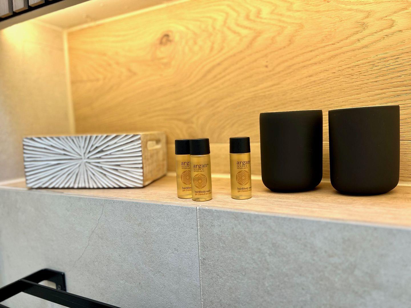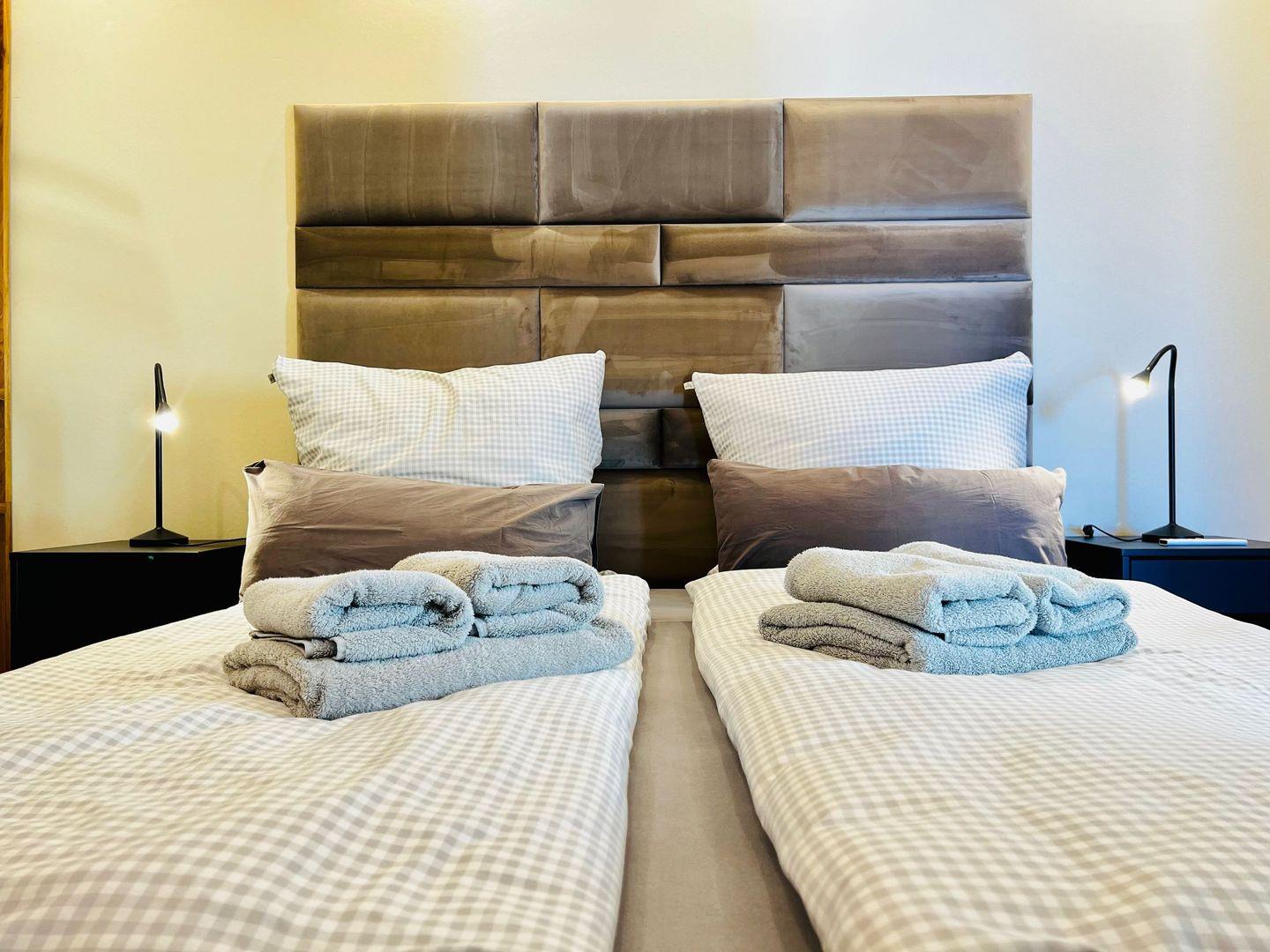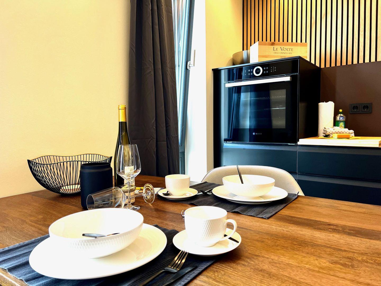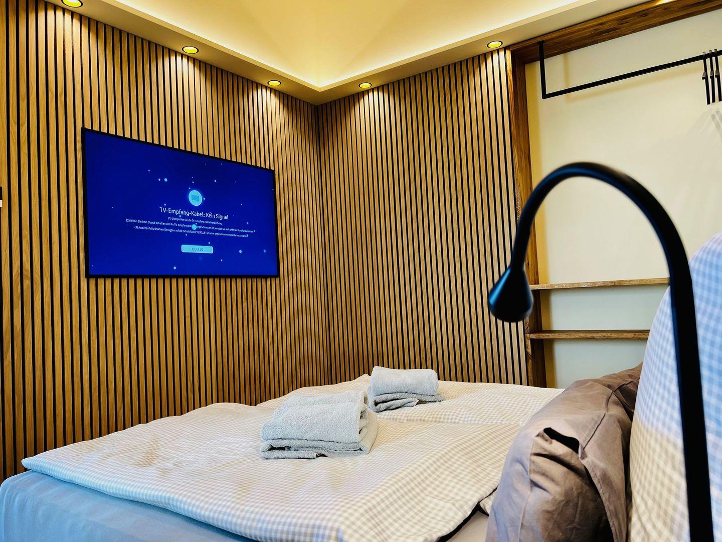 Das Badezimmer verfügt neben ebenerdiger Regendusche, Waschtisch und WC über Föhn und Kosmetikspiegel und liegt direkt neben dem Schlafzimmer. Im Schlafzimmer befinden sich zwei Kommoden und eine große Kleiderstange mit genügend Platz für Gepäck von 2 Personen. Nachttische, Nachttischlampen und ein großer TV sind im Schlafzimmer neben einem komfortablen Doppelbett vorhanden. Die Küche besticht mit einer sehr guten Ausstattung. Neben Nespresso-Kapselmaschine, Backofen, Geschirrspüler, 2-Feld-Induktionskochfeld, Kühlschrank mit Gefrierfach und Weinkühlschrank sind auch weitere Kleingeräte wie Wasserkocher und Toaster vorhanden. Für einen tollen Kochabend oder ein entspanntes Frühstück vor einem schönen Tagesausflug ist alles vorhanden. Eine Federkernmatratze sorgt auch bei einer Aufbettung im Wohnraum für den nötigen Schlafkomfort. Bücher, kostenfreies Internet, ein großer Flachbild-TV, Sofadecke und tolle Dekoration sorgen für einen angenehmen Aufenthalt.