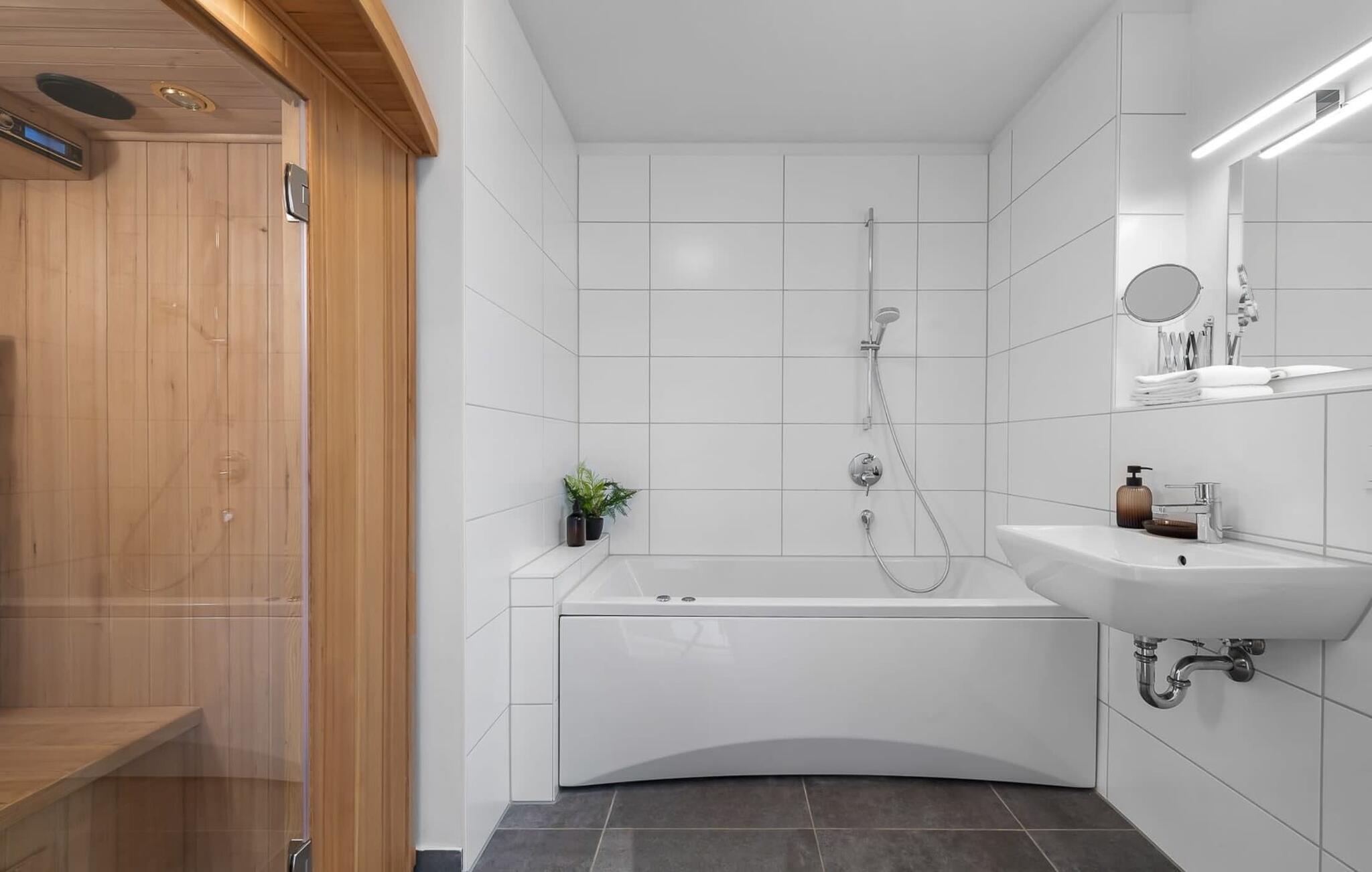 Das Badezimmer mit Wanne und einer Infrarot-Wärmekabine der Extraklasse sorgt für erholsame Wellnessmomente.