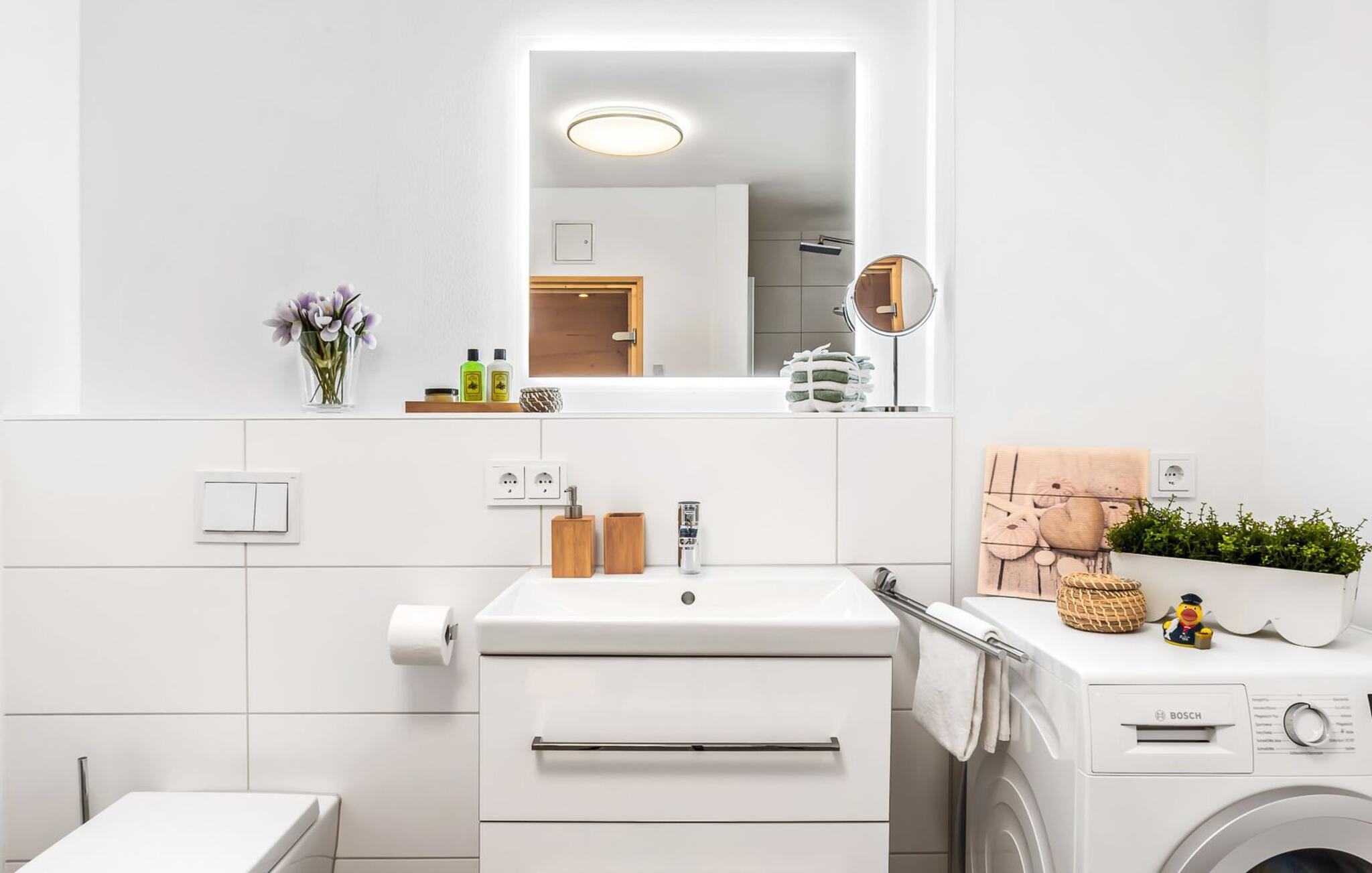 Das Wellnessbad mit der bodengleichen Regen-Dusche und der Infrarotsauna sorgt für einen rundum erholsamen Urlaub.