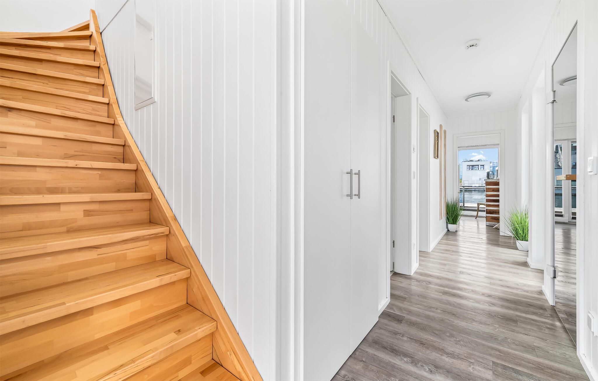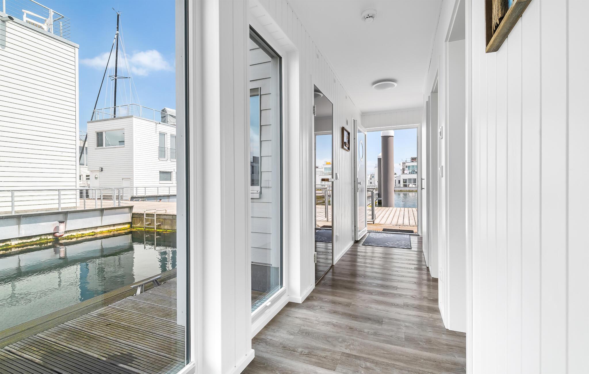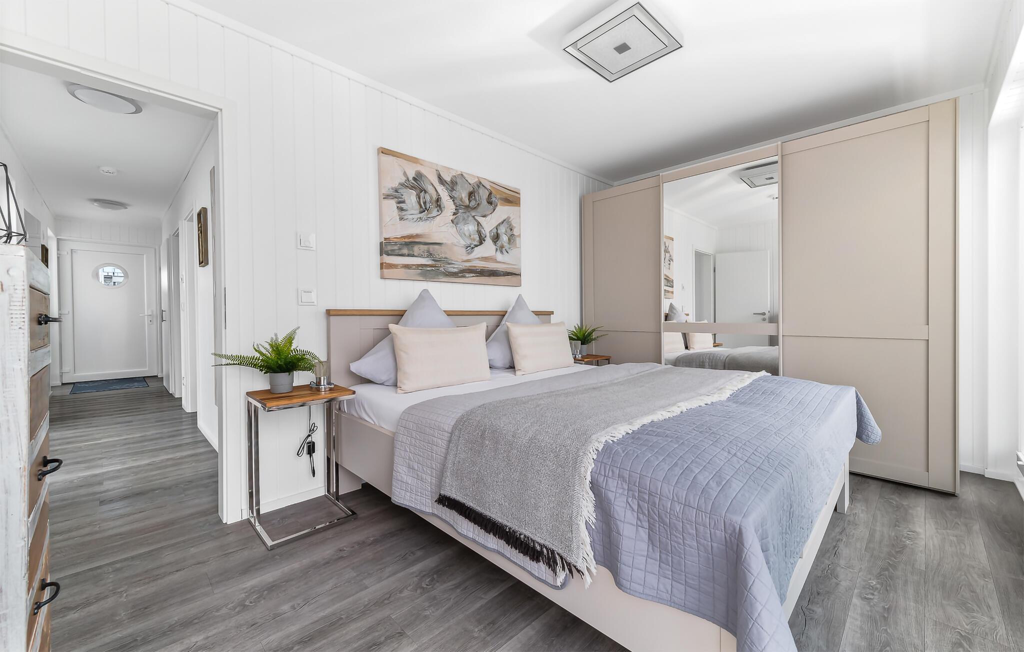 Das schwimmende Haus erstreckt sich über drei Ebenen, wobei das Obergeschoss mit einem offenen Wohn- und Essbereich punktet. Die voll ausgestattete Wohnküche und die angrenzende Terrasse bieten nicht nur kulinarische Freuden, sondern auch einen beeindruckenden Wasserblick. Von hier aus führt der Weg zur spektakulären Dachterrasse, ausgestattet mit hochwertigen Möbeln und einem Weber Elektrogrill, der ideale Ort, um das Urlaubsgefühl zu zelebrieren und atemberaubende Sonnenuntergänge zu erleben.