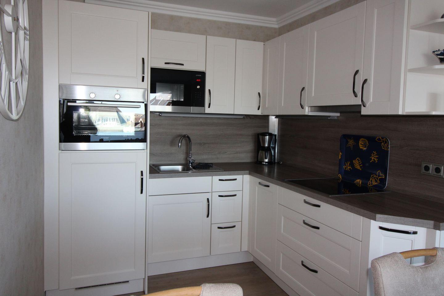 • Küchenzeile: Voll ausgestattet mit Geschirrspüler, Kochfeld, Mikrowelle, Backoffen, Kühlschrank mit Gefrierfach