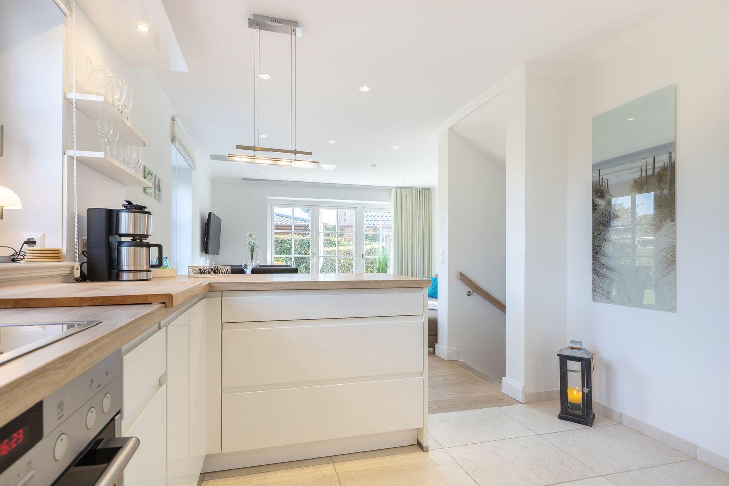 - offener Küchenbereich mit Tresen, Herd mit Ceranfeld, Geschirrspüler, Mikrowelle, Bosch Padmaschine und Filterkaffeemaschine