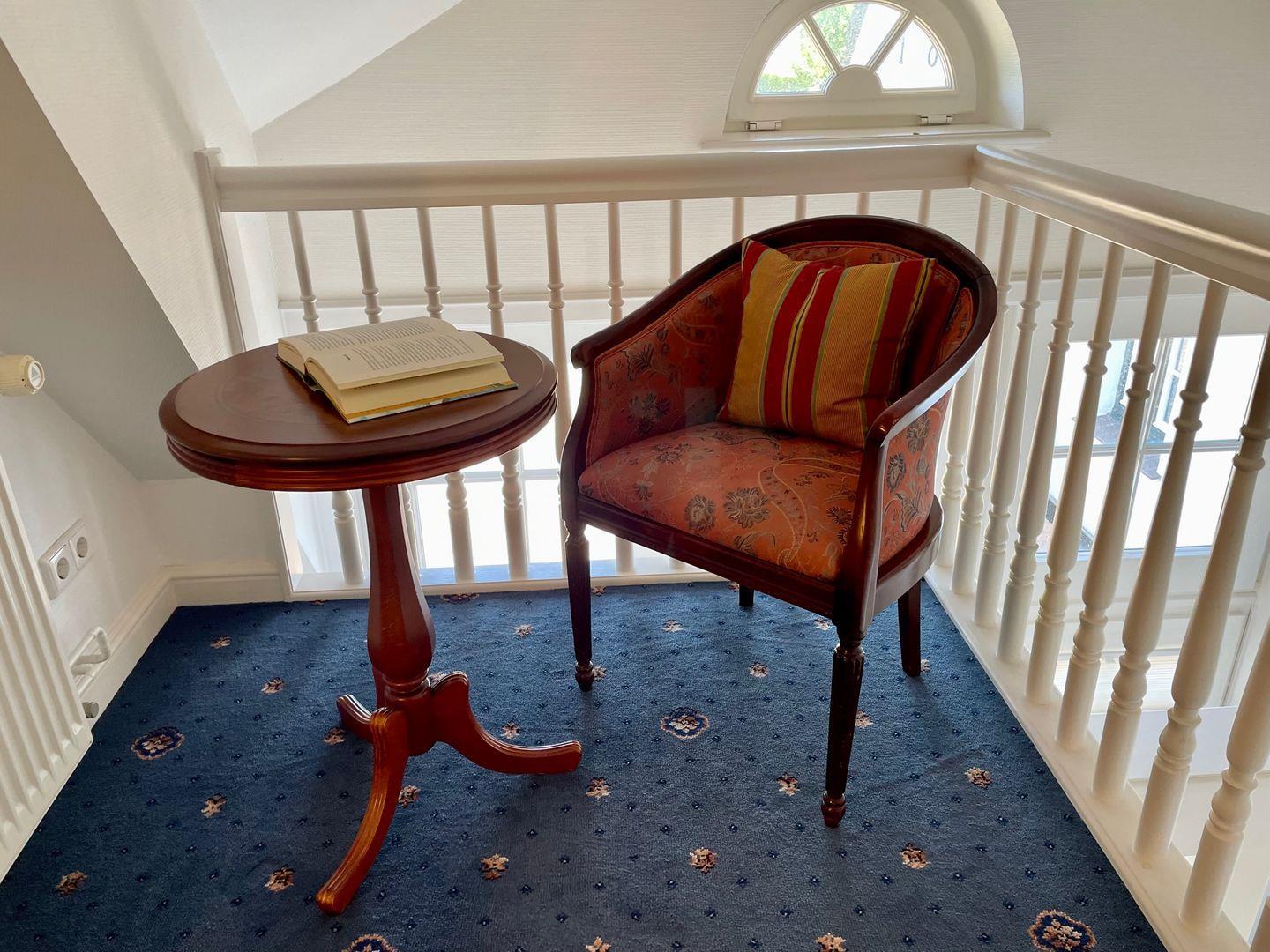 Auf der Empore in der zweiten Ebene steht ein kleiner Sitzbereich bereit. Hier können Sie sich zum Lesen oder zum Schreiben einiger Postkarten an die Daheimgebliebenen zurückziehen.