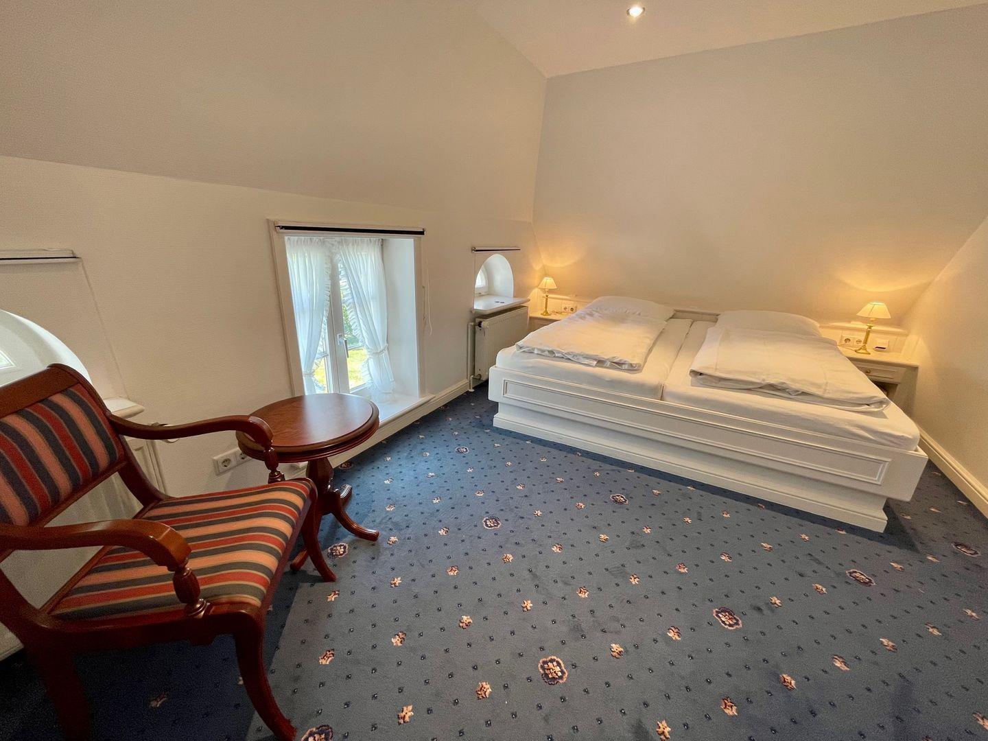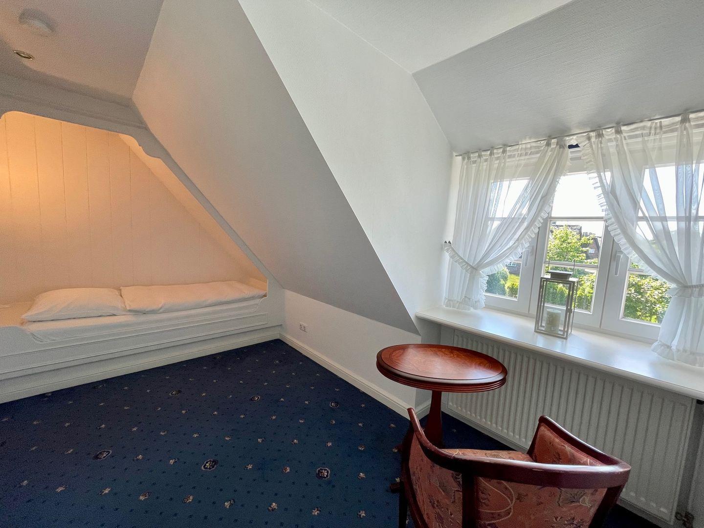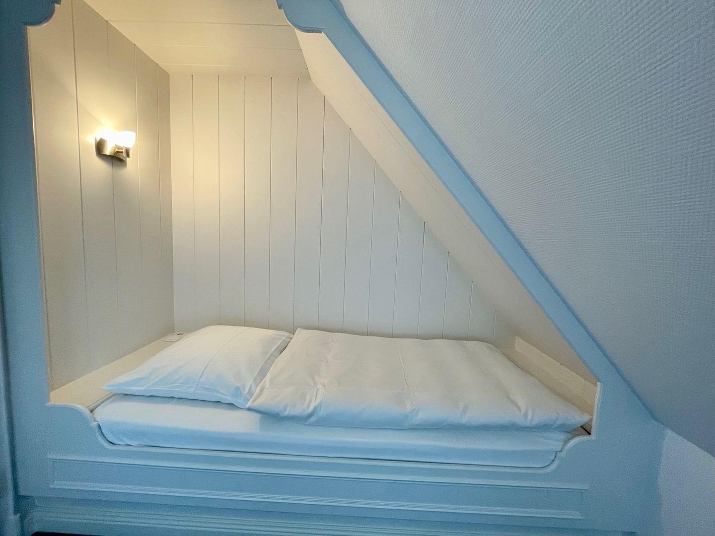 Das ebenfalls im oberen Bereich gelegene Schlafzimmer verfügt über ein Doppelbett. Eine zusätzliche Schlafmöglichkeit befindet sich im zweiten Schlafraum. Das Einzelbett wurde in die Schräge eingepasst und eignet sich daher ideal als gemütlicher Rückzugsort. Abgerundet wird die Wohnung 2. "Jan" durch das hell geflieste Duschbad. Handtuchheizkörper, beleuchteter Spiegel und Glasduschkabine sorgen auch hier für Komfort.