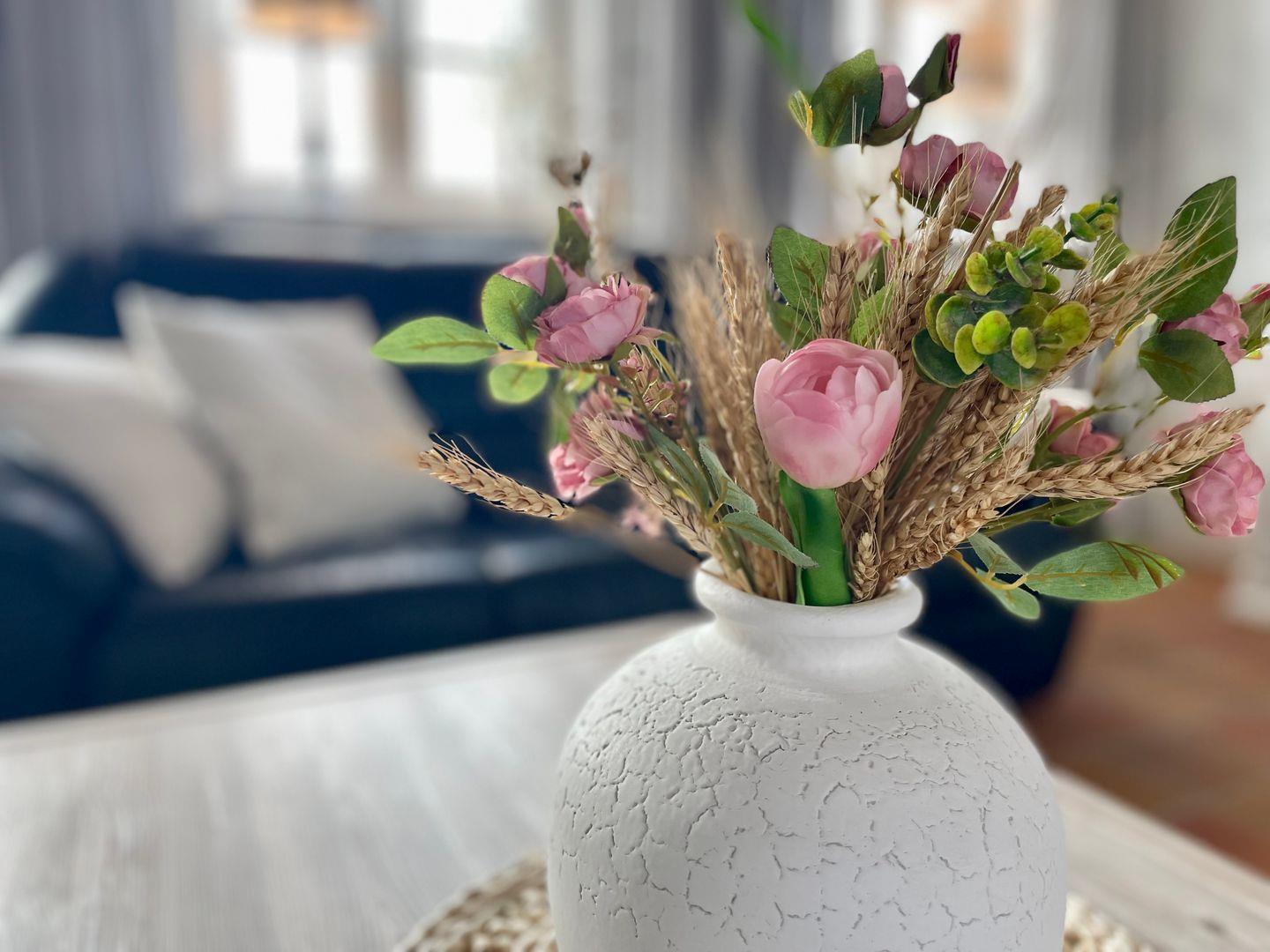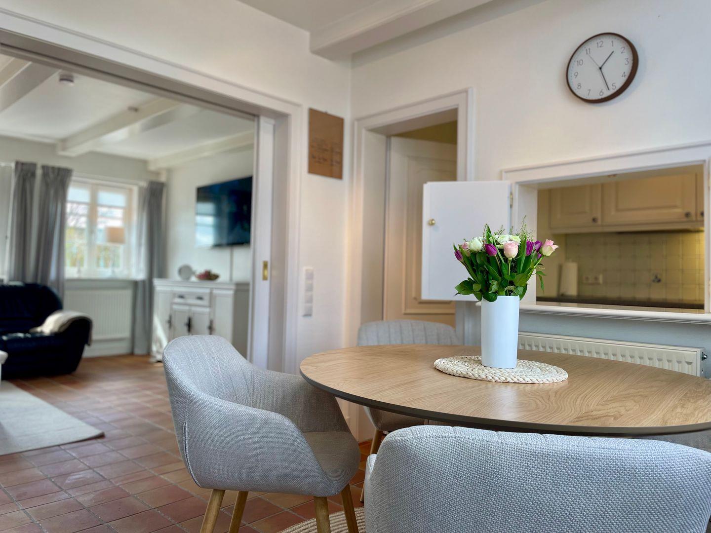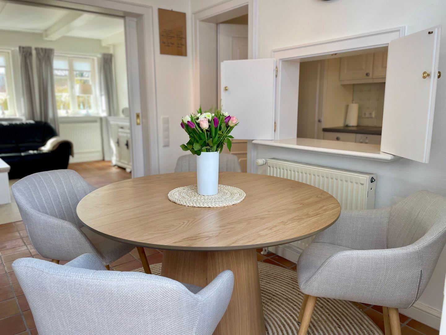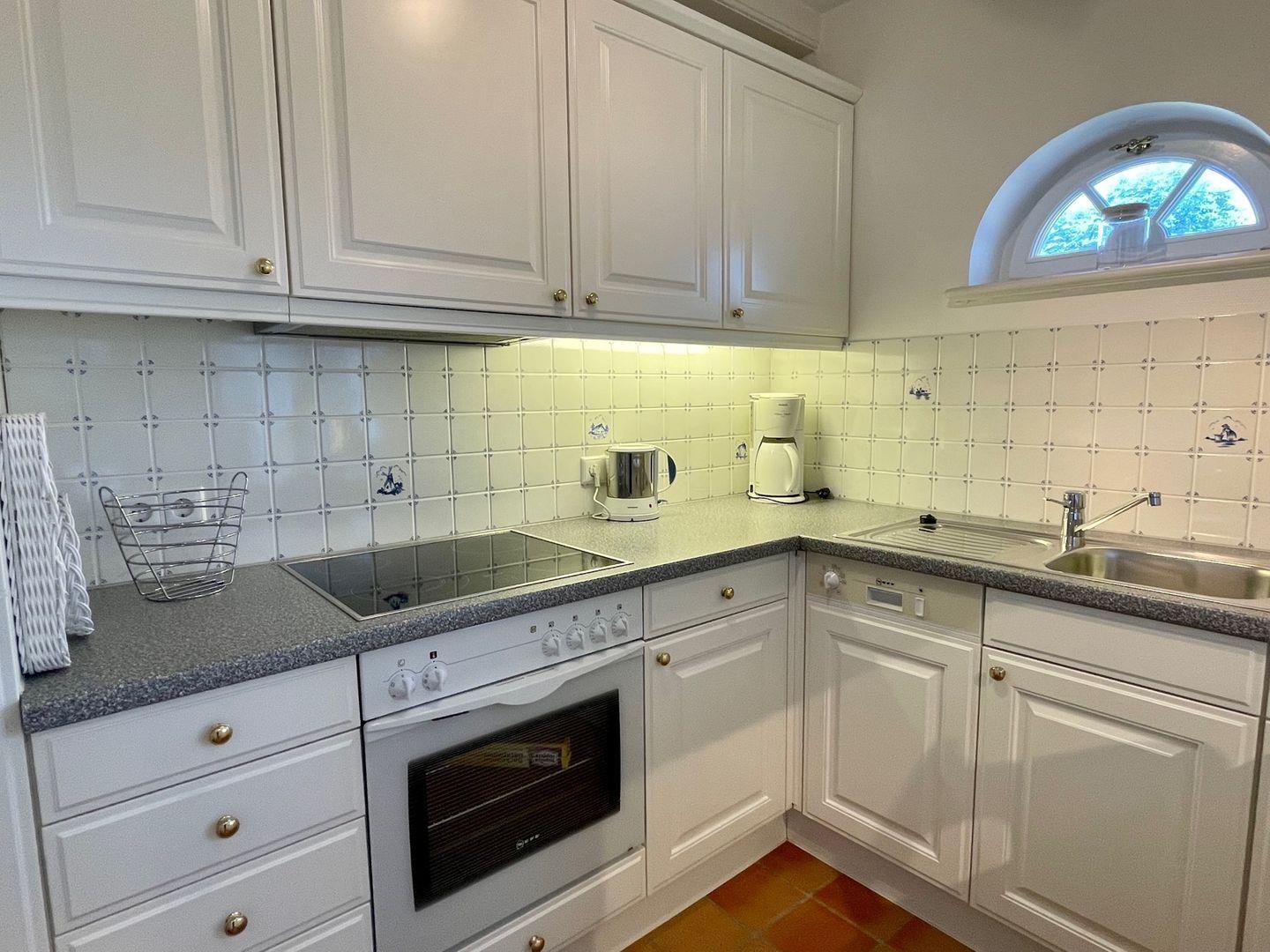 Direkt nebenan erwartet Sie die kleine, aber sehr fein ausgestattete Küche im Landhausstil. Helle Fronten und eine praktische Durchreiche sorgen für ein luftiges Gefühl beim Kochen. Durch die separate Lage der Küche lässt sich diese bei Bedarf aber auch komplett verschließen.