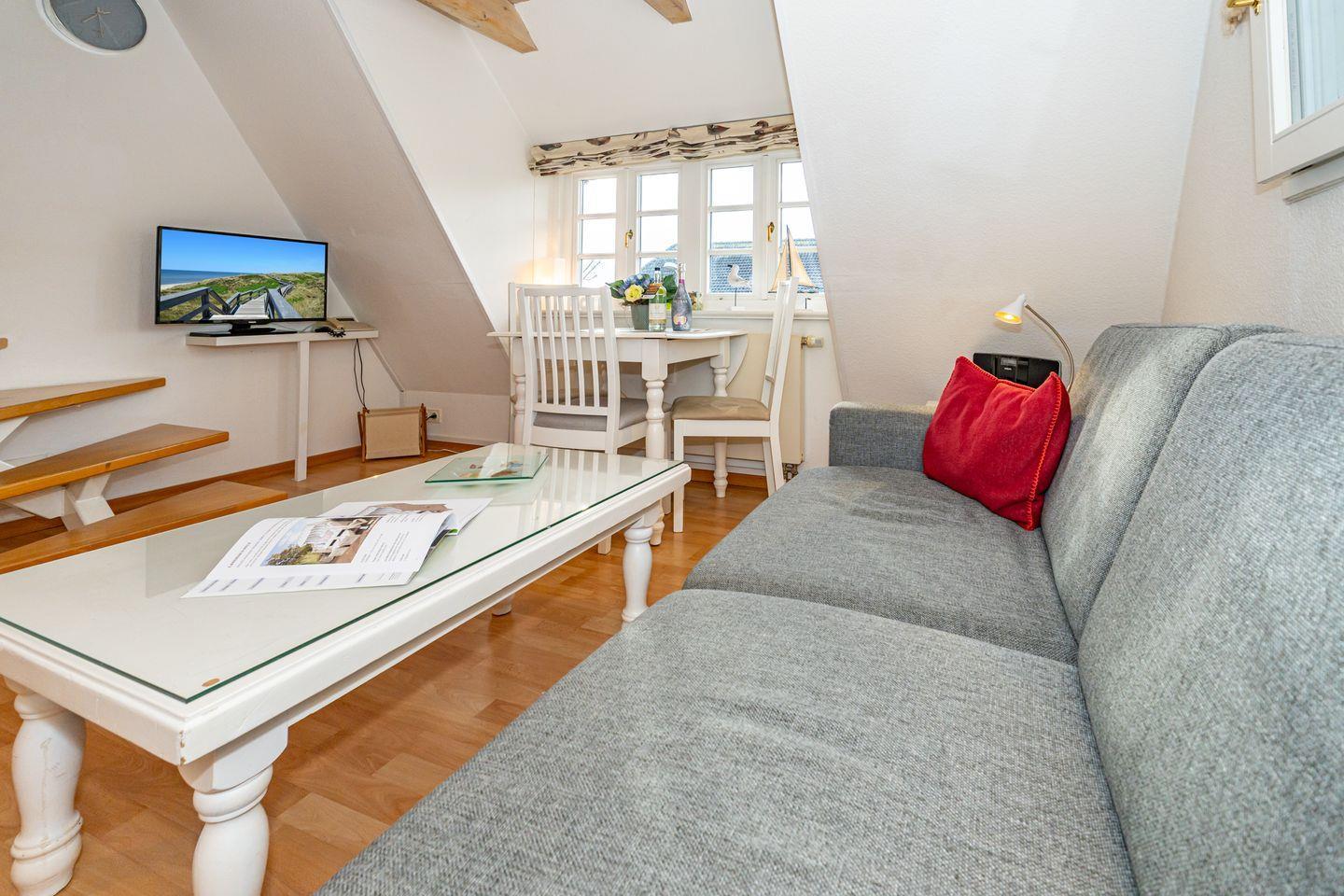 Gemütliche Ferienwohnung unter Reet in Westerland auf Sylt, ideal für zwei Personen mit moderner Ausstattung und eigenem Parkplatz.