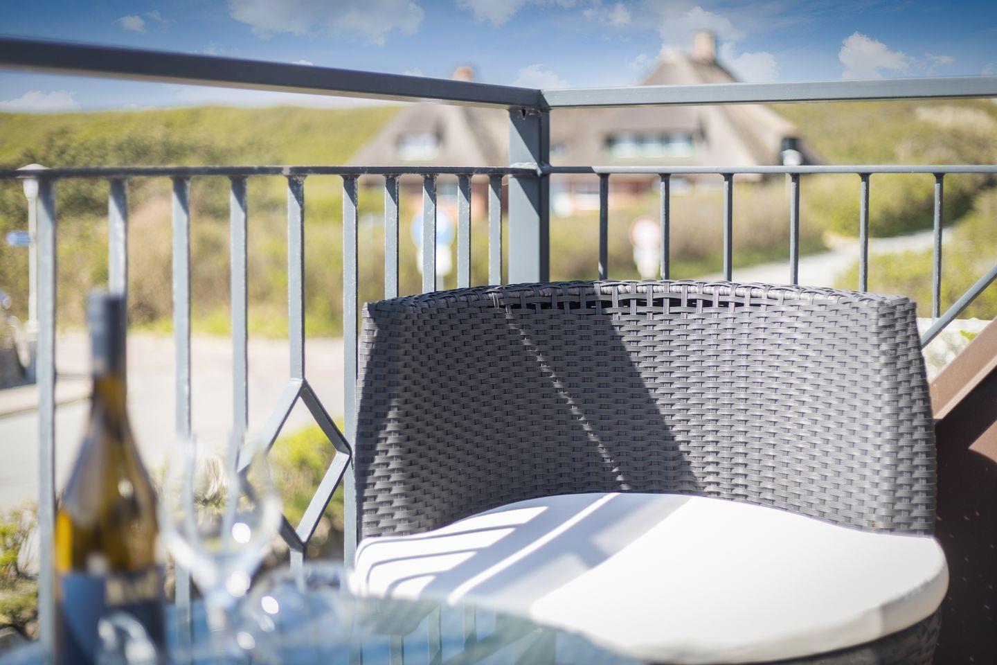 Im Obergeschoss der Wohnung Hooge befindet sich der Wohnraum mit Couchbereich, 3D Flatscreen-TV und Essbereich. Von hier aus gelangen Sie auf Ihren Balkon, der von April bis Oktober mit Gartenmöbeln möbliert ist. Die Küchenzeile ist mit Backofen, Mikrowelle, Spülmaschine und Nespresso-Kaffeemaschine top ausgestattet, sodass es Ihnen an nichts fehlen wird. Auf der gleichen Etage befindet sich ein Tageslichtbad mit Badewanne, Dusche und WC.