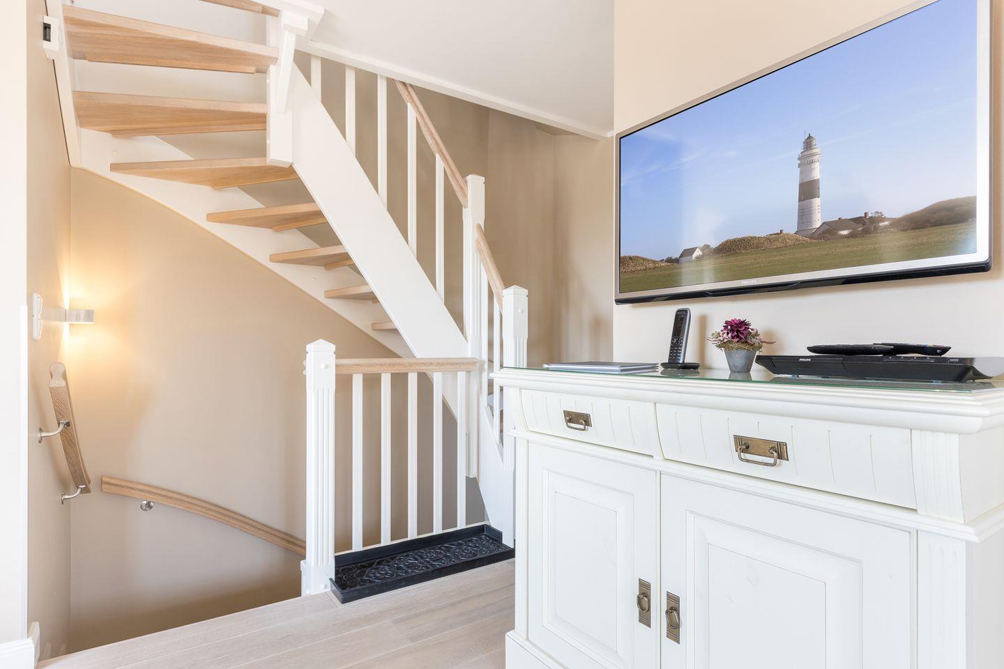 Obergeschoss: Wohnraum mit Phillips TV 3D, Radio, iPod Docking Station, Telefon und W-LAN, offene Küche mit Mikrowelle, Backofen, Spülmaschine, Filterkaffeemaschine und Nespressomaschine, Tageslichtbad mit Badewanne, Dusche und WC