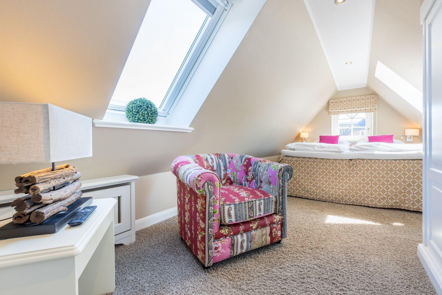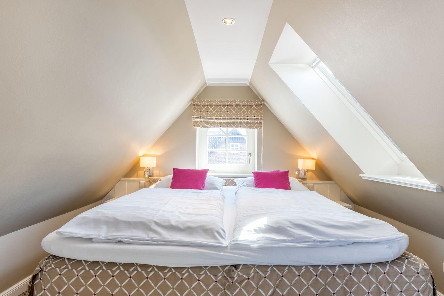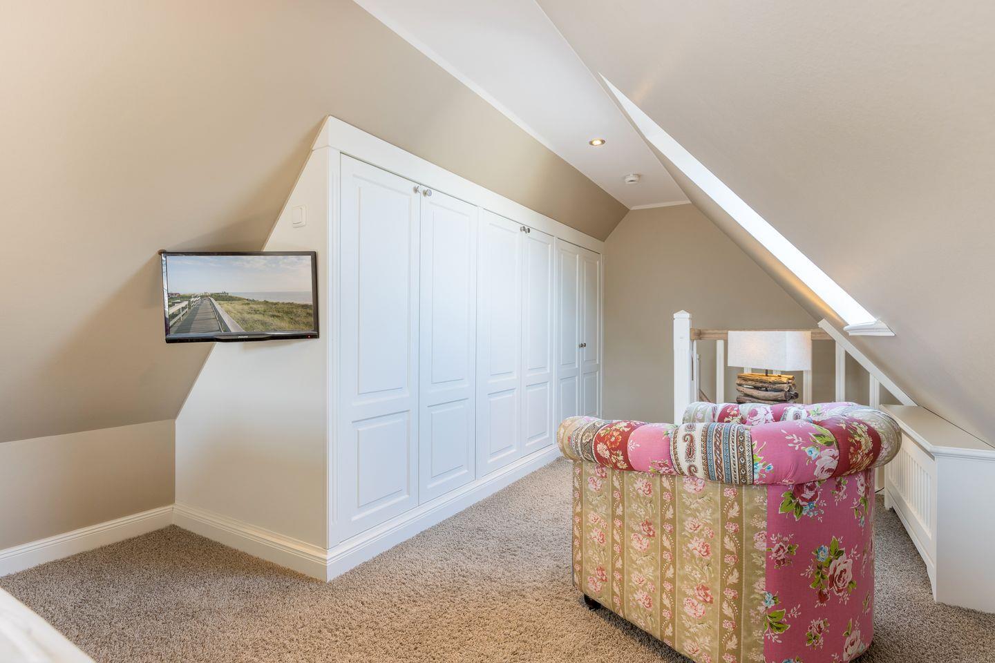 Dachgeschoss: ein Raum mit Boxspring-Doppelbett (180x200cm-Matratzen getrennt) und Flatscreen-TV