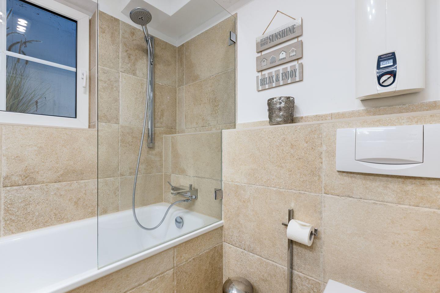 Duschbad mit schicken Natursteinfliesen. Eine einzigartige Ferienwohnung für den Urlaub zu zweit.