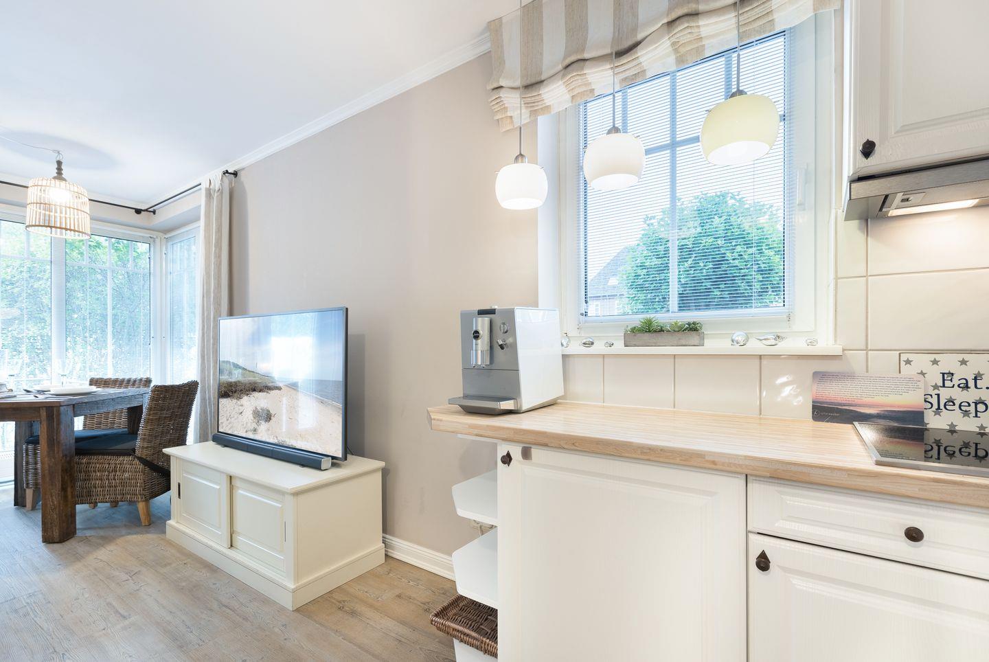 EG: Wohnraum mit Flatscreen-TV; offener Ess- und Küchenbereich mit Geschirrspüler und Kaffeevollautomat;