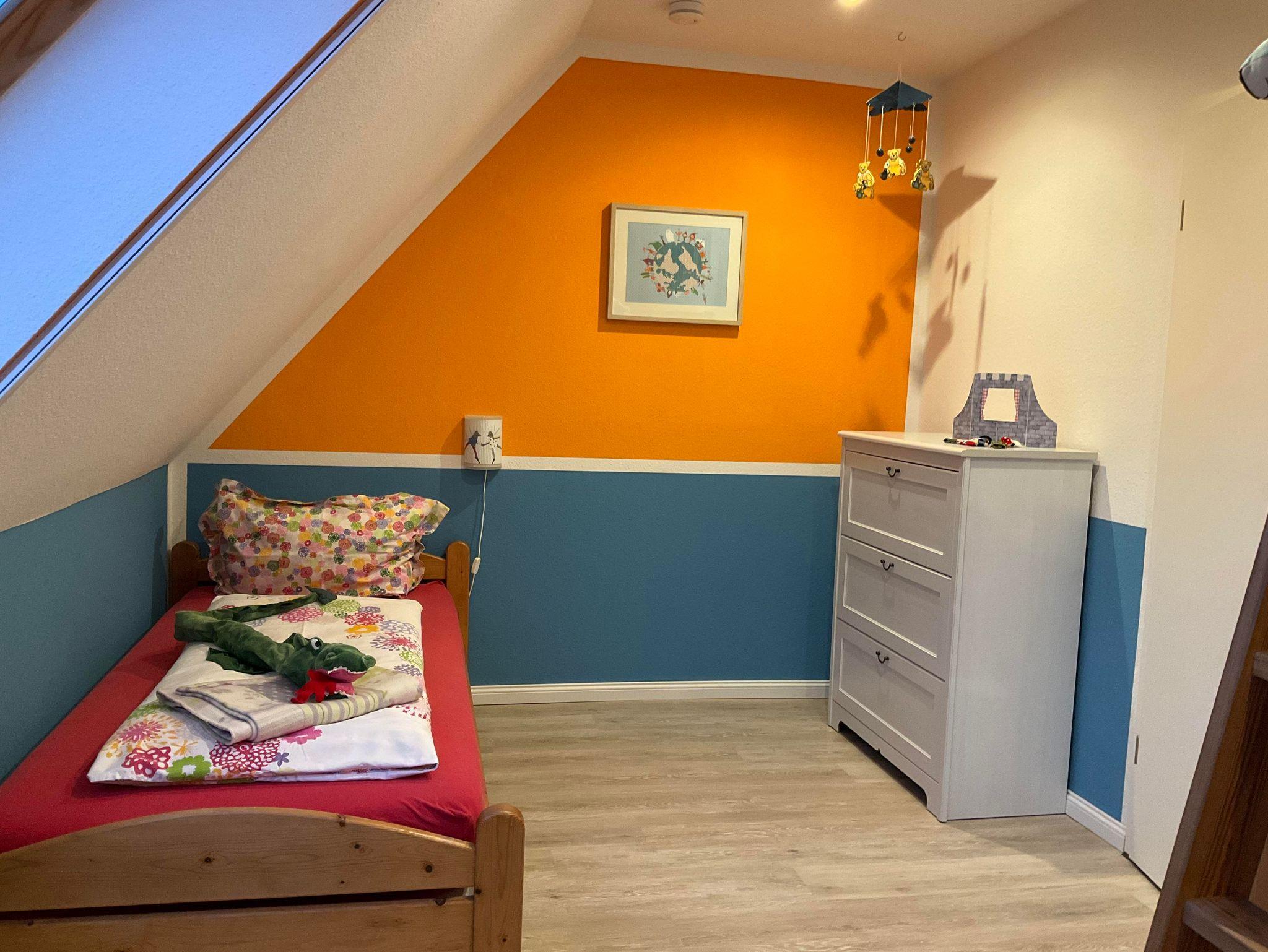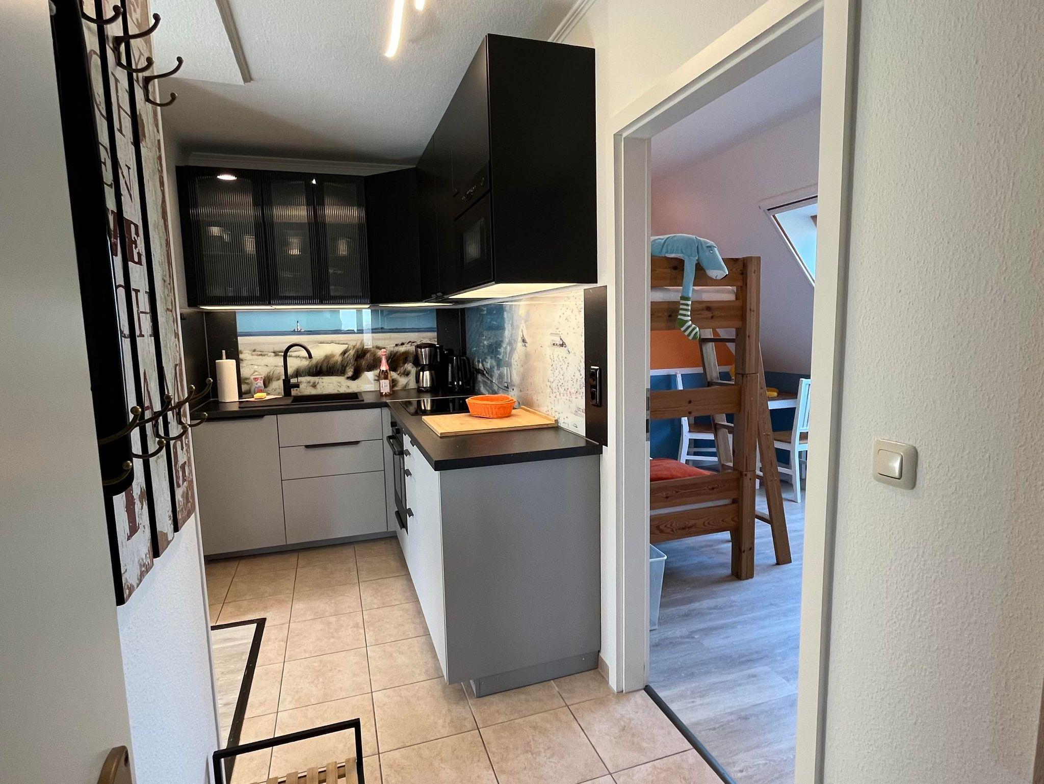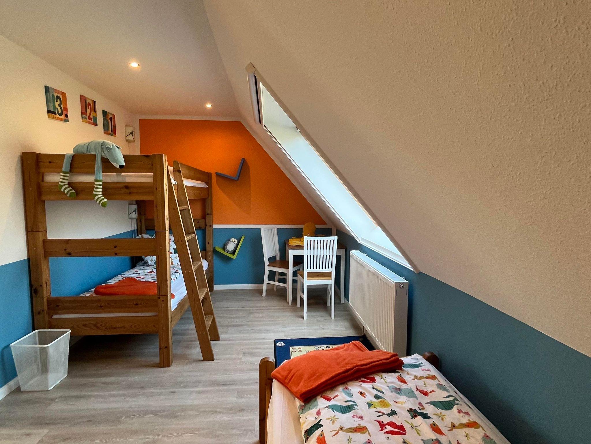 Ferienwohnung Wattenmeer für bis zu 5 Personen im Obergeschoss Die Wohnung verfügt über zwei Schlafräume, ein Schlafraum für 3 Personen mit einem Einzelbett und Stockbetten, Bettdecken 140 x 200 cm (Kinderzimmer) befindet sich im Obergeschoss, ein Schlafraum für 2 Personen mit Doppelbett, Bettdecken in Übergröße 155 x 220 cm (Eltern) befindet sich im Dachgeschoss, Bad mit Dusche und WC, die Küche ist im Wohnraum und ist komplett mit einer Geschirrspülmaschine Cerankochfeld, Backofen, Mixer, Toaster, Kaffeemaschine, Wasserkocher, Eierkocher, Kühl-/Gefrierschrank und Mikrowelle ausgestattet. Alle Betten sind 90 x 200 cm groß. Fernseher, kleine Musikanlage. Handtücher und Geschirrtücher bitte mitbringen.