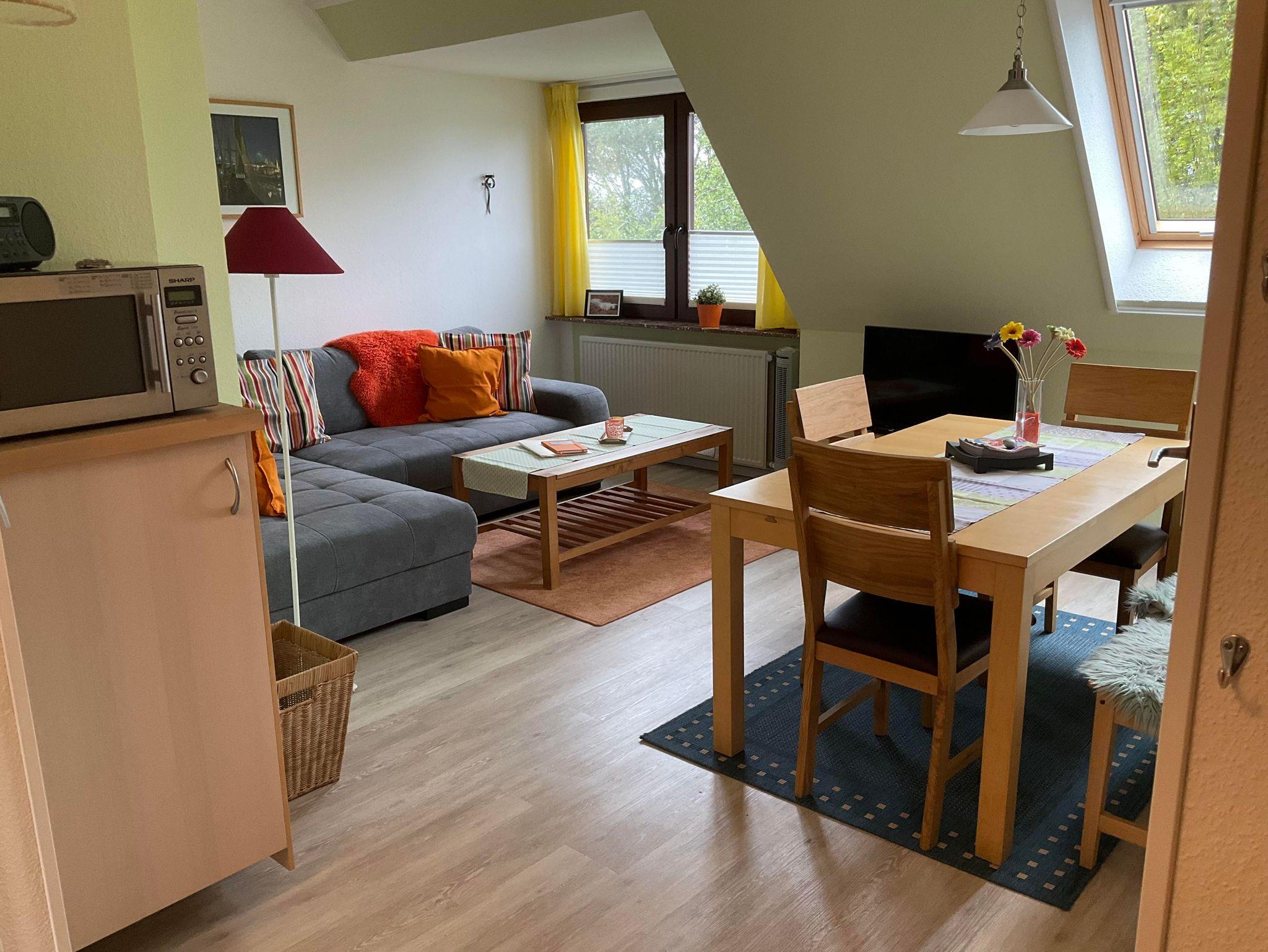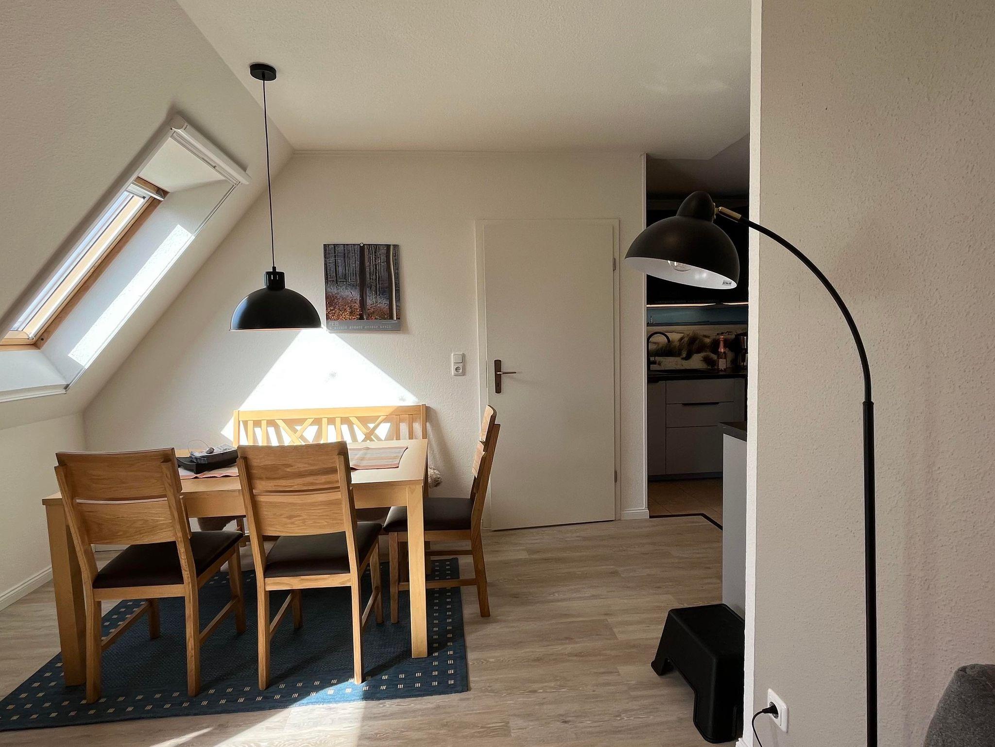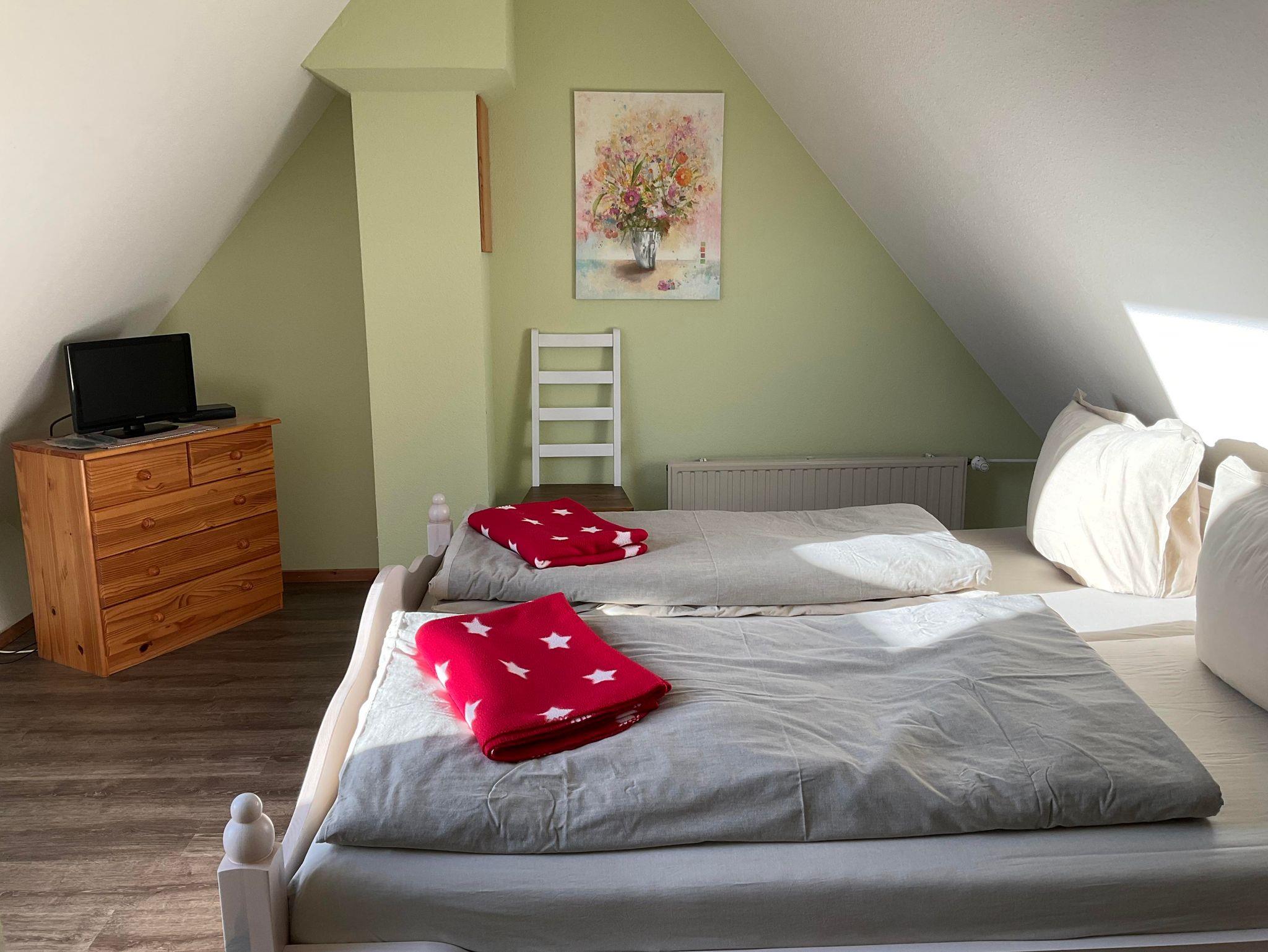 Ferienwohnung Wattenmeer für bis zu 5 Personen im Obergeschoss Die Wohnung verfügt über zwei Schlafräume, ein Schlafraum für 3 Personen mit einem Einzelbett und Stockbetten, Bettdecken 140 x 200 cm (Kinderzimmer) befindet sich im Obergeschoss, ein Schlafraum für 2 Personen mit Doppelbett, Bettdecken in Übergröße 155 x 220 cm (Eltern) befindet sich im Dachgeschoss, Bad mit Dusche und WC, die Küche ist im Wohnraum und ist komplett mit einer Geschirrspülmaschine Cerankochfeld, Backofen, Mixer, Toaster, Kaffeemaschine, Wasserkocher, Eierkocher, Kühl-/Gefrierschrank und Mikrowelle ausgestattet. Alle Betten sind 90 x 200 cm groß. Fernseher, kleine Musikanlage. Handtücher und Geschirrtücher bitte mitbringen.