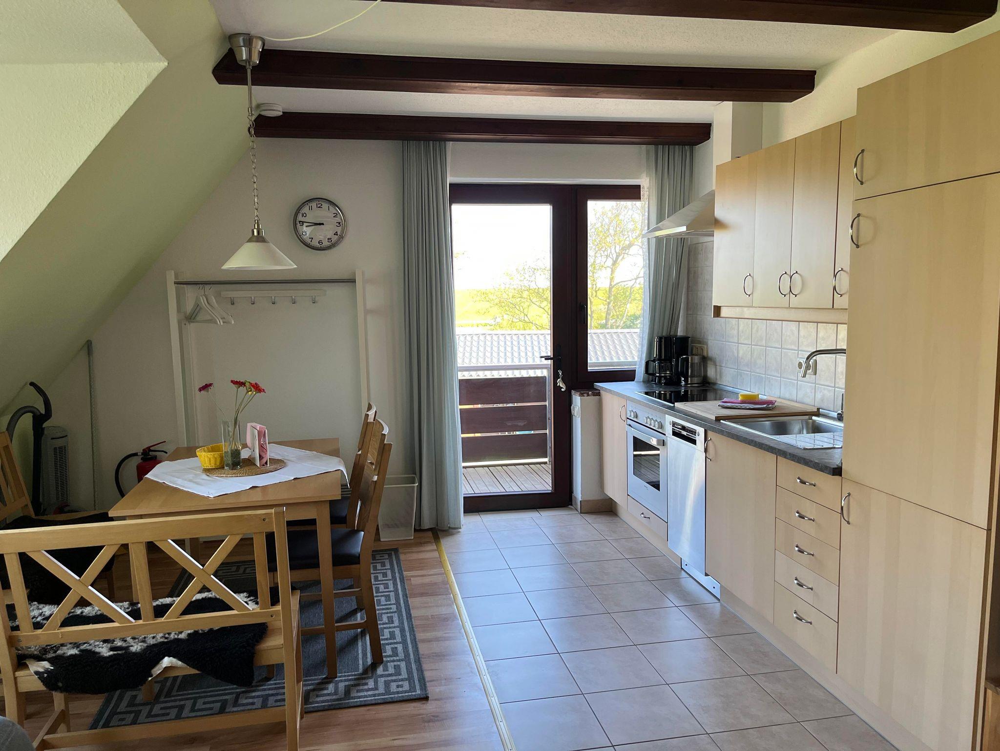Ferienwohnung Heverstrom für bis zu 5 Personen im Obergeschoss Der Zugang zur Wohnung ist auf der Nordseite über einen kleinen Balkon. In der Wohnküche, die komplett mit einer Geschirrspülmaschine, Cerankochfeld, Backofen, Mixer, Toaster, Kaffeemaschine, Wasserkocher, Eierkocher, Kühl-/Gefrierschrank ausgestattet ist, befindet sich zusätzlich ein Kamin, für den auch Brennholz bereit liegt. Die Wohnung verfügt über zwei Schlafräume, ein Schlafraum für 3 Personen mit einem Einzelbett und Stockbetten, Bettdecken 140 x 200 cm (Kinderzimmer) befindet sich im Obergeschoss, ein Schlafraum für 2 Personen mit Doppelbett, Bettdecken in Übergröße 155 x 220 cm (Eltern) befindet sich im Dachgeschoss. Bad mit Dusche und WC. Alle Betten sind 90 x 200 cm groß. Fernseher, kleine Musikanlage. Handtücher und Geschirrtücher bitte mitbringen. Keine Kurtaxe im Tümlauer-Koog