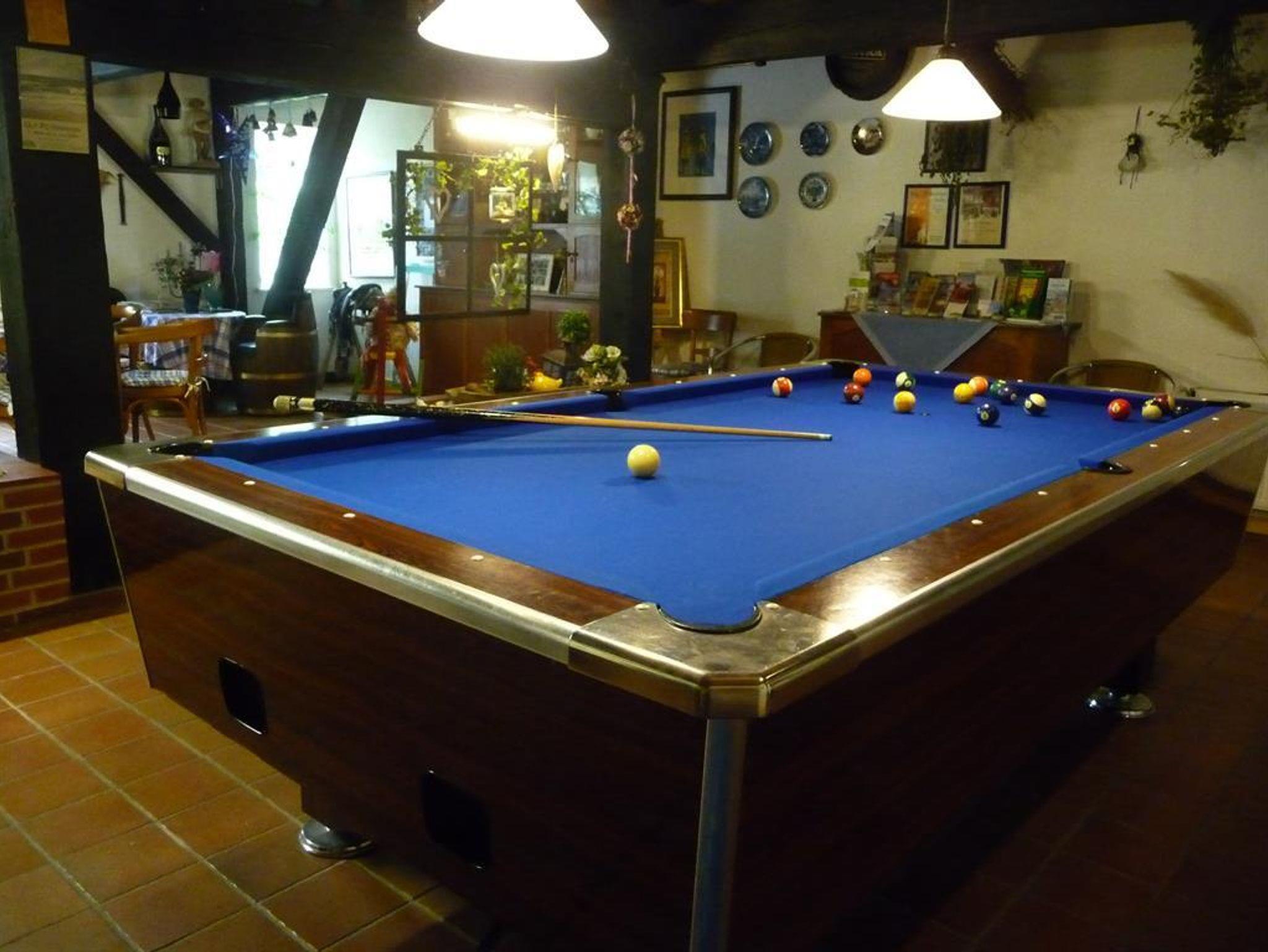 Der Mittelpunkt des Aufenthaltraumes ist der Billardtisch. Die Möbel sind aus einem alten Kirchspielkrug. Hier können Sie gemeinsam Fernsehen schauen. Über eine bequeme und breite Treppe gelangen Sie in das Obergeschoss. Die Galerie ist als Spielzimmer eingerichtet. Hier kommt bestimmt keine Langeweile auf. Wer gerne lesen möchte, findet hier eine große Auswahl an Kinderbüchern, Romanen und Krimis.