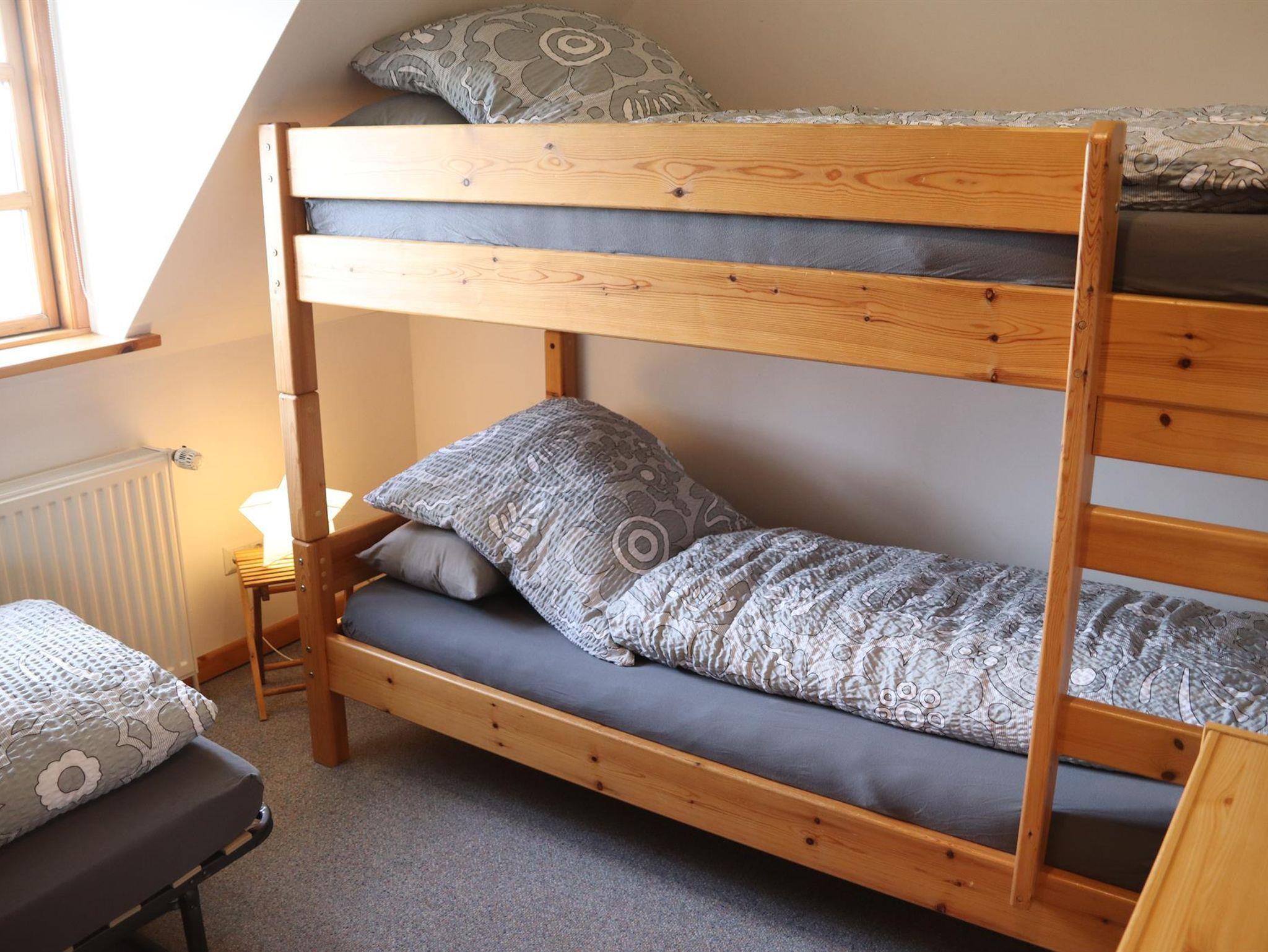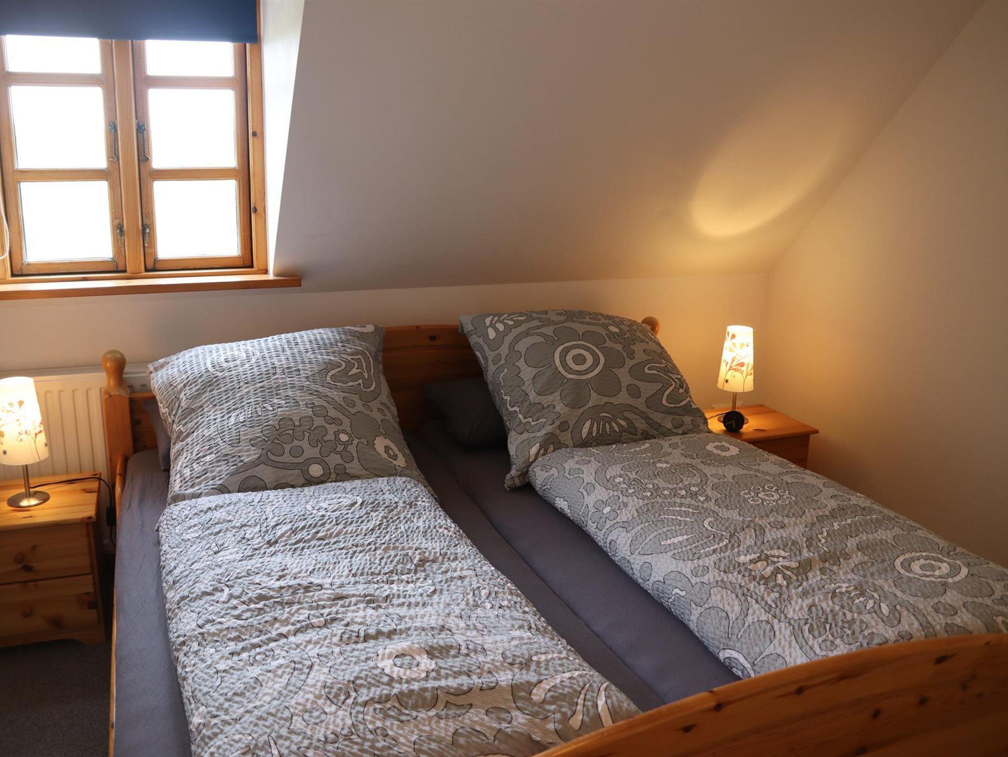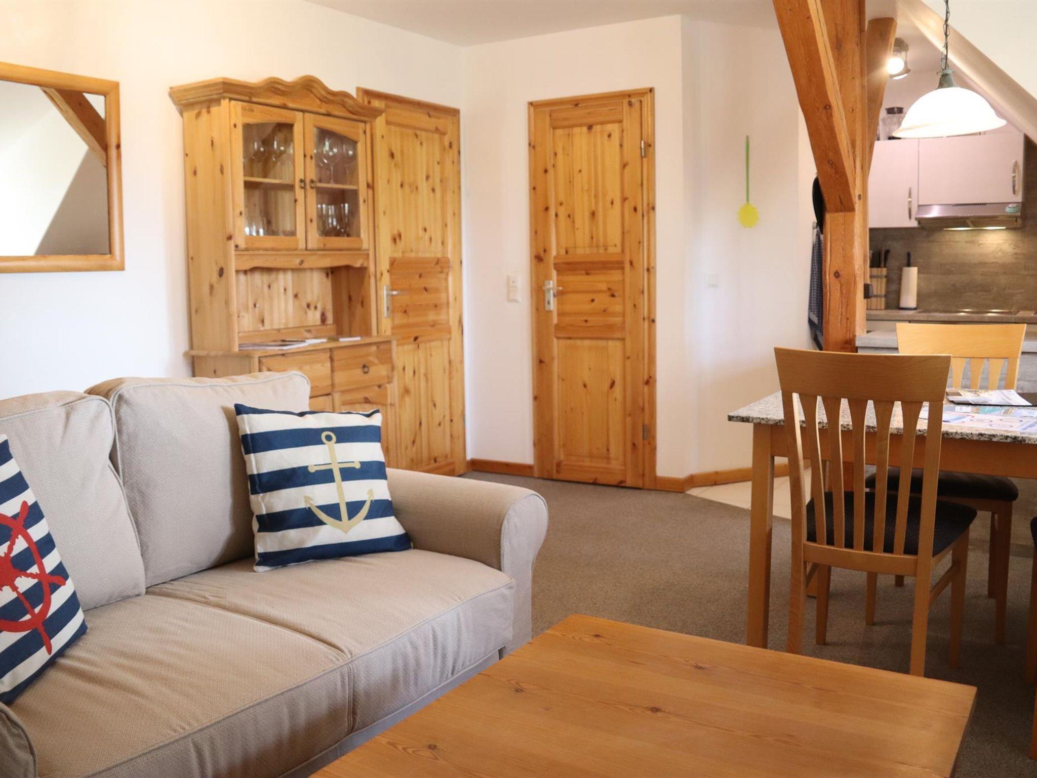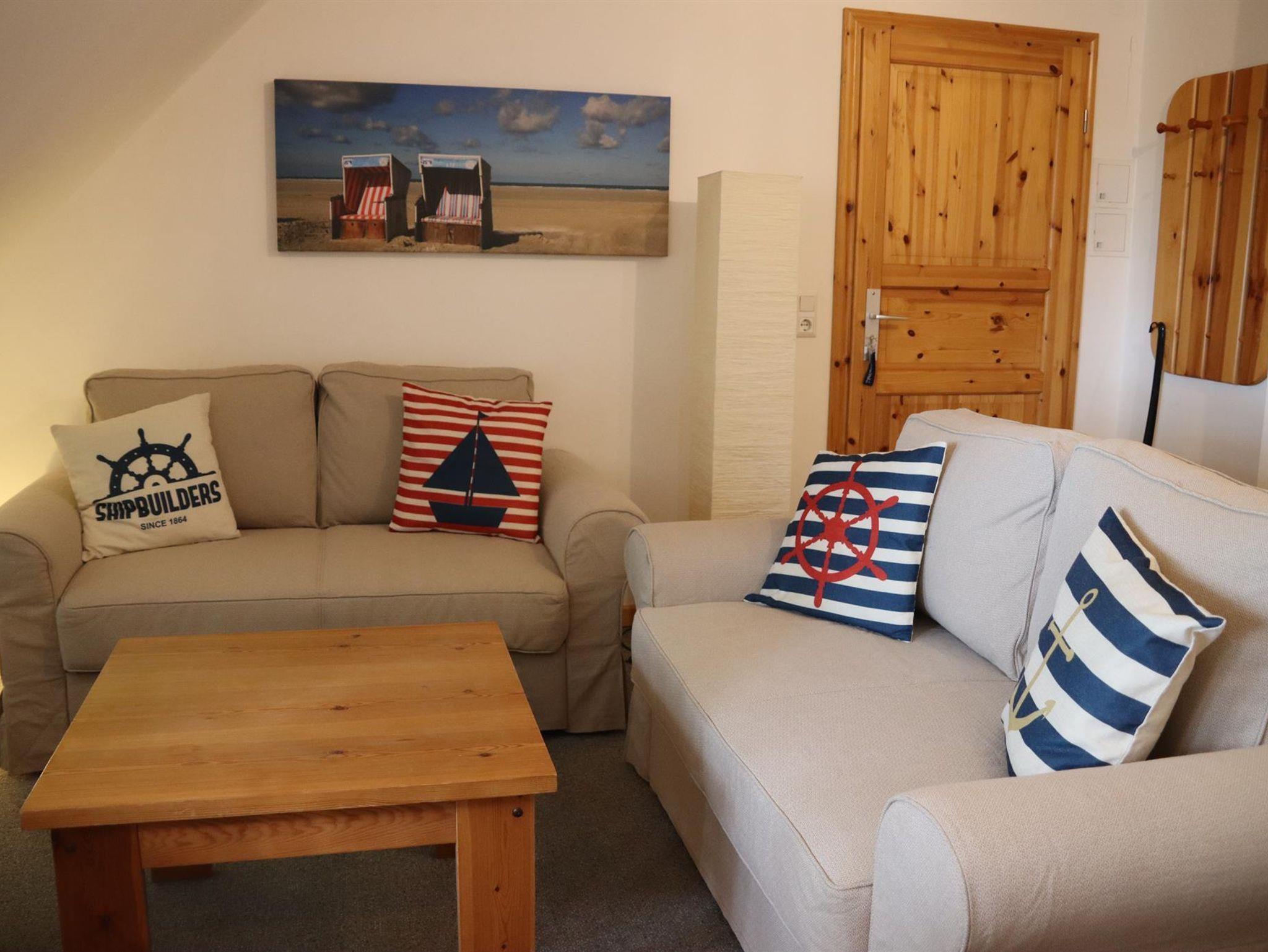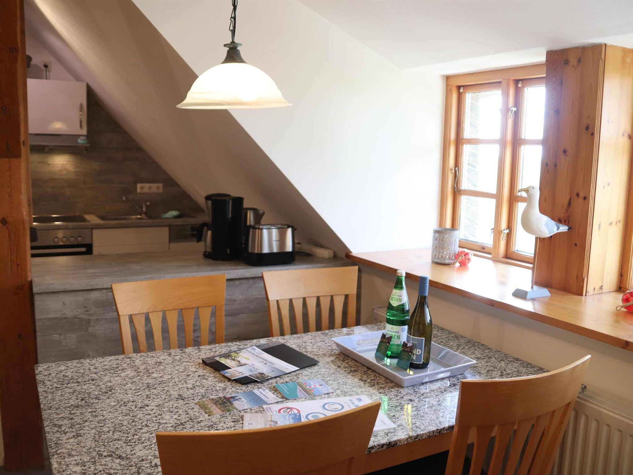 Unsere behagliche Ferienwohnung Küstenwind im Dachgeschoss unseres reetgedeckten Anwesens mit ca. 55 qm bietet ausreichend Platz für 2 Erwachsene und 2 Kinder. Sie verfügt über einen kombinierten Wohn-Ess-Küchenbereich, Schlafzimmer mit Doppelbett (180x200 cm), Kinderzimmer mit Etagenbett (2x90x200cm) oder separatem Kinderbett (60x120cm) sowie ein Duschbad mit WC.