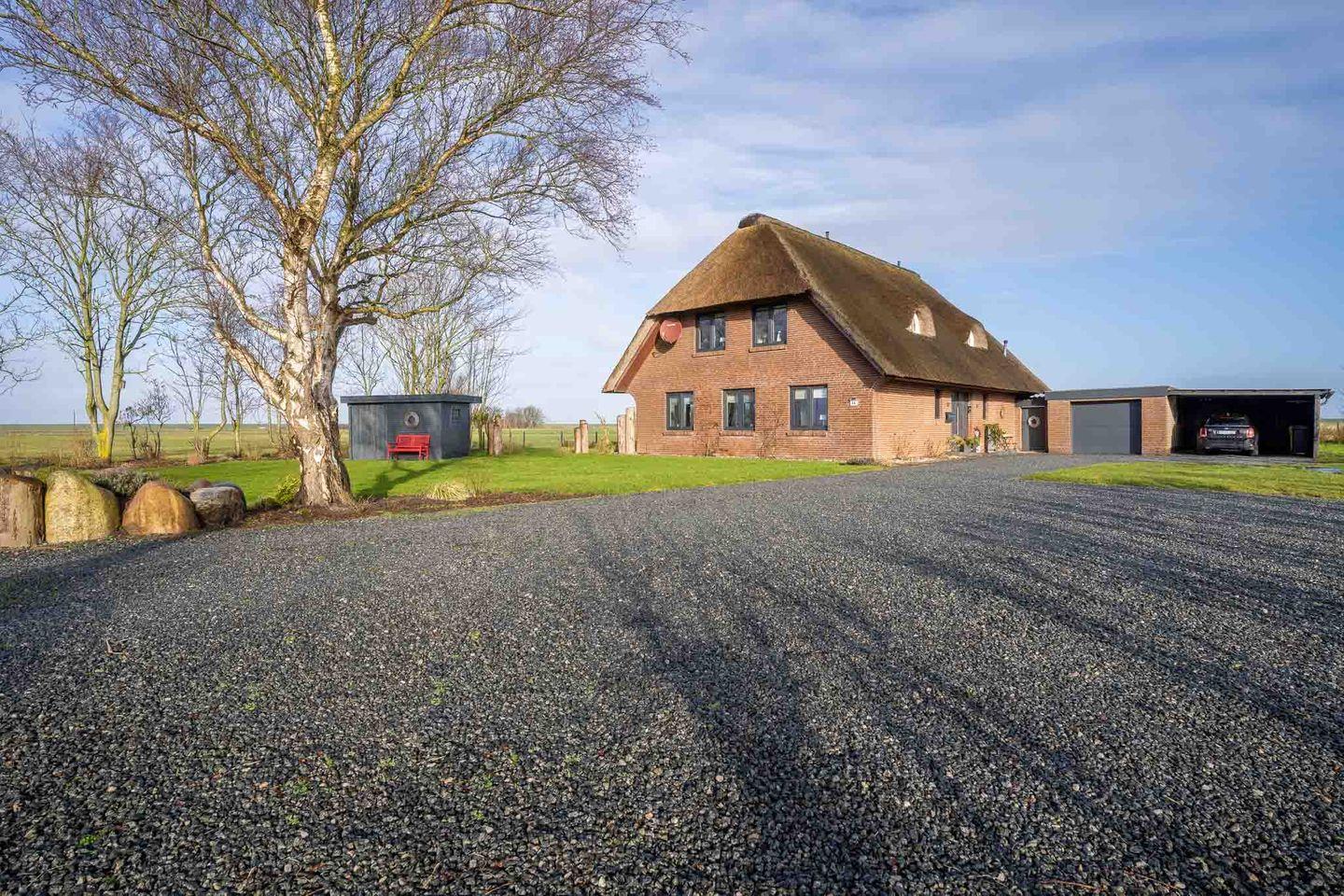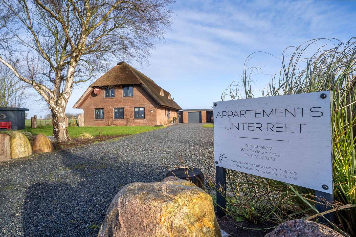 Moderne Reetdach-Ferienwohnung mit Balkon und Weitblick im Tümlauer Koog nahe St. Peter-Ording.
