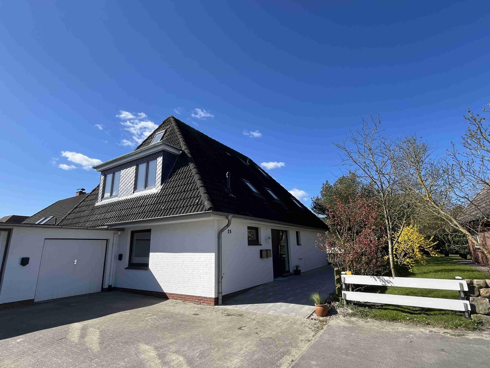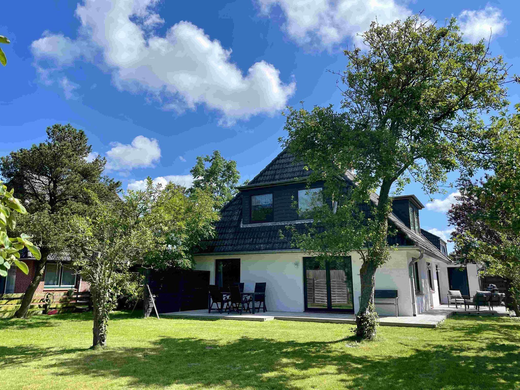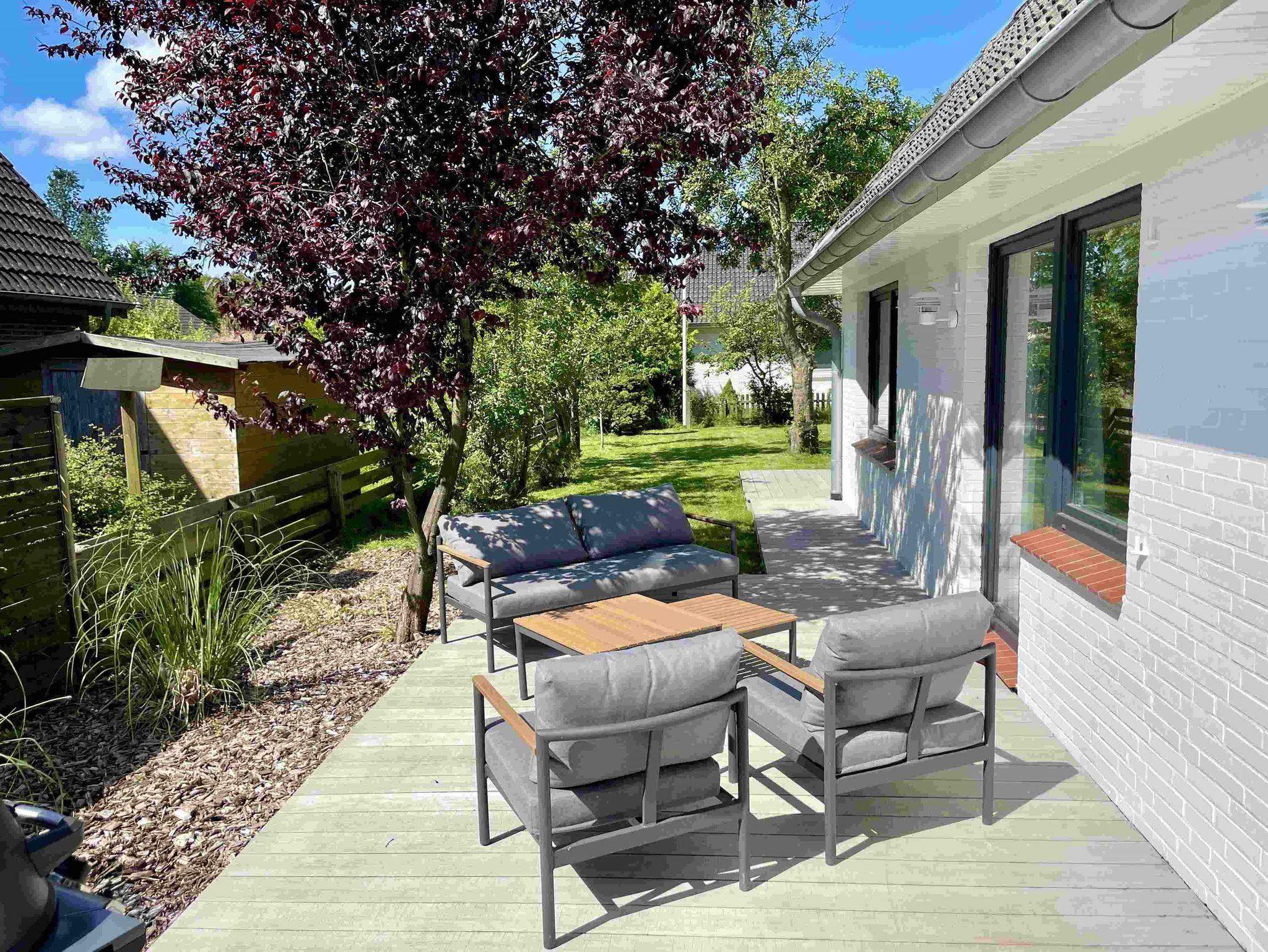 Komfortable 4-Zimmer-Ferienwohnung in ruhiger Lage in Tating, ideal für erholsamen Familienurlaub mit Terrasse und Strandkorb.
