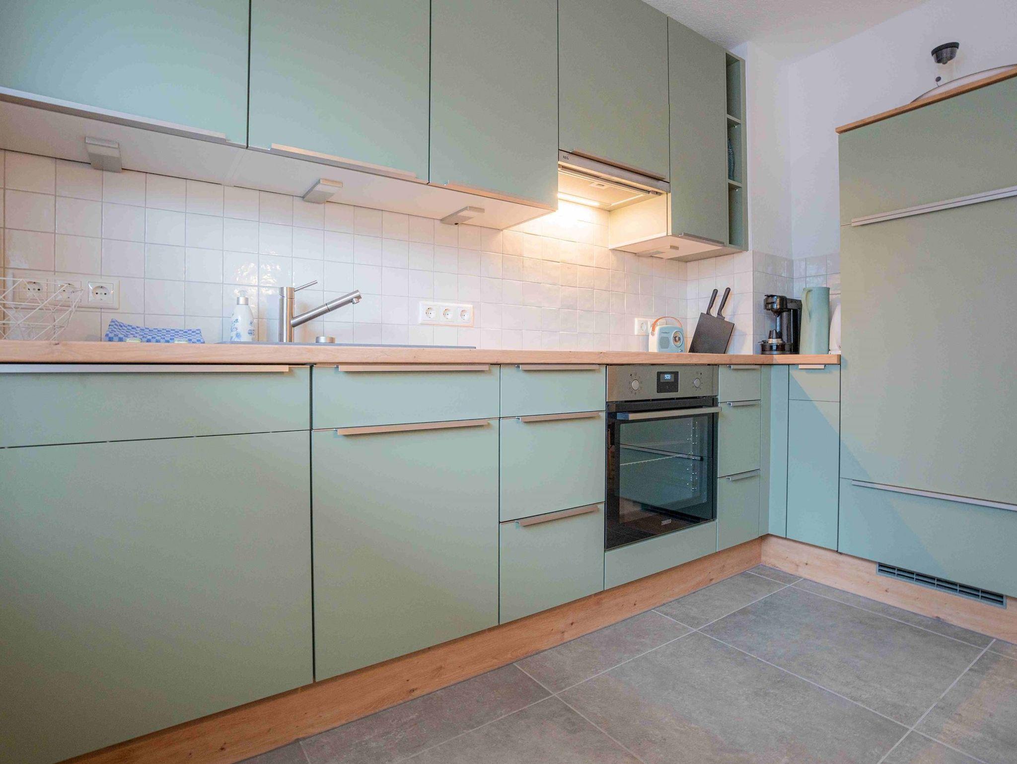 Separate Küche mit Backofen, Geschirrspüler, Induktionskochfeld, Kühl-Gefrier-Kombination und Esstisch mit Stühlen und Sitzbank.