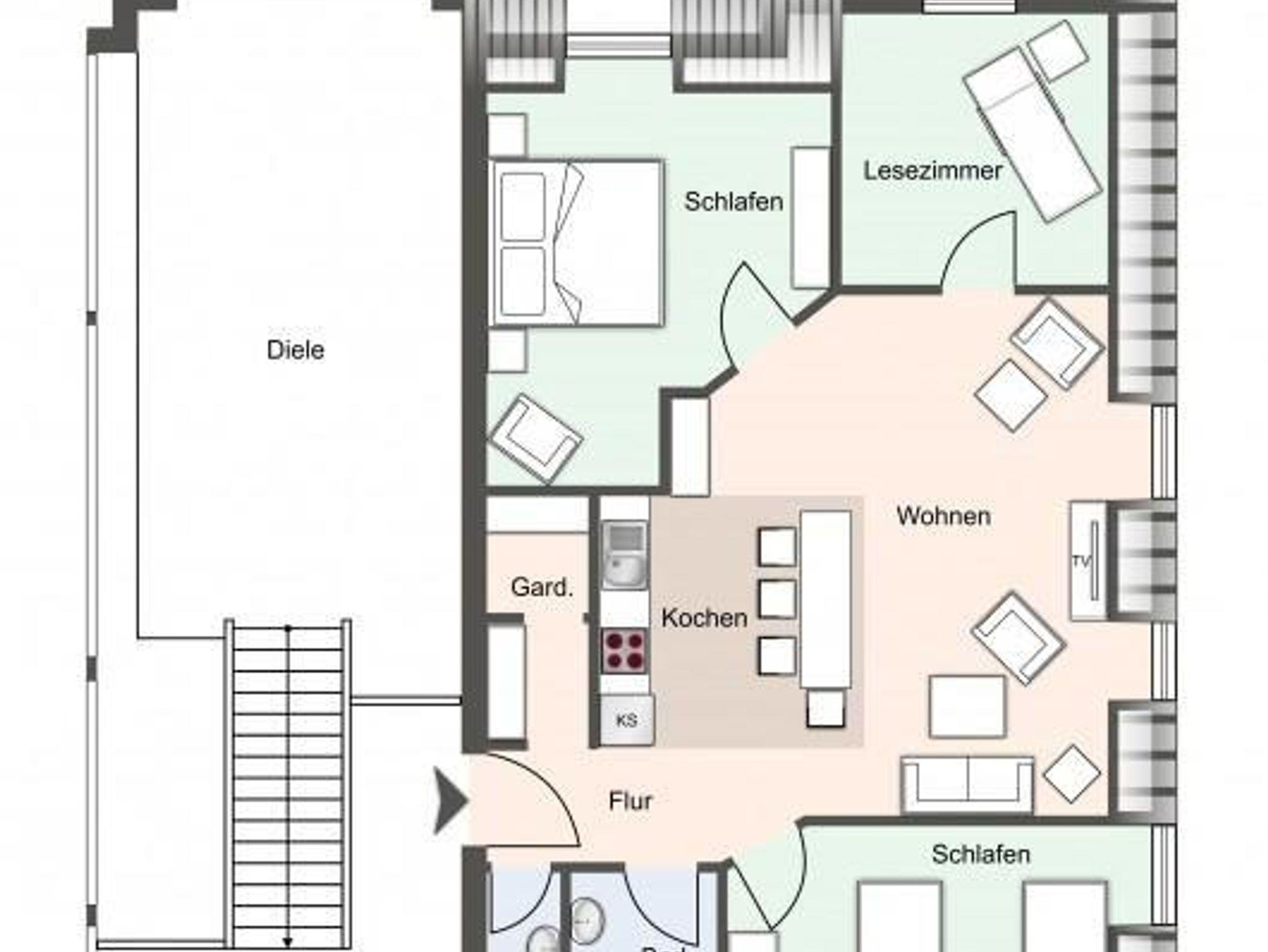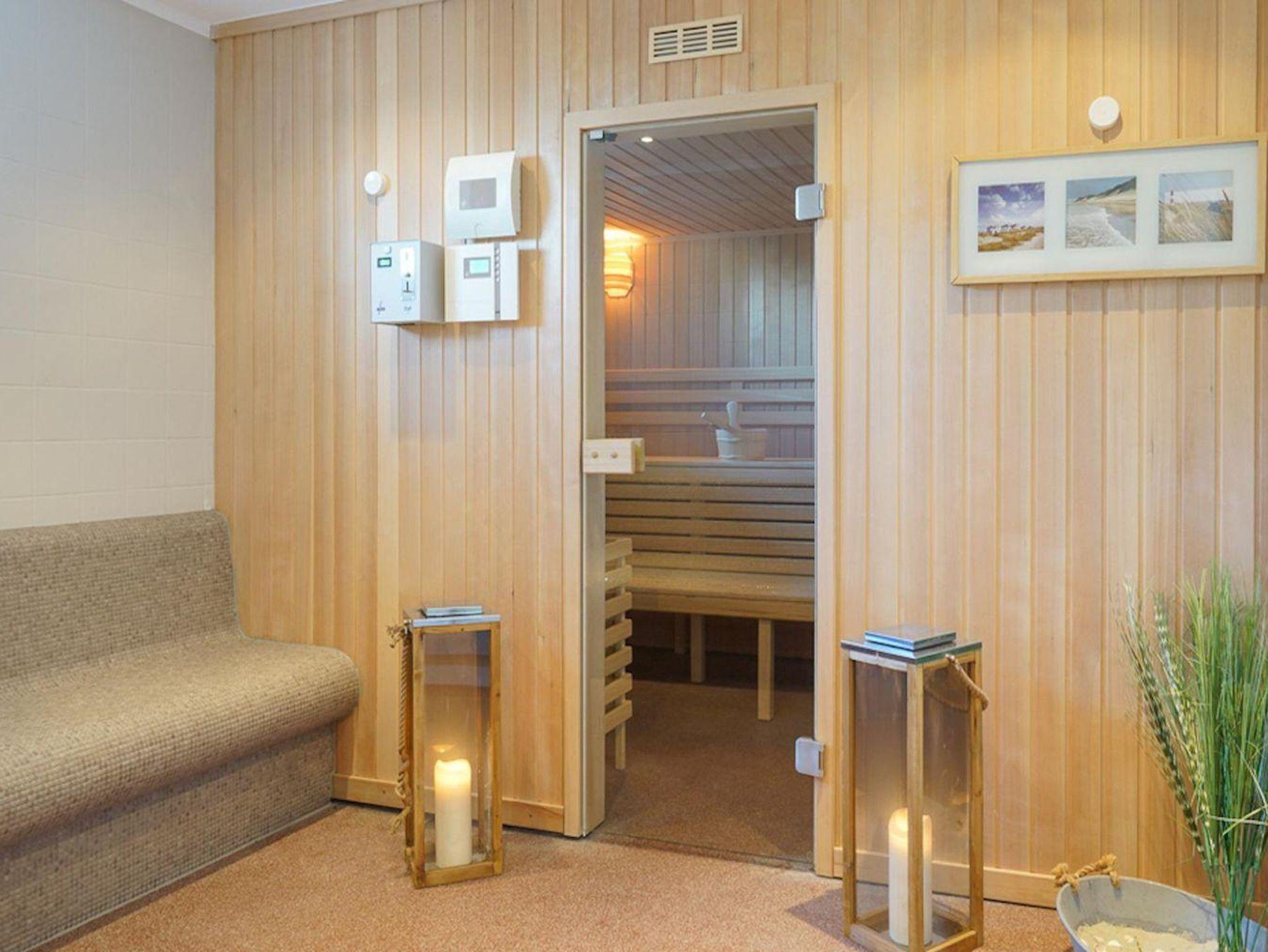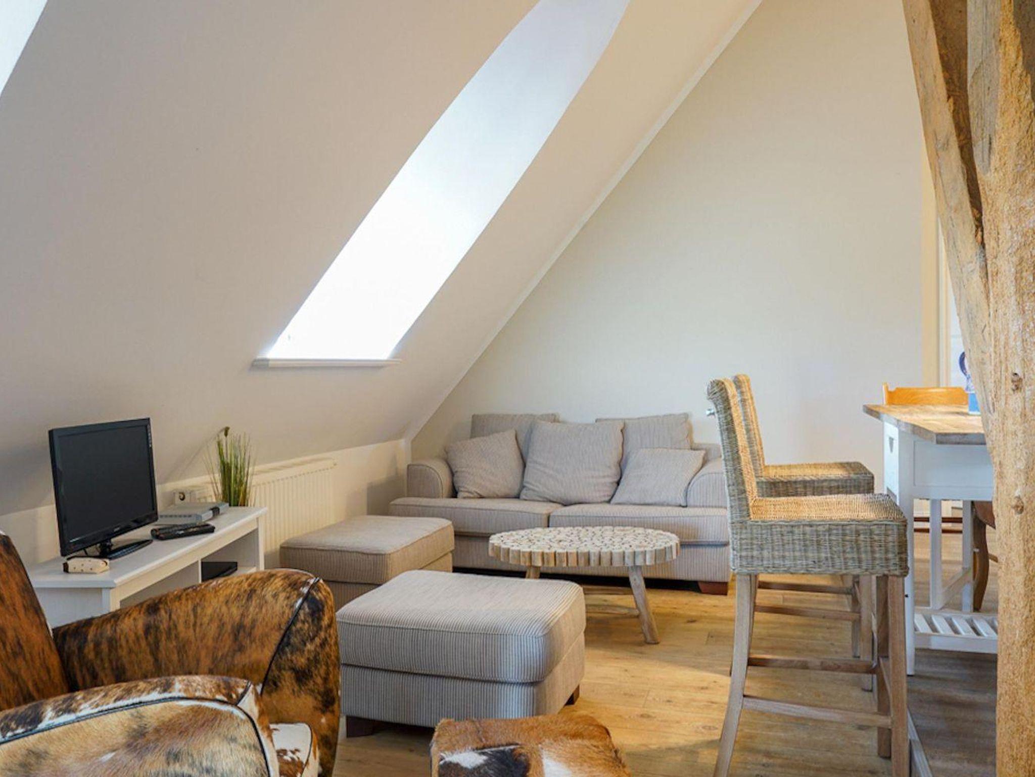 In der Obergeschosswohnung befindet sich ein großzügiger Wohnraum mit einer offenen Küche und einem gemütlichen Essbereich. Für ruhevolle Entspannung sorgen 2 Doppelschlafzimmer mit je einem Doppelbett. Die Wohnung verfügt über ein Duschbad und einem separaten Gäste-WC. Sie haben einen Eingang über die stilvolle Diele. Das volle Wohlfühlprogramm erwartet Sie im Saunabereich, mit Ruheoase und eine sehr geräumigen Sauna, die gegen Gebühr von 5 Wohnung nutzbar ist.