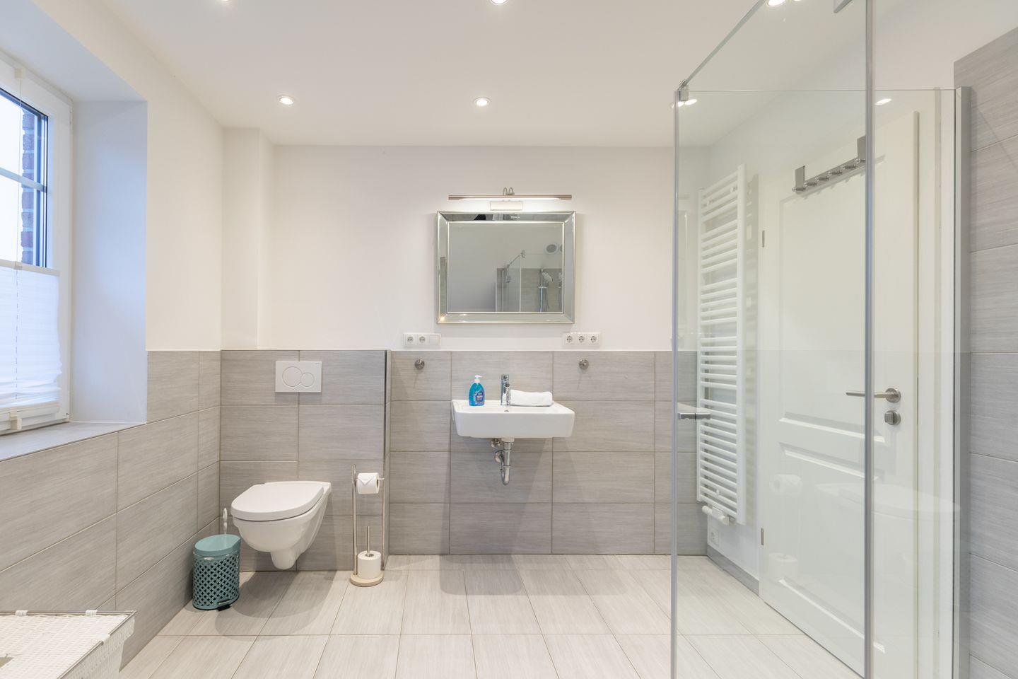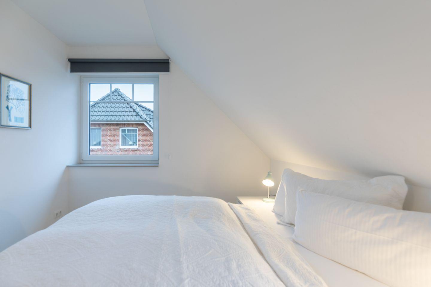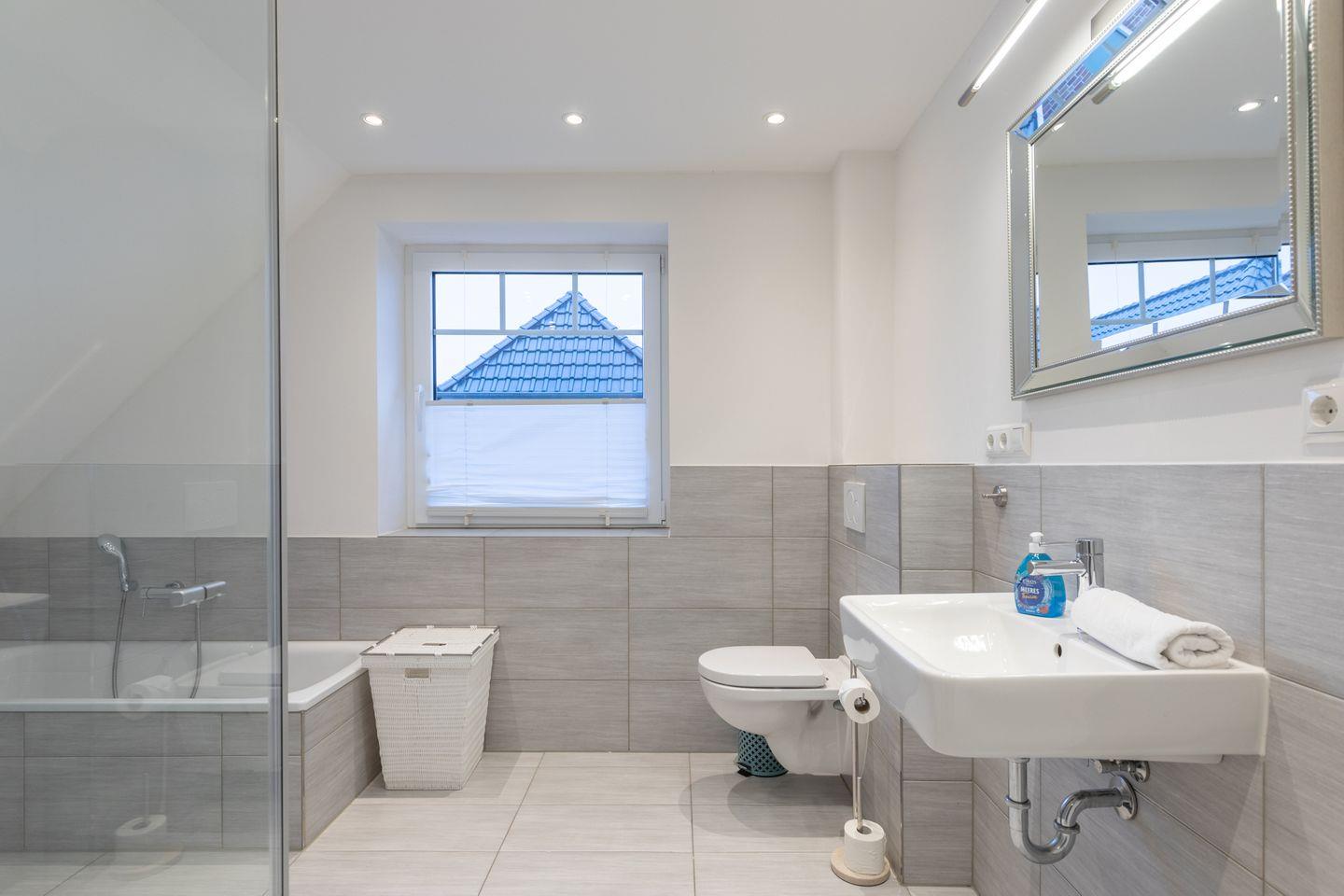 Über eine schöne Holztreppe gelangen Sie ins Obergeschoss mit drei Schlafzimmern: Zwei Schlafzimmer sind mit hochwertigen bequemen Doppelbetten (je 180 x 200) ausgestattet und ein weiteres mit zwei Einzelbetten. Das große Bad mit Fenster im Obergeschoss begeistert mit einer ebenerdigen Dusche, Wanne und Handtuchheizung.