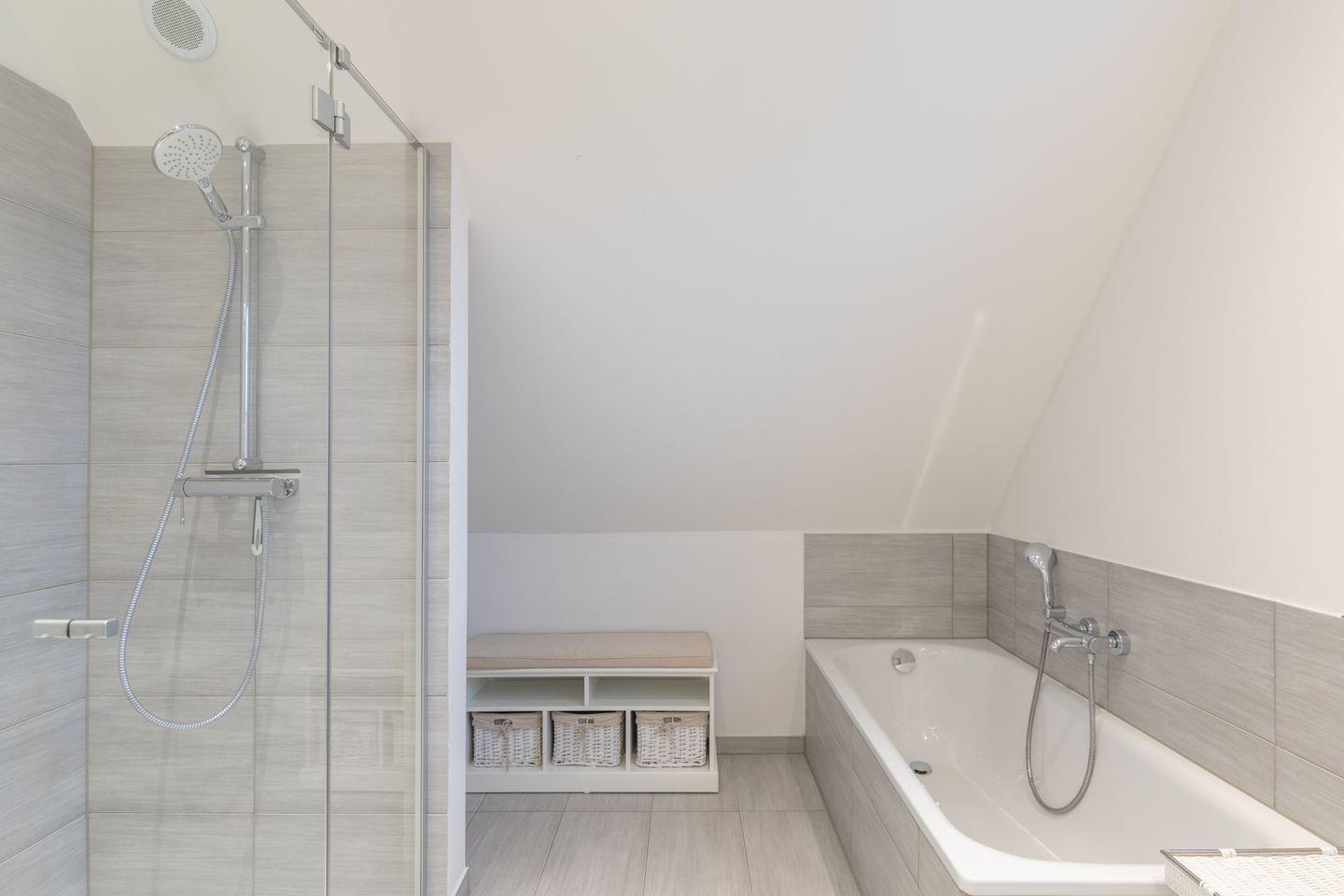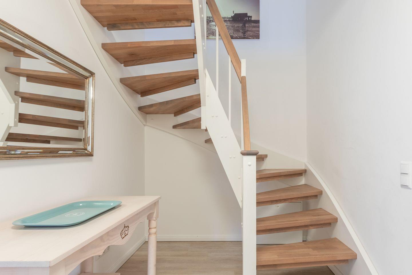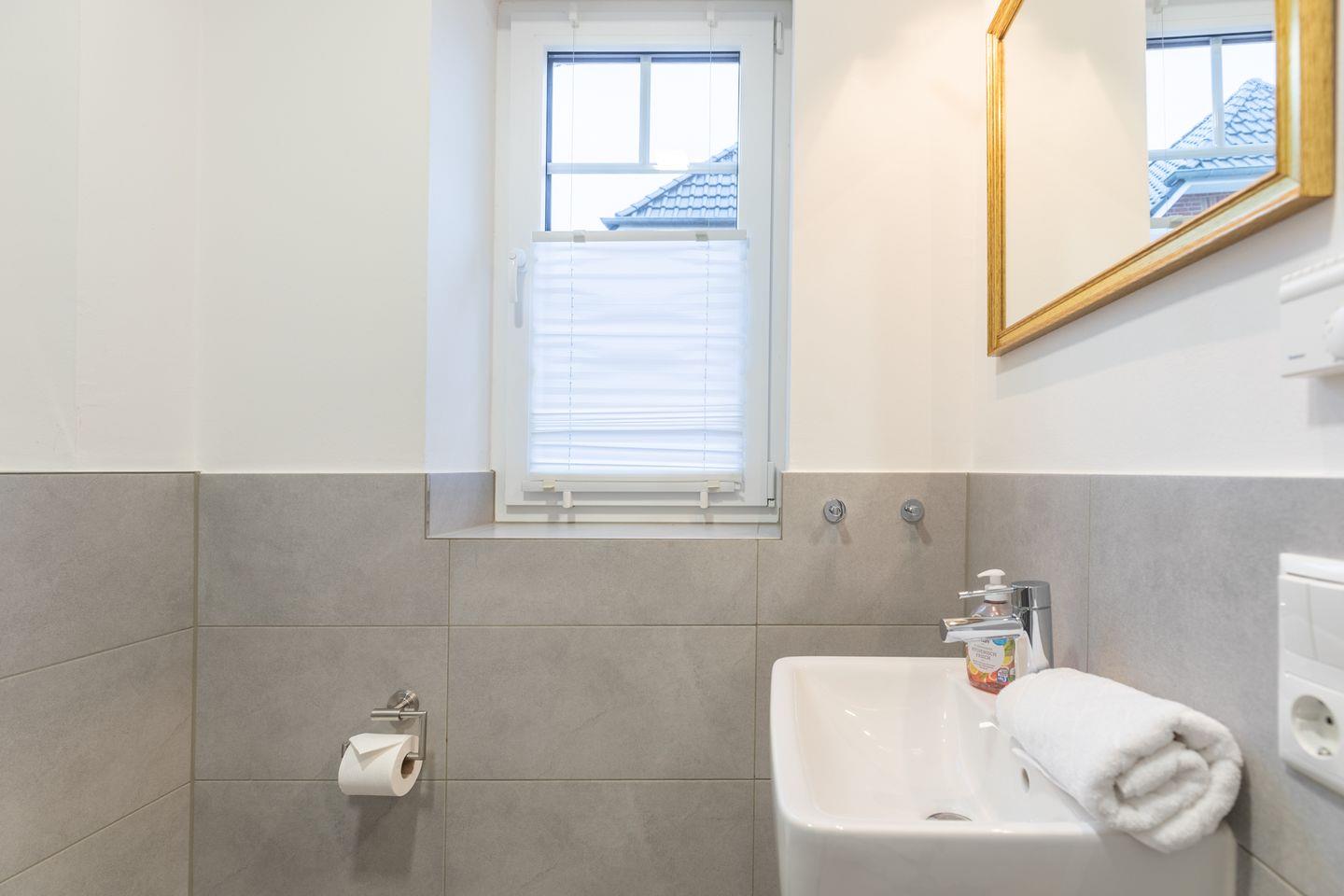 Über eine schöne Holztreppe gelangen Sie ins Obergeschoss mit drei Schlafzimmern: Zwei Schlafzimmer sind mit hochwertigen bequemen Doppelbetten (je 180 x 200) ausgestattet und ein weiteres mit zwei Einzelbetten. Das große Bad mit Fenster im Obergeschoss begeistert mit einer ebenerdigen Dusche, Wanne und Handtuchheizung.