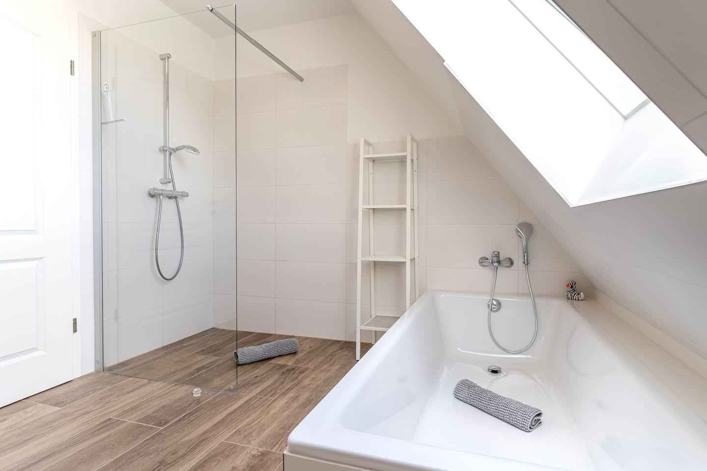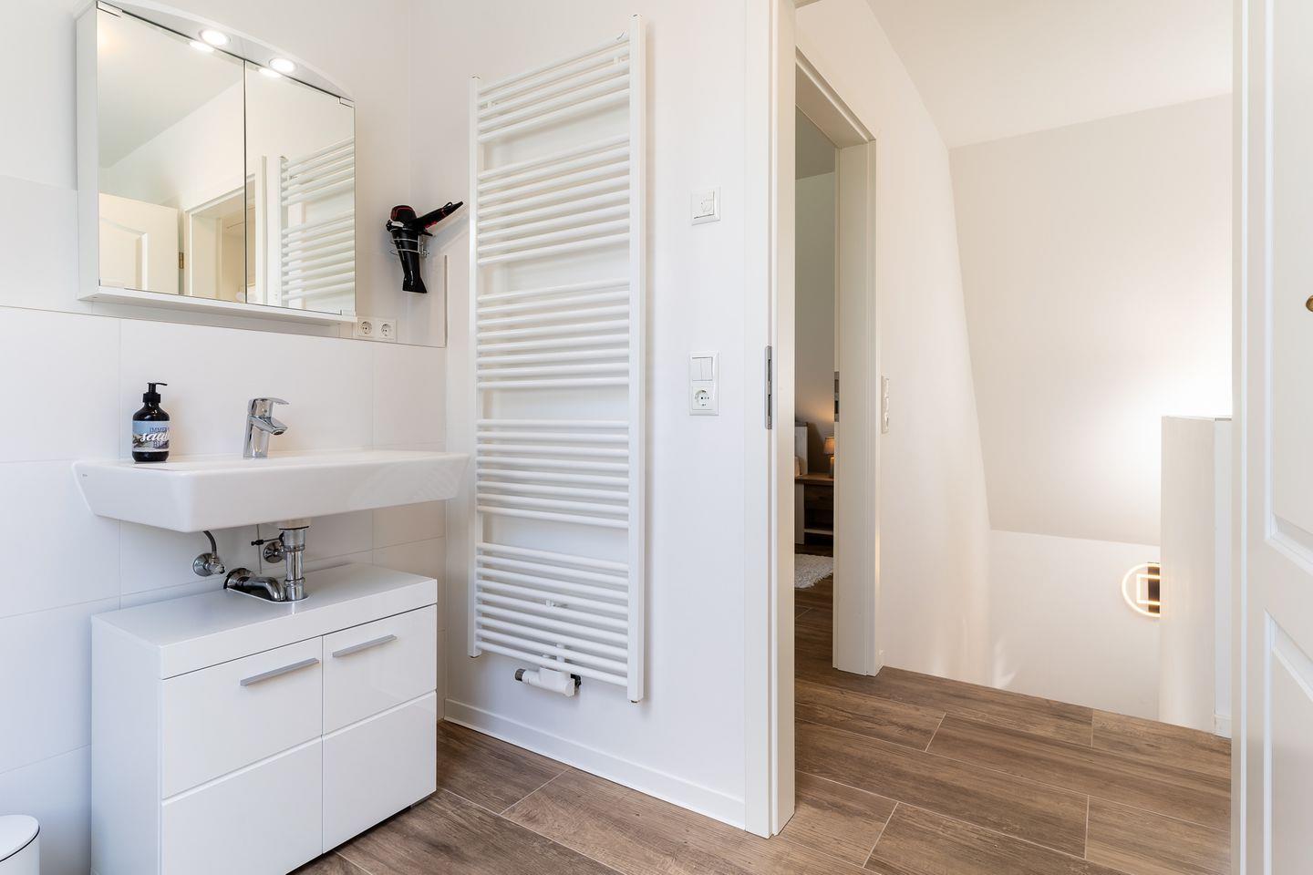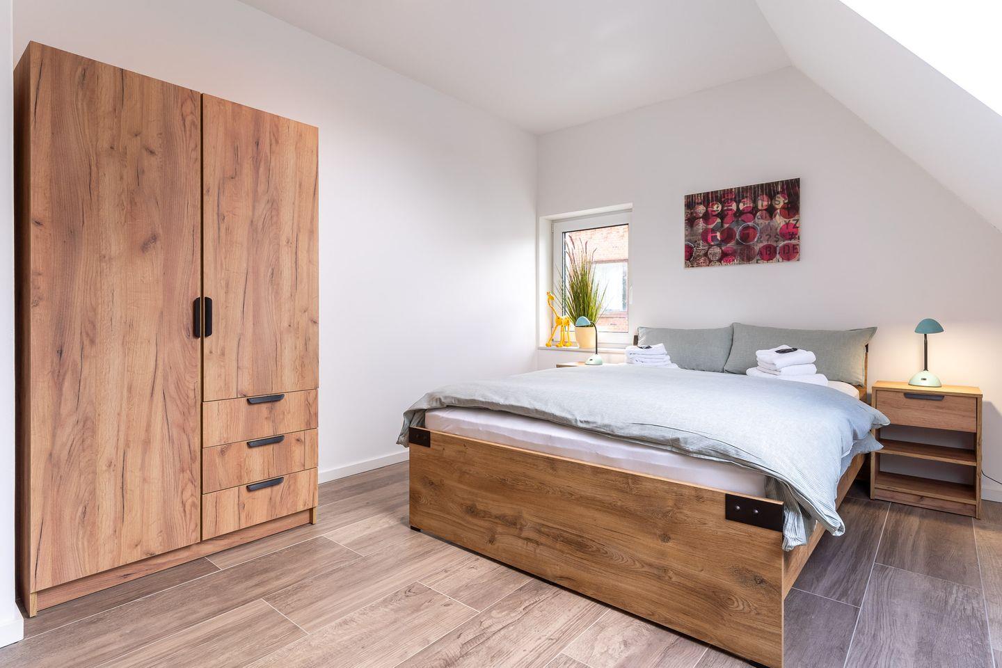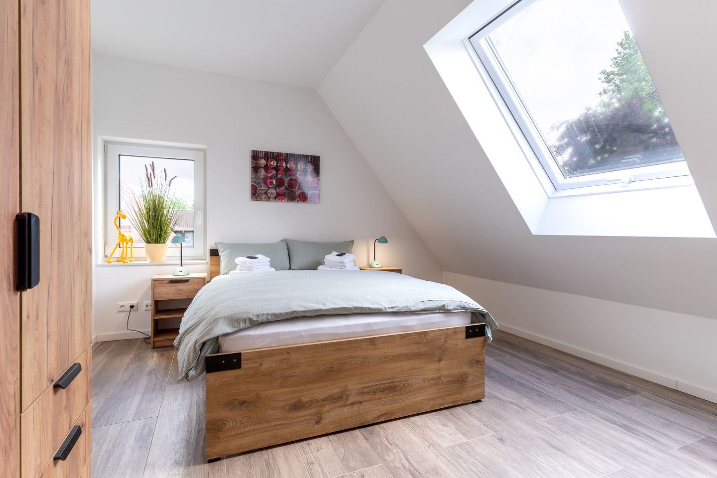 Über eine stilvolle, geländerfreie Treppe gelangen Sie in die obere Etage. Hier erwarten Sie drei weitere Schlafzimmer: Zwei davon spiegelgleich mit je einem gemütlichen Bett (140x200 cm) und ein weiteres Schlafzimmer mit einem großzügigen Doppelbett (180x200 cm). Ein großes Badezimmer mit bodengleicher Dusche und Badewanne rundet das Angebot ab.