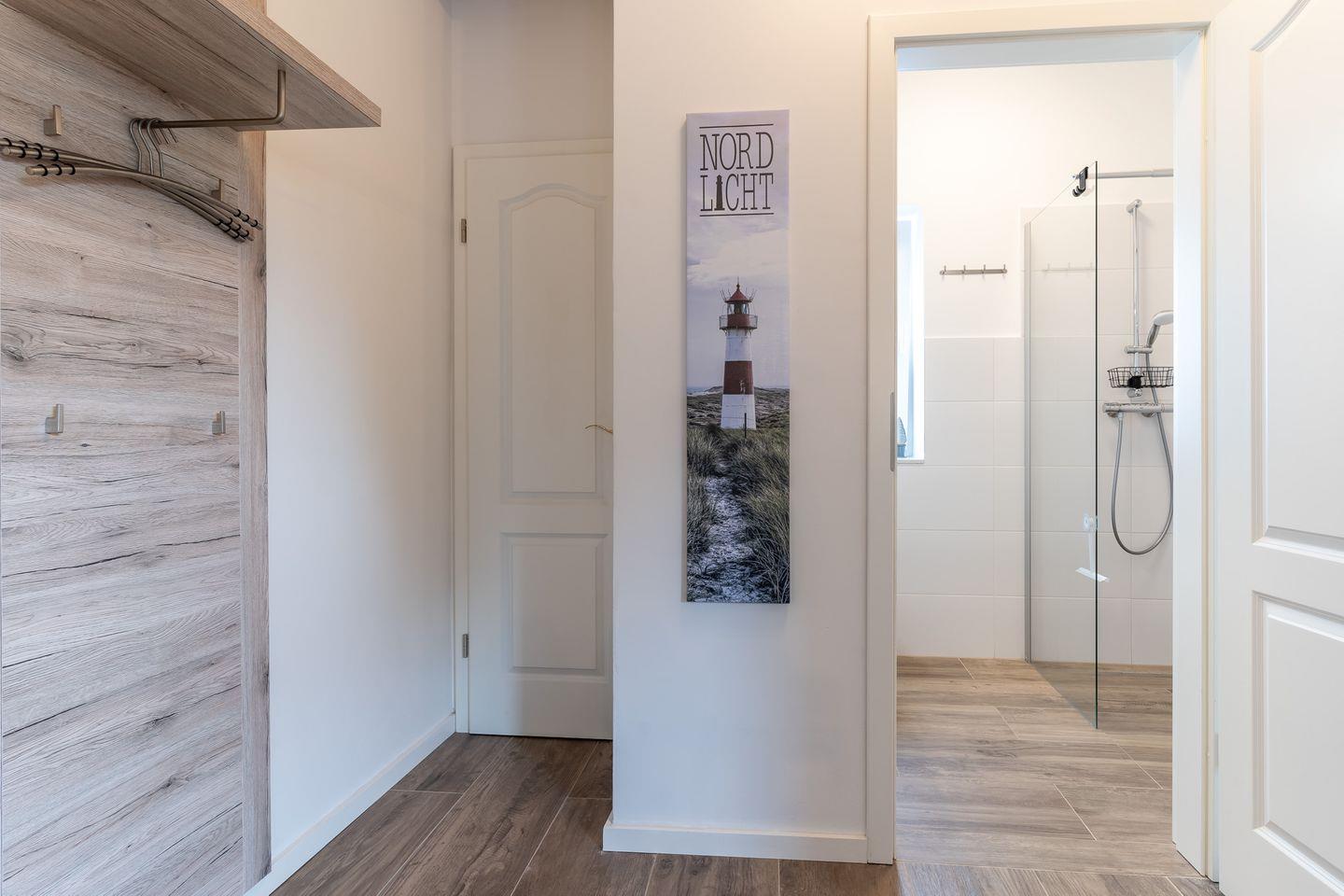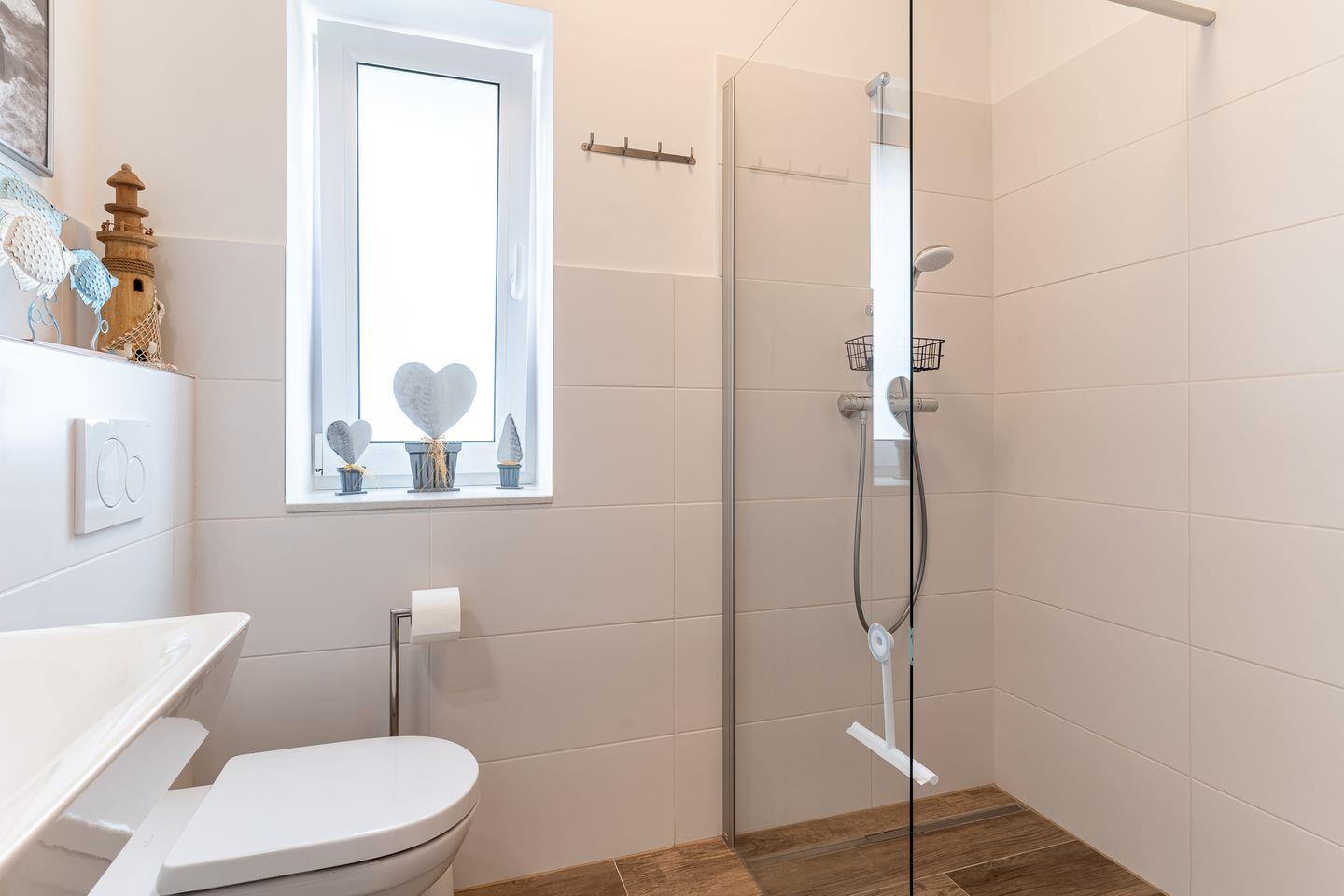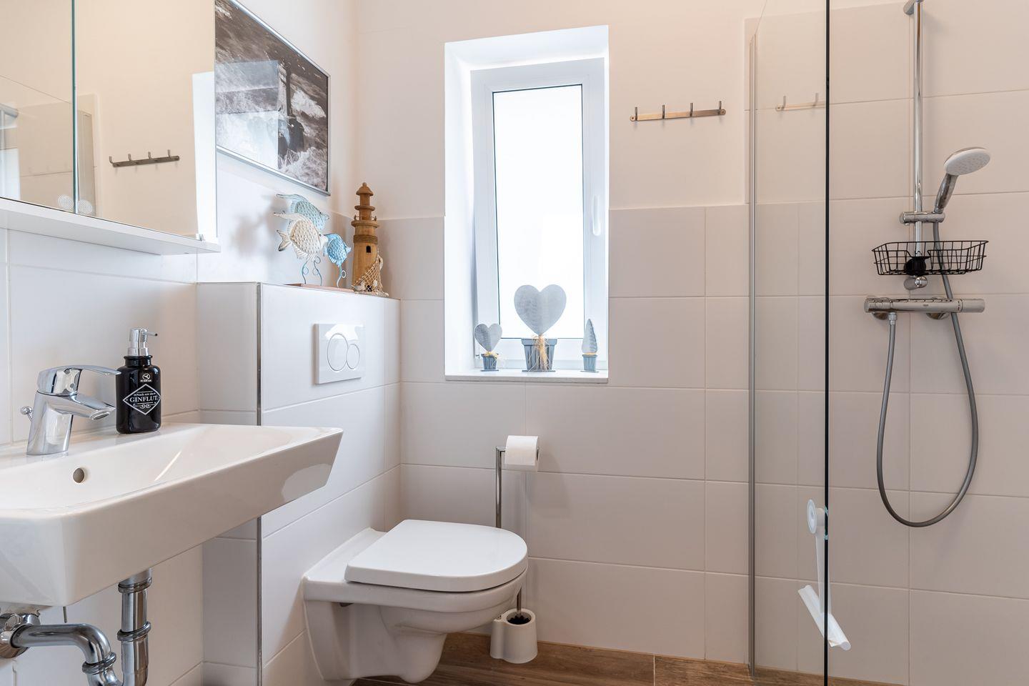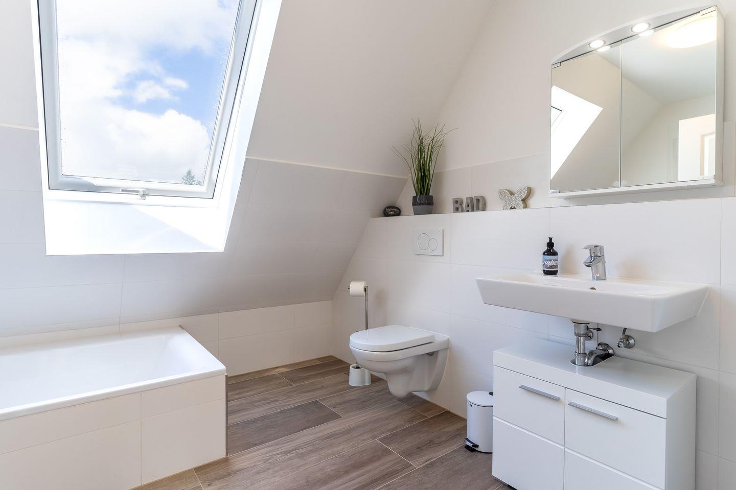 Über eine stilvolle, geländerfreie Treppe gelangen Sie in die obere Etage. Hier erwarten Sie drei weitere Schlafzimmer: Zwei davon spiegelgleich mit je einem gemütlichen Bett (140x200 cm) und ein weiteres Schlafzimmer mit einem großzügigen Doppelbett (180x200 cm). Ein großes Badezimmer mit bodengleicher Dusche und Badewanne rundet das Angebot ab.