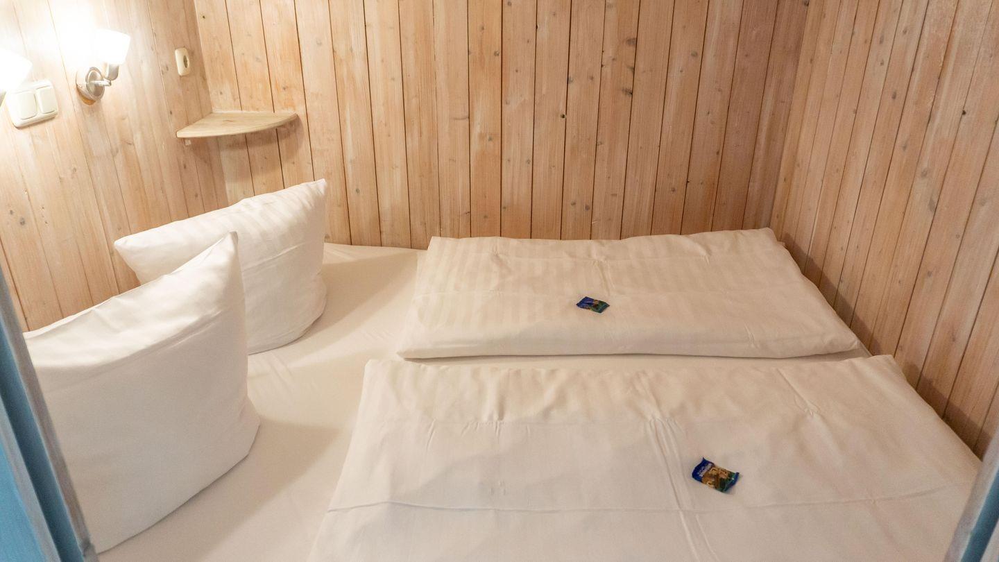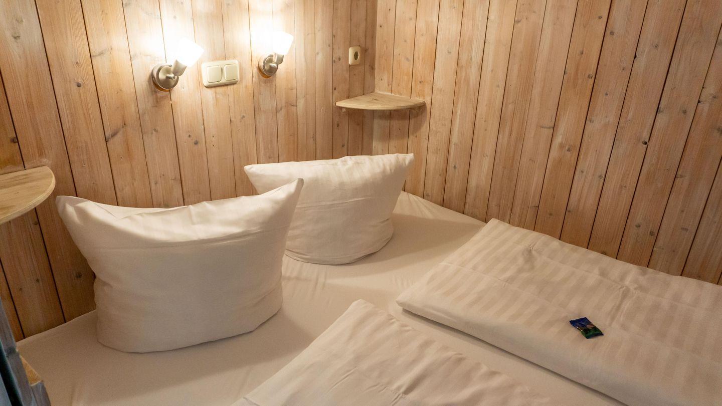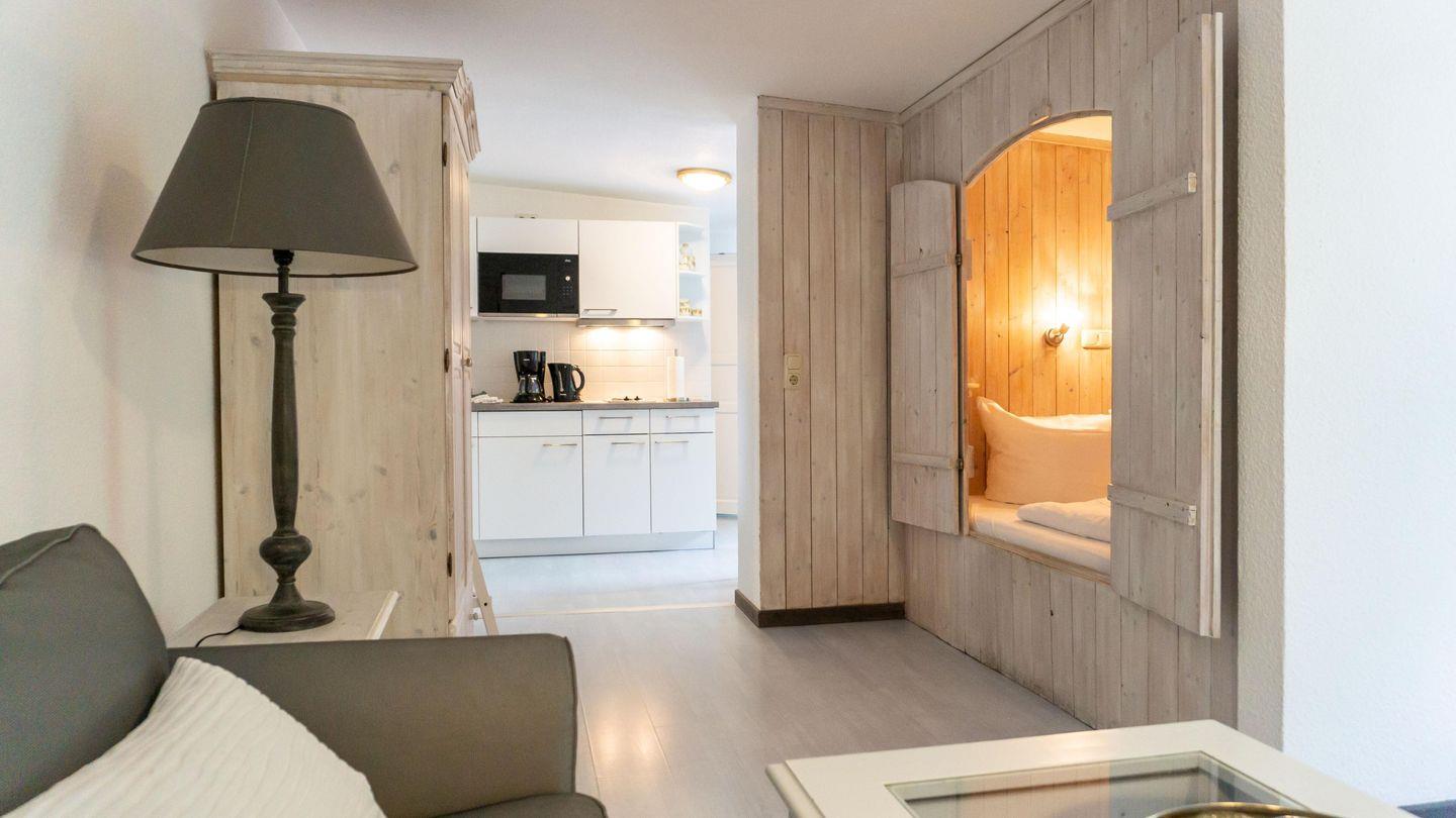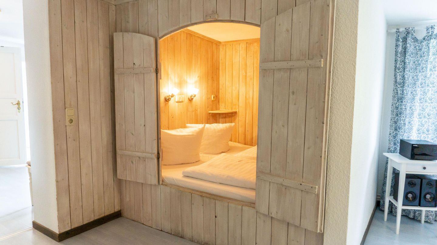 Der Schlafbereich ist im Wohnbereich in Form eines Alkovendoppelbettes integriert und verfügt über eine komfortable Schlafgelegenheit für bis zu zwei Personen und verspricht dank der ruhigen Lage erholsame Nächte.