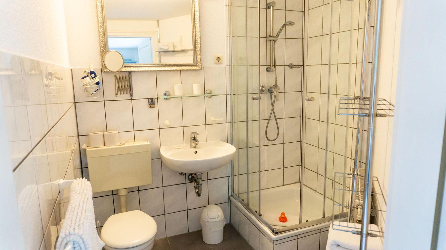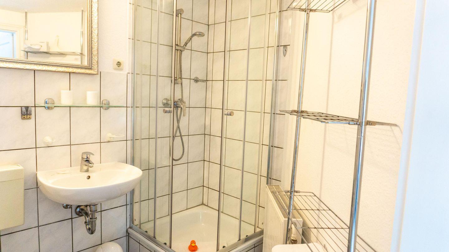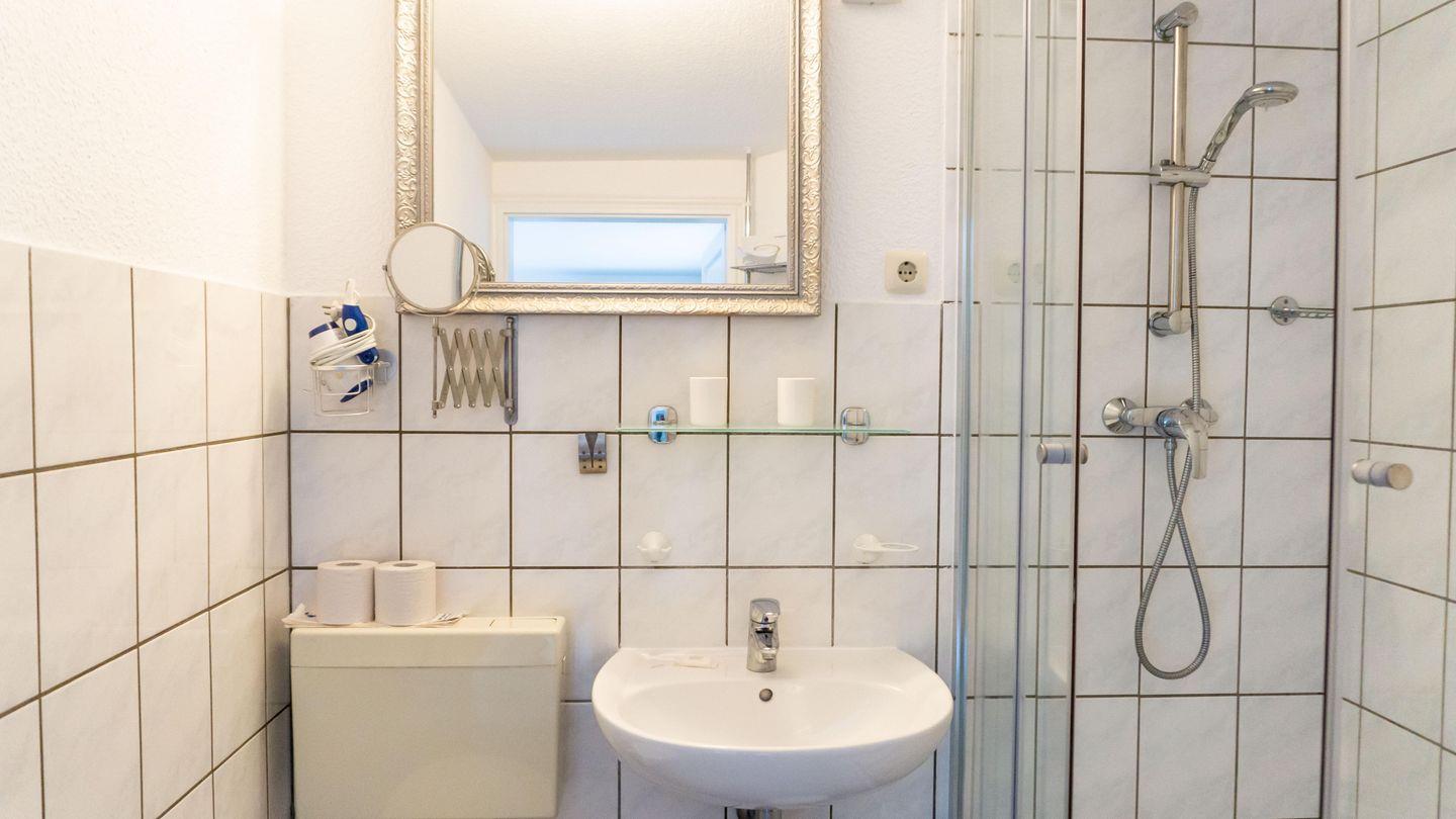 Das Badezimmer ist mit einer Dusche ausgestattet. Zudem gehören Annehmlichkeiten wie Haartrockner und Kosmetikspiegel zur Grundausstattung.