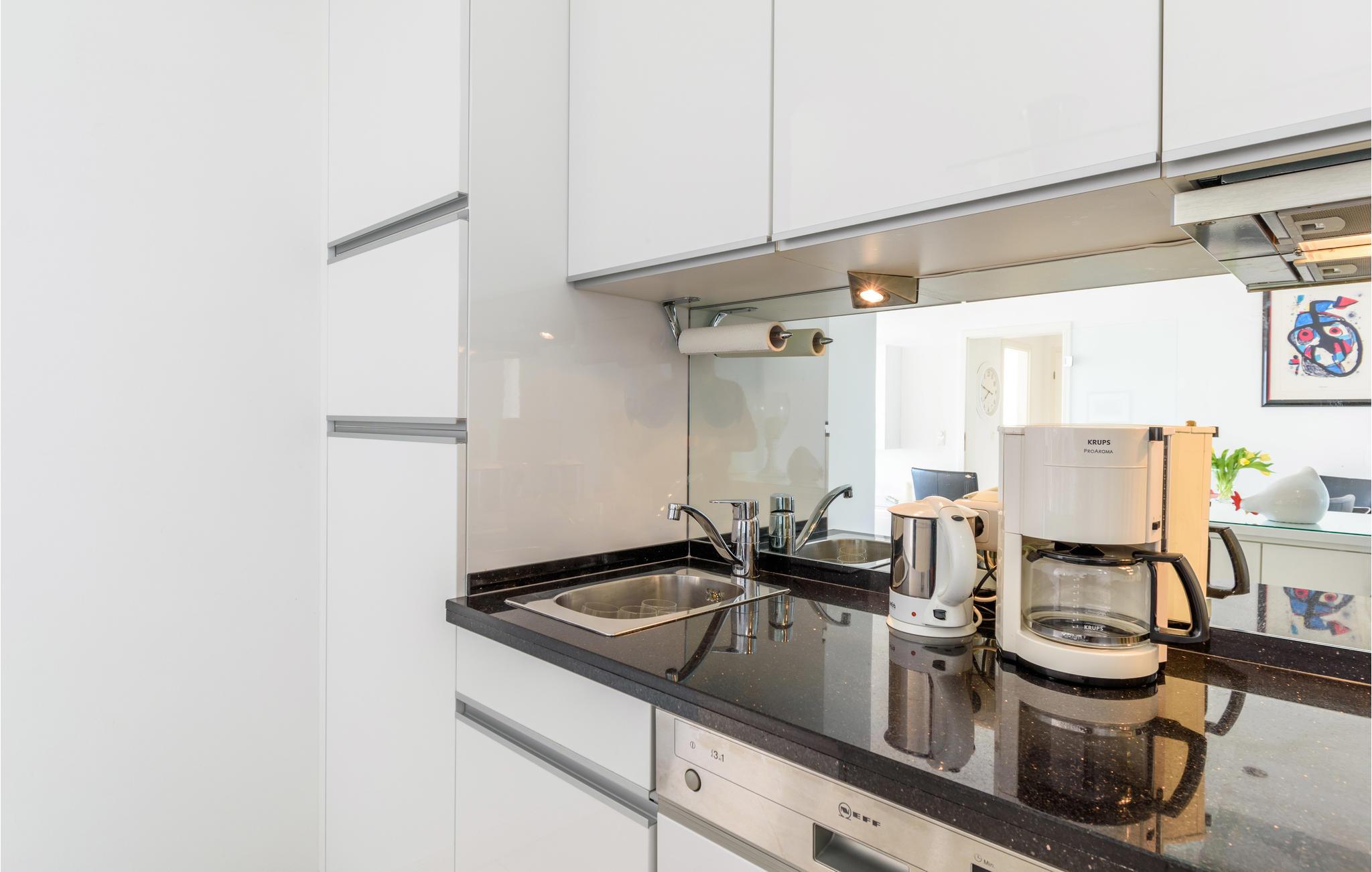 Das Apartment hat einen großen Wohn- und Essbereich mit einer kleinen aber voll ausgestatteten Küche. Das große Fenster und die Balkontür sorgen auch von hier aus für eine phantastische Aussicht. Auch aus dem großzügigen Schlafzimmer heraus haben Sie Zugang zu Ihrem großen Balkon auf dem ein Tisch und zwei Sonnenliegen für entspannte Stunden auf Sie warten. Das moderne Duschbad lässt keine Wünsche offen, Haarföhn, Bügeleisen und -brett sind vorhanden.