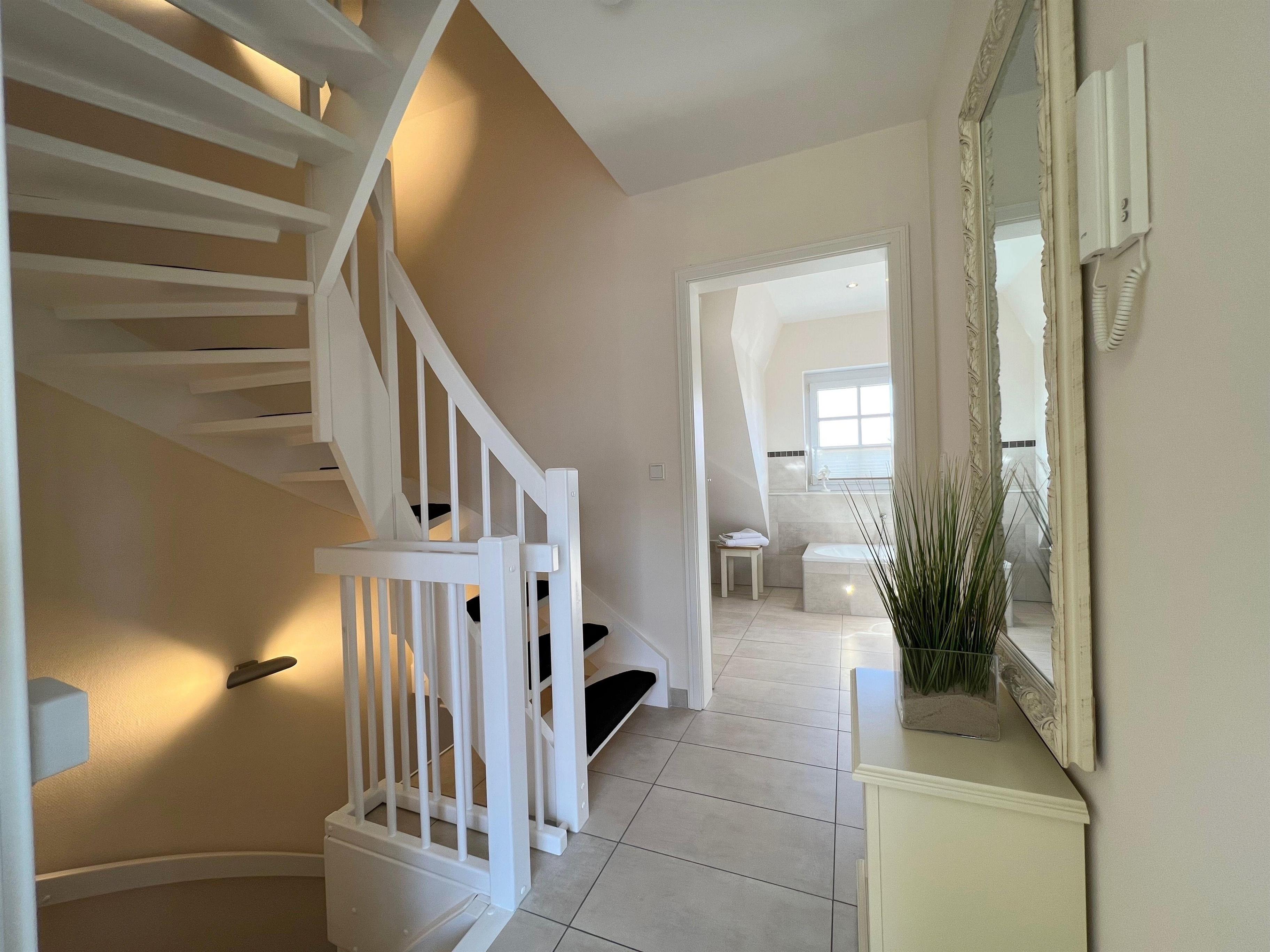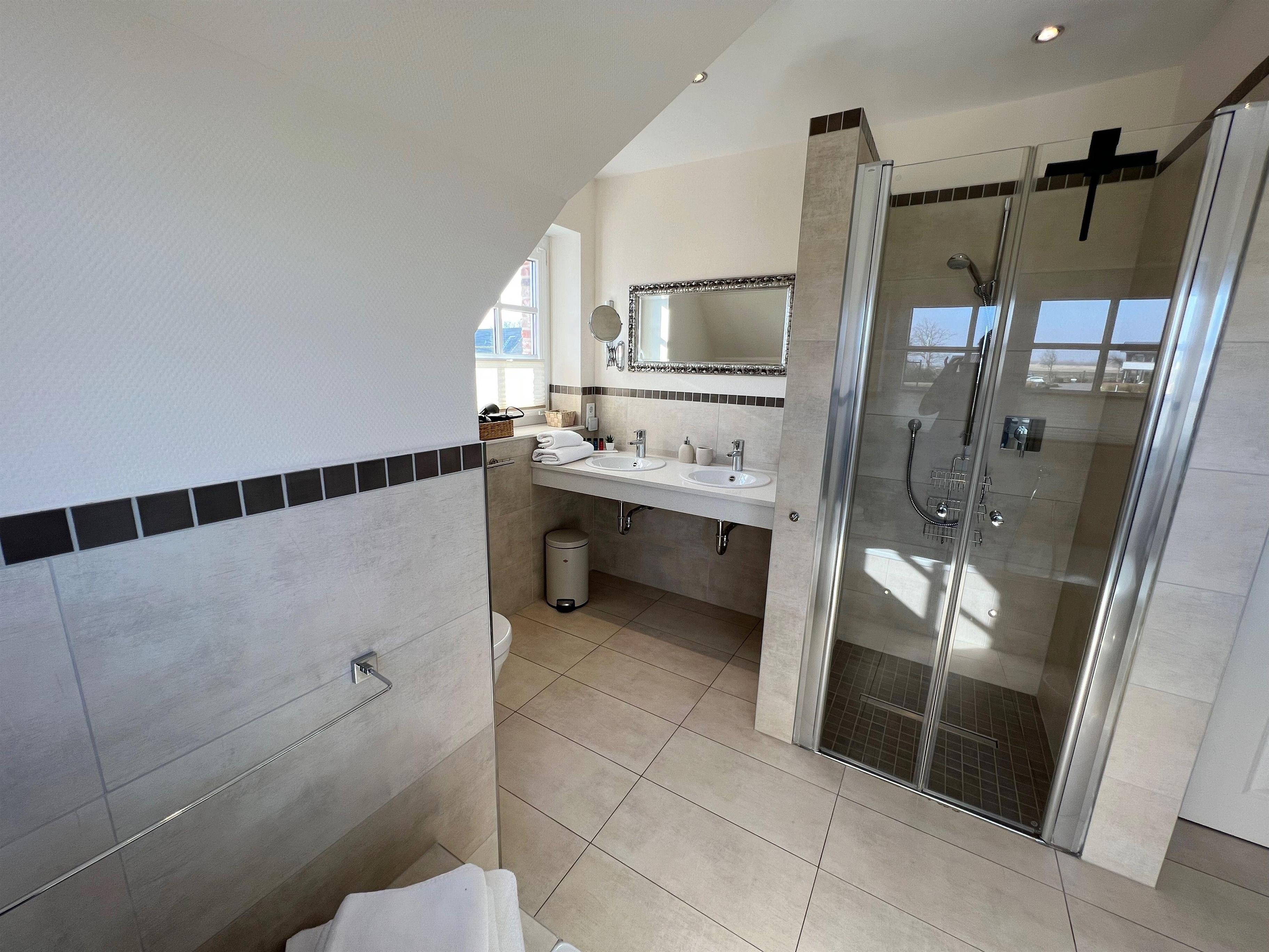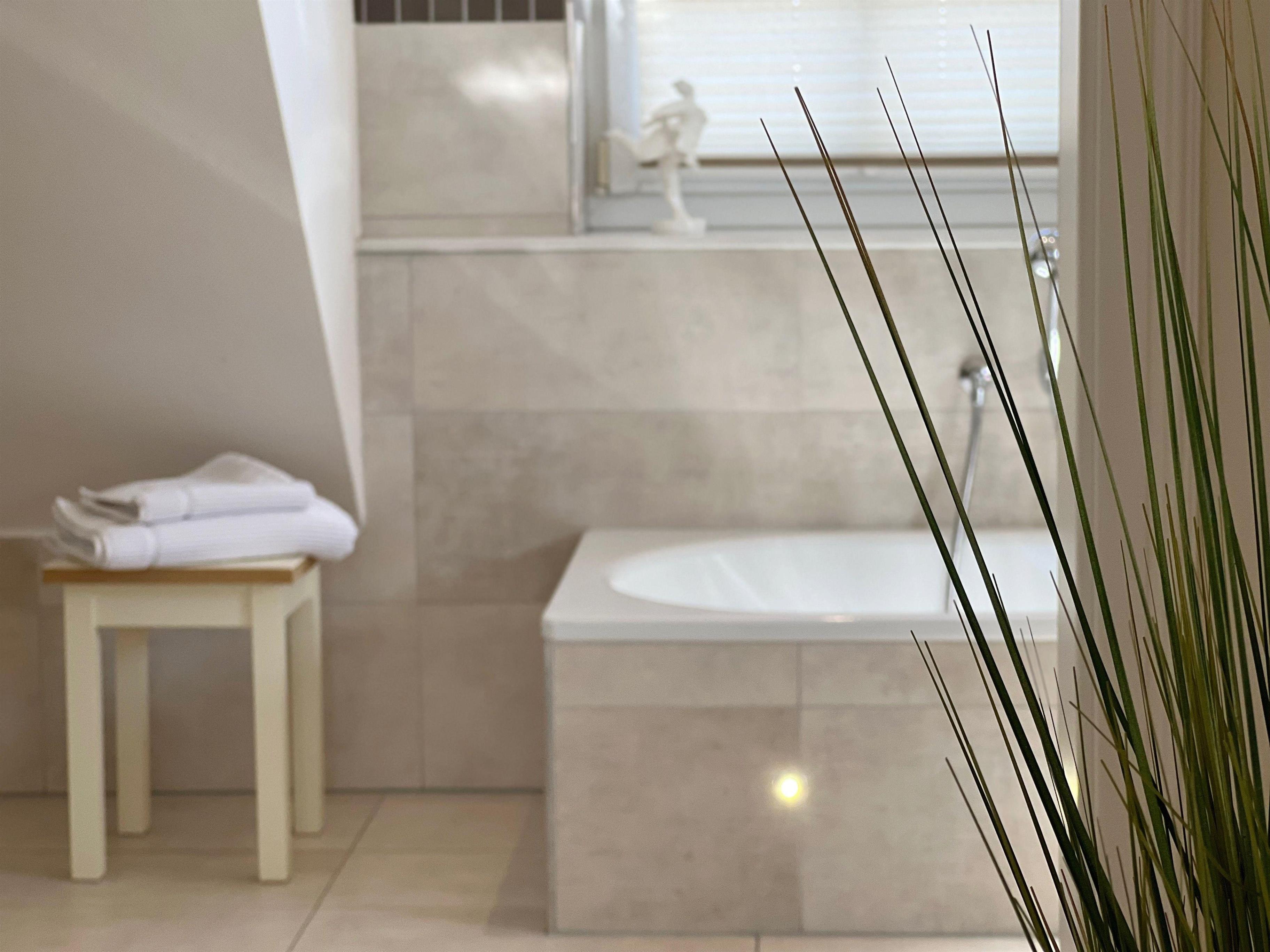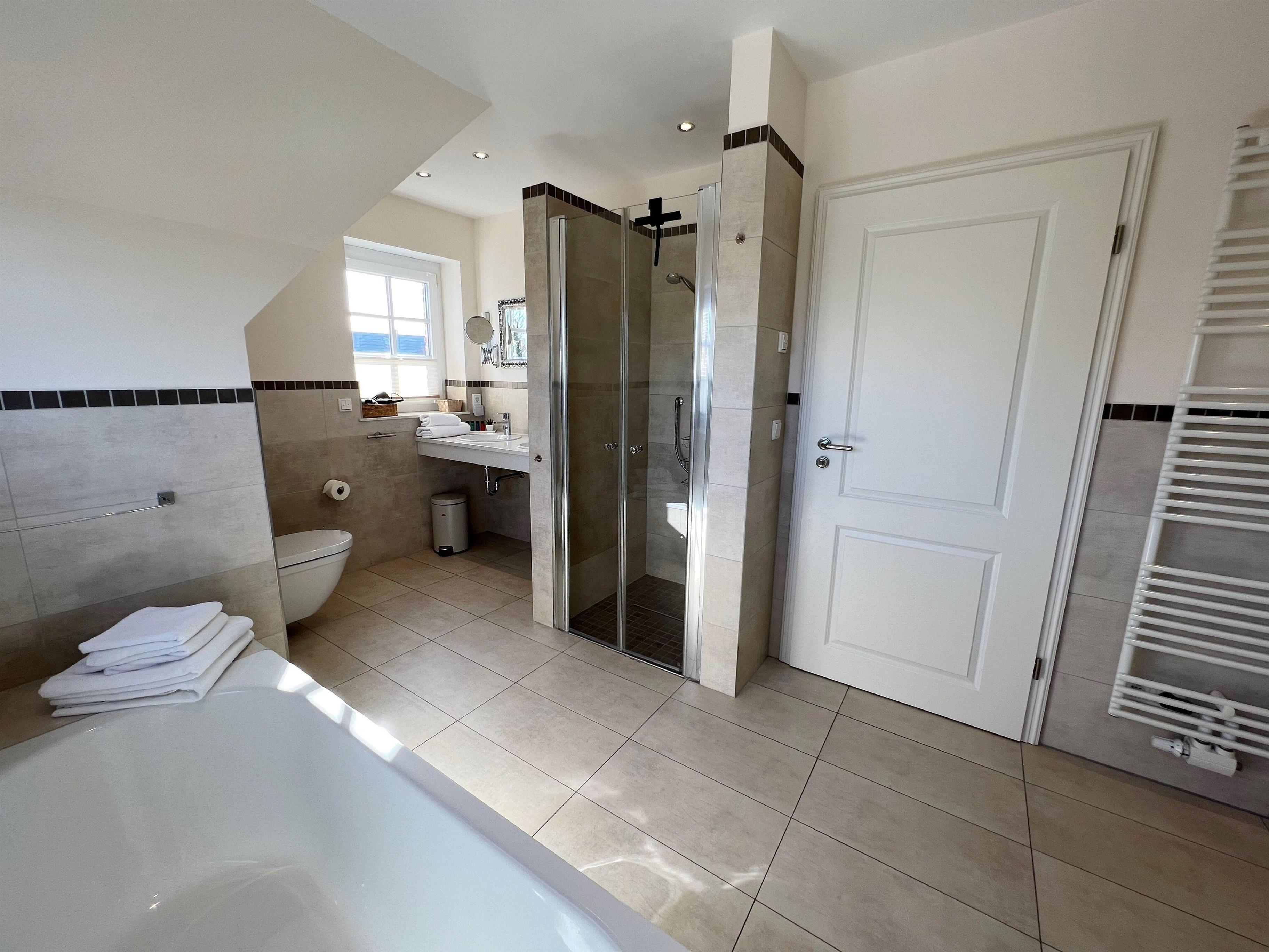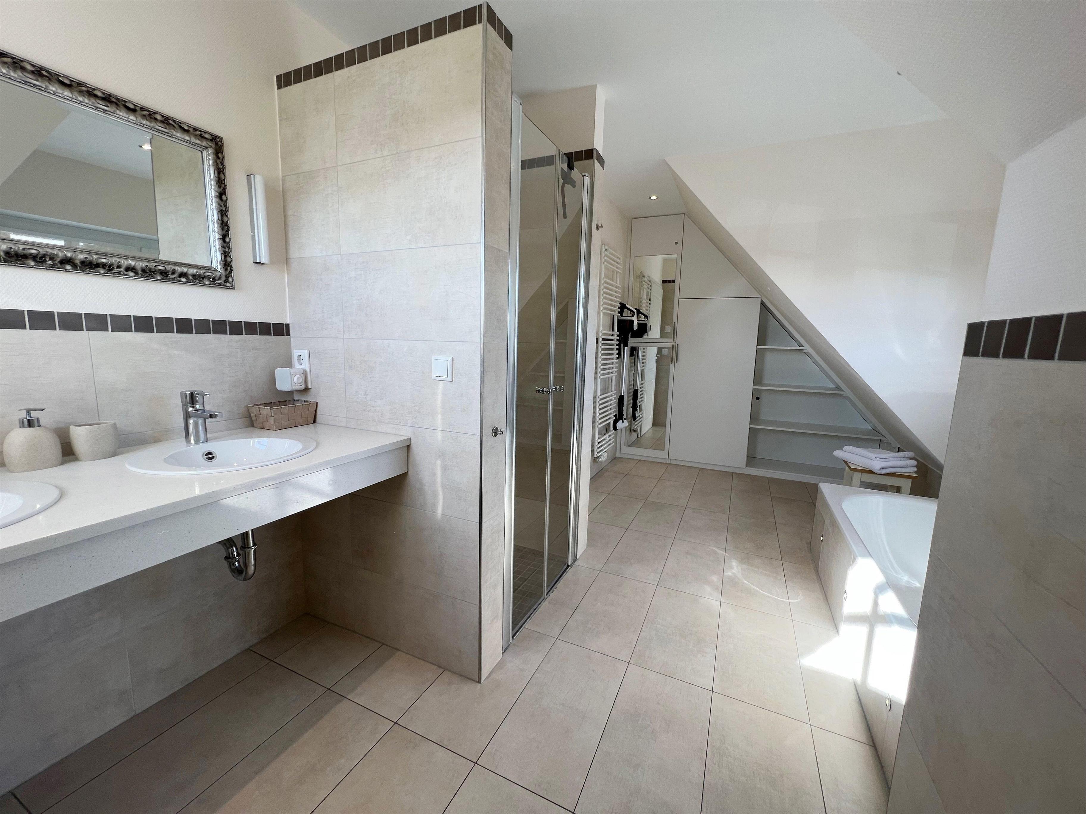 Das sehr großzügige Badezimmer im 1.OG ist mit einem Doppelwaschtisch, einer Dusche und einer Badewanne ausgestattet. Zudem finden Sie dort es einen Make-Up-Spiegel, einen Profihaartrockner und kostenlose Rituals-Kosmetikproben.