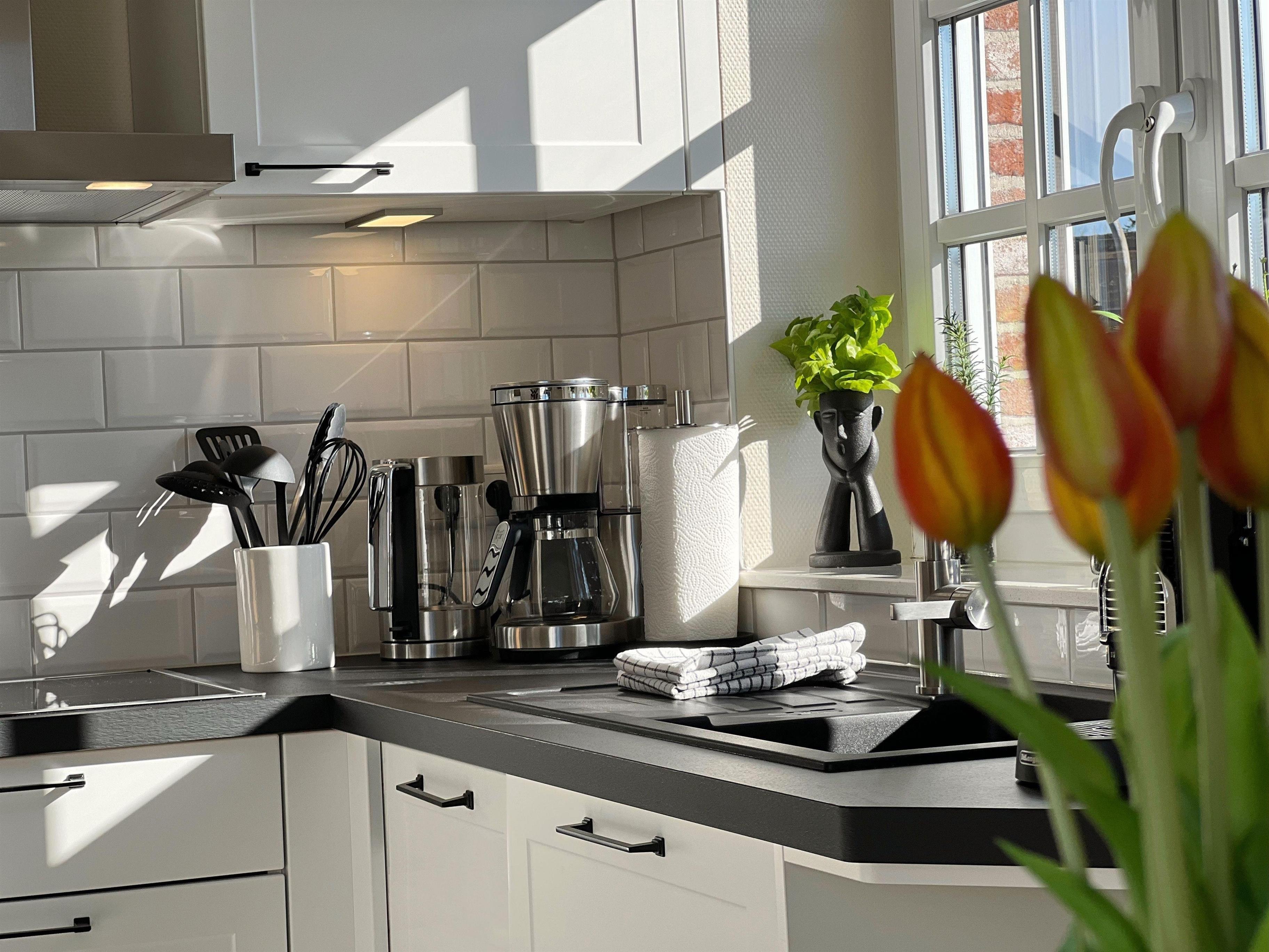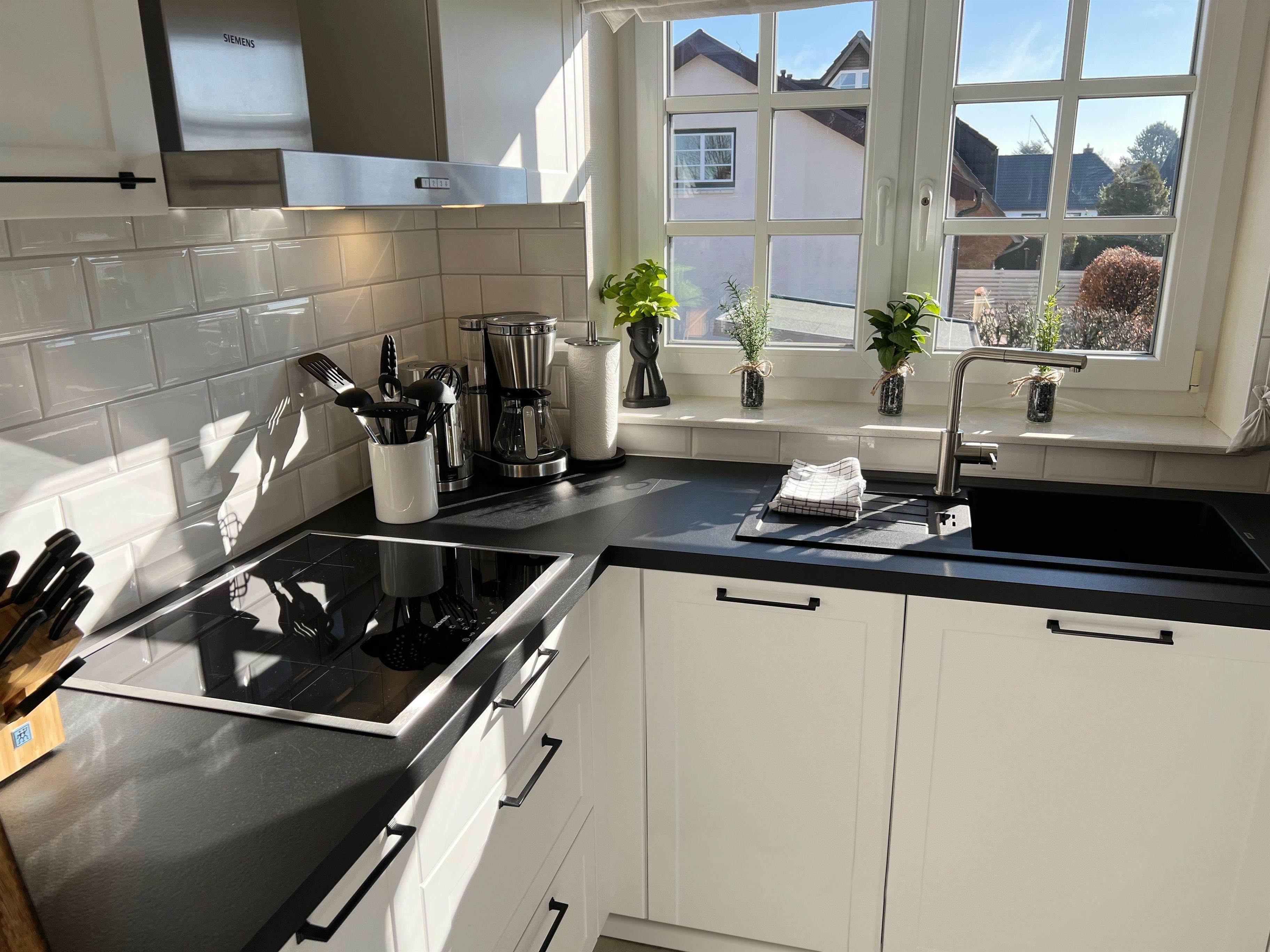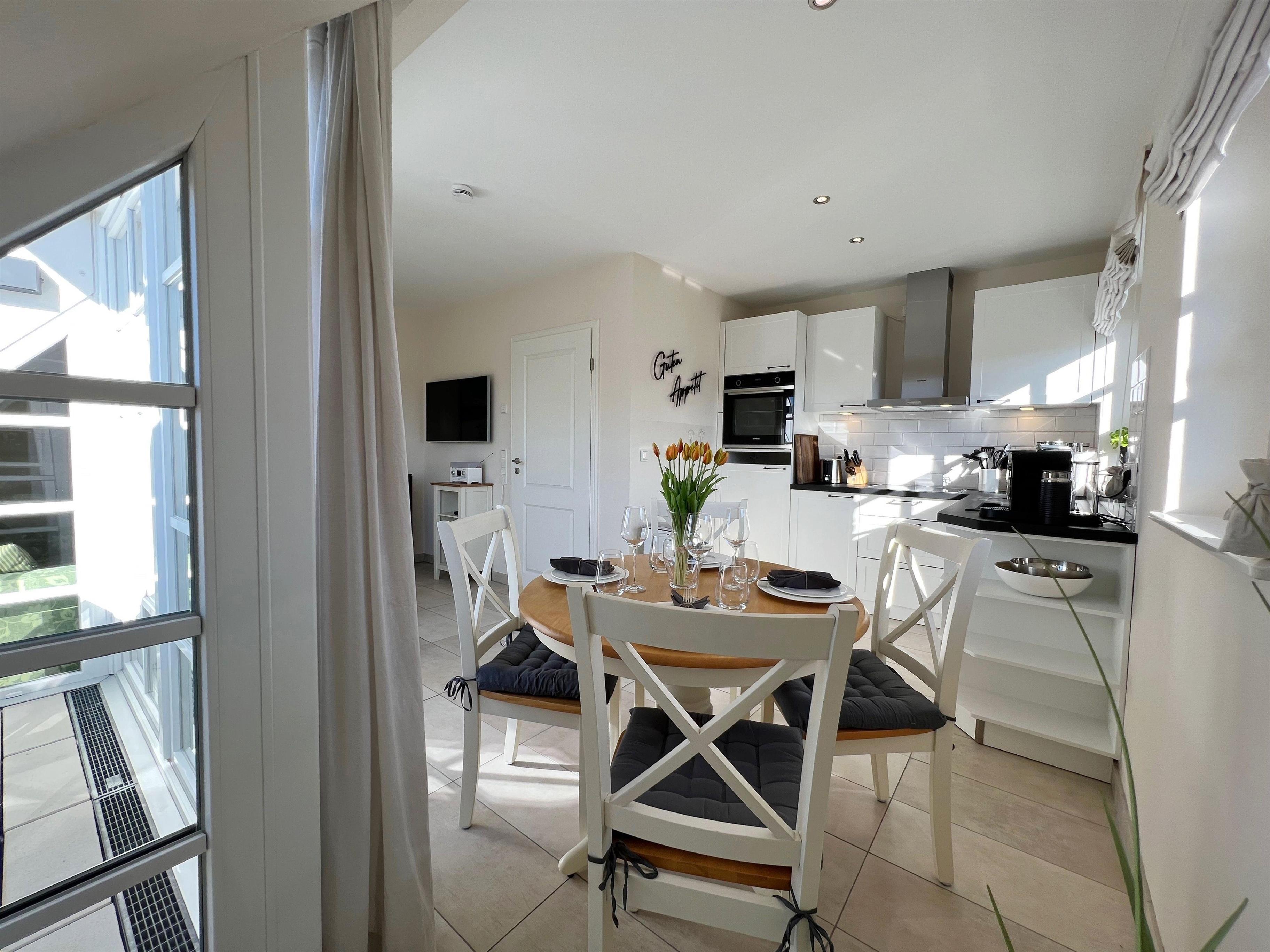 Die angrenzende neue Landhausküche verfügt über einen Siemens-Induktionsherd mit Backofen, eine Geschirrspülmaschine, eine Nespresso-Kapselkaffeemaschine und weitere hochwertige WMF-Küchengeräte.