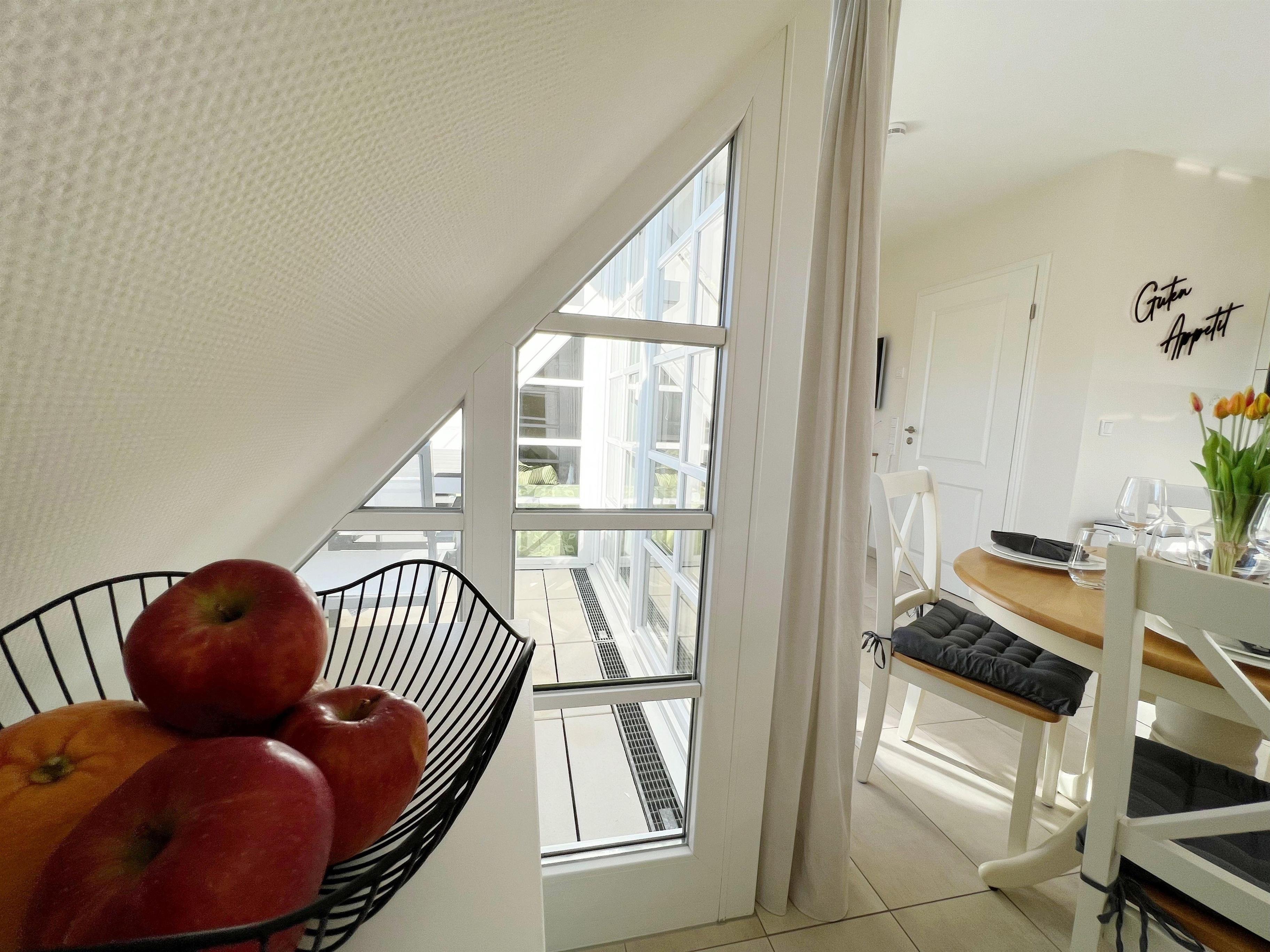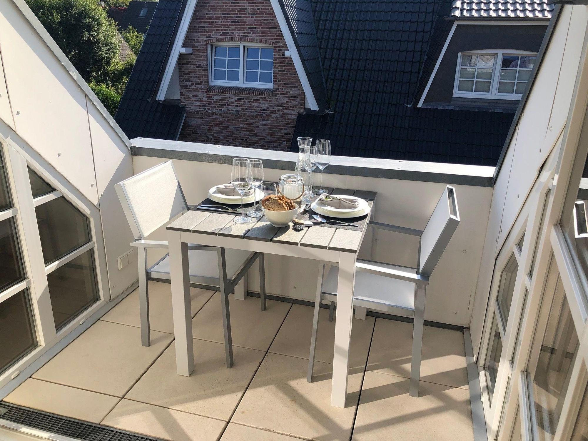 Vom Wohnbereich aus gelangt man auf einen geschützten Südbalkon mit einem Terrassentisch und zwei Designerstühlen.