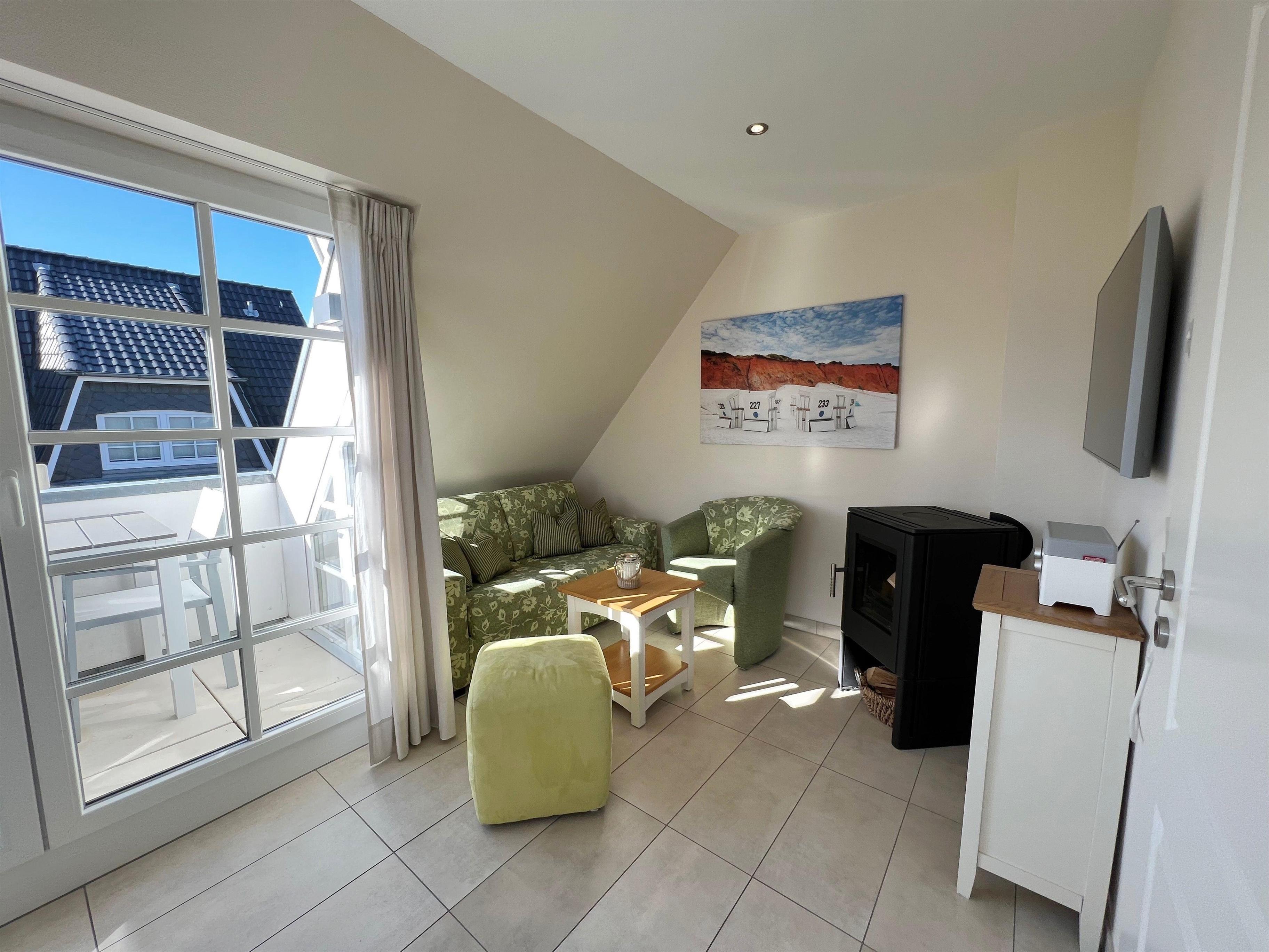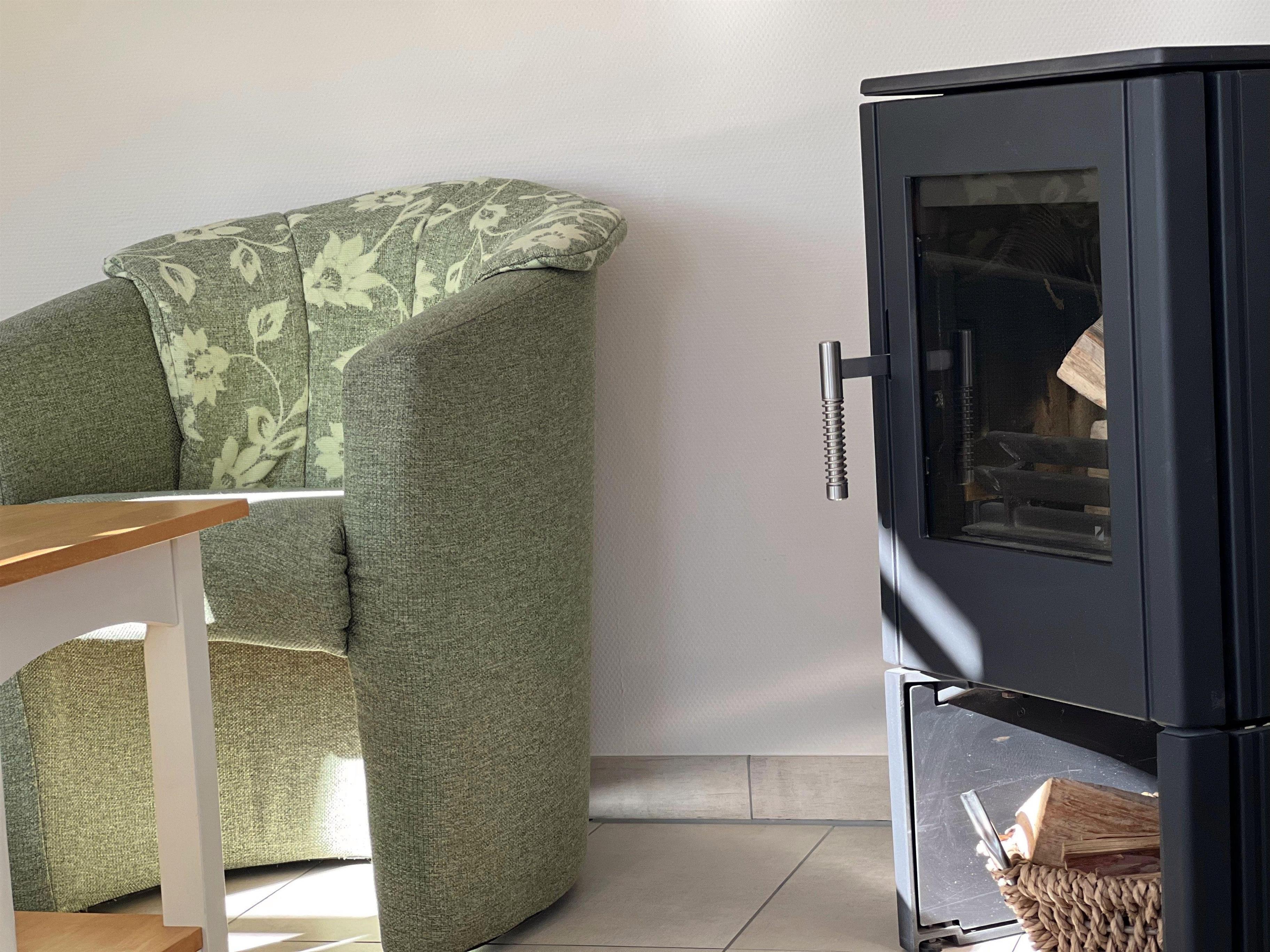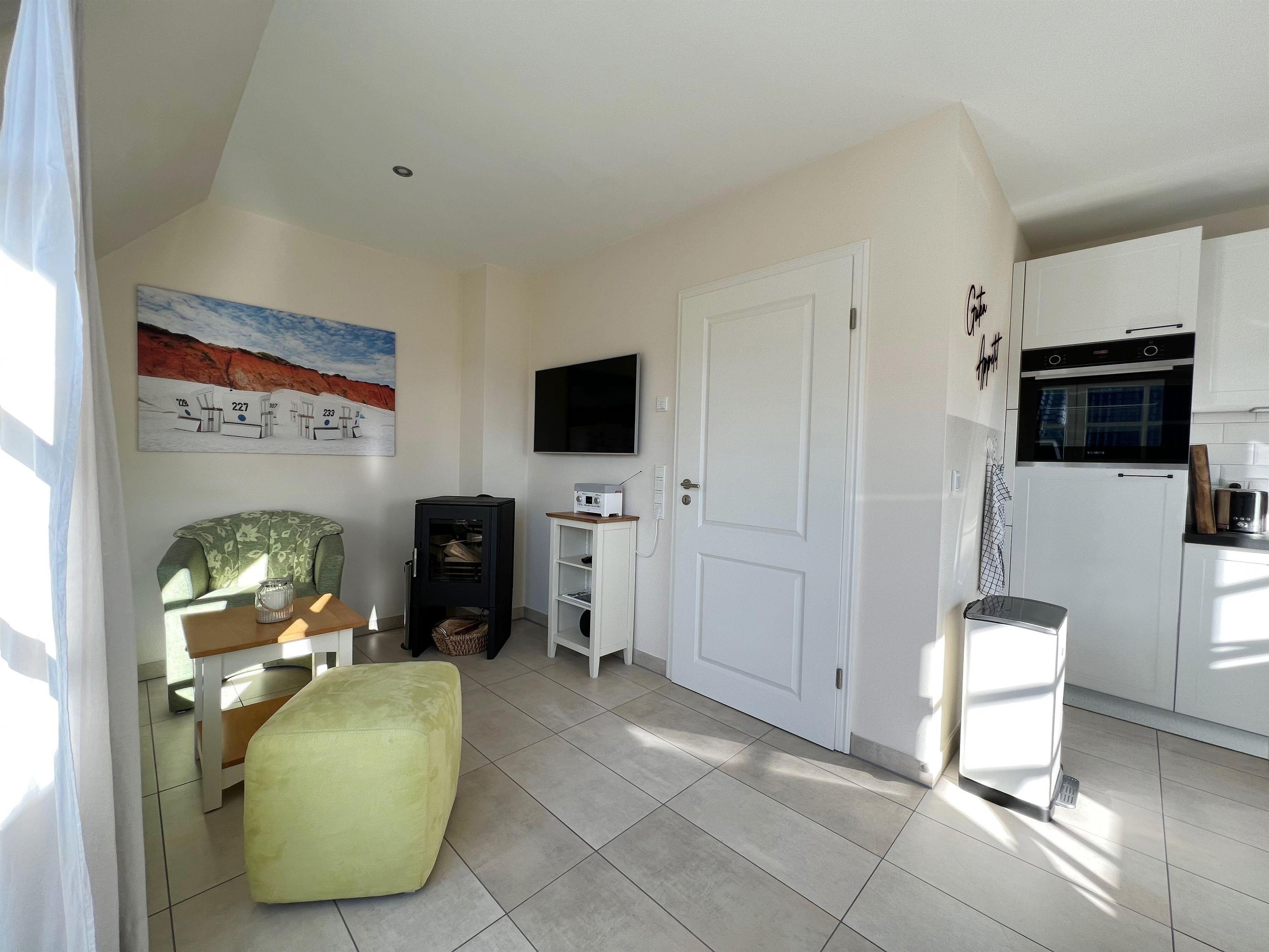 Der Wohnbereich ist mit einem Schlafsofa (140x200cm Liegefläche), einem stimmungsvollen Kaminofen, einem LG Smart-TV (Internet- und Kabelanschluss), einem Teufel Internetradio mit Bluetooth-Lautsprecher sowie einem Telekom WLAN-Internetanschluss ausgestattet.