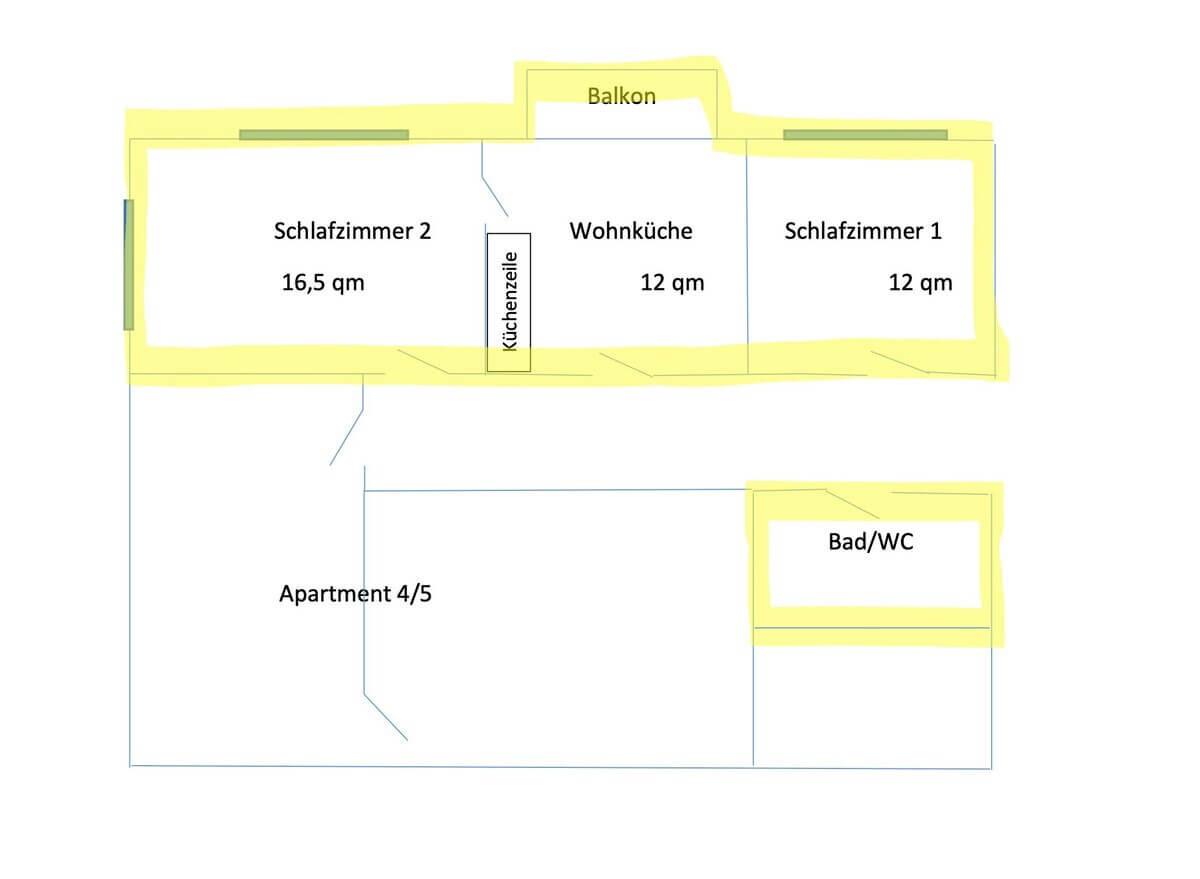 Das große (ca.45qm) Apartment befindet sich im 1.OG im Gästehaus und verfügt über zwei Schlafzimmer, eine gut ausgestattete Wohnküche mit Esstisch plus 4 Stühle, einen romantischen Balkon und ein Badezimmer (Dusche/WC) auf dem Flur gegenüber der Schlafzimmer. Eingerichtet ist das Apartment mit historischen Möbeln und zwei TV, je Schlafzimmer ein Boxspring-Bett (1,60 x 2,00).