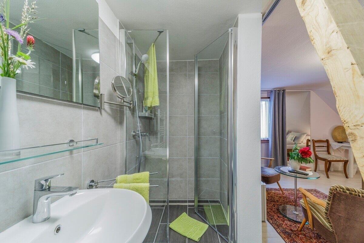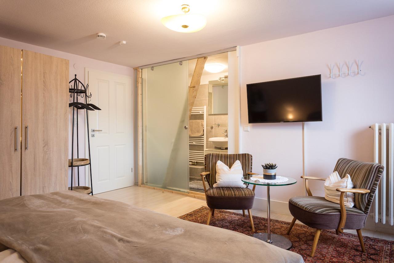 Das 21qm-Studio-Apartment befindet sich im 2.OG im Gästehaus und verfügt über ein gemütliches Schlafzimmer, eine gut ausgestattete Schrankküche mit Esstisch und 2 Stühlen und ein elegantes Bad (Dusche/WC) mit Milchglas-Schiebetür und rustikalen Dachbalken. Eingerichtet ist das Apartment mit hochwertigen, rustikalen Möbeln, zwei bequemen Retro-Sesseln und einem TV, einem rustikalen, großen Bett (1,80 x 2,00).
