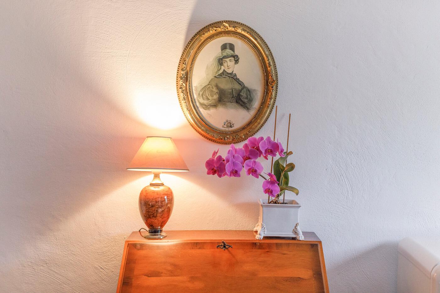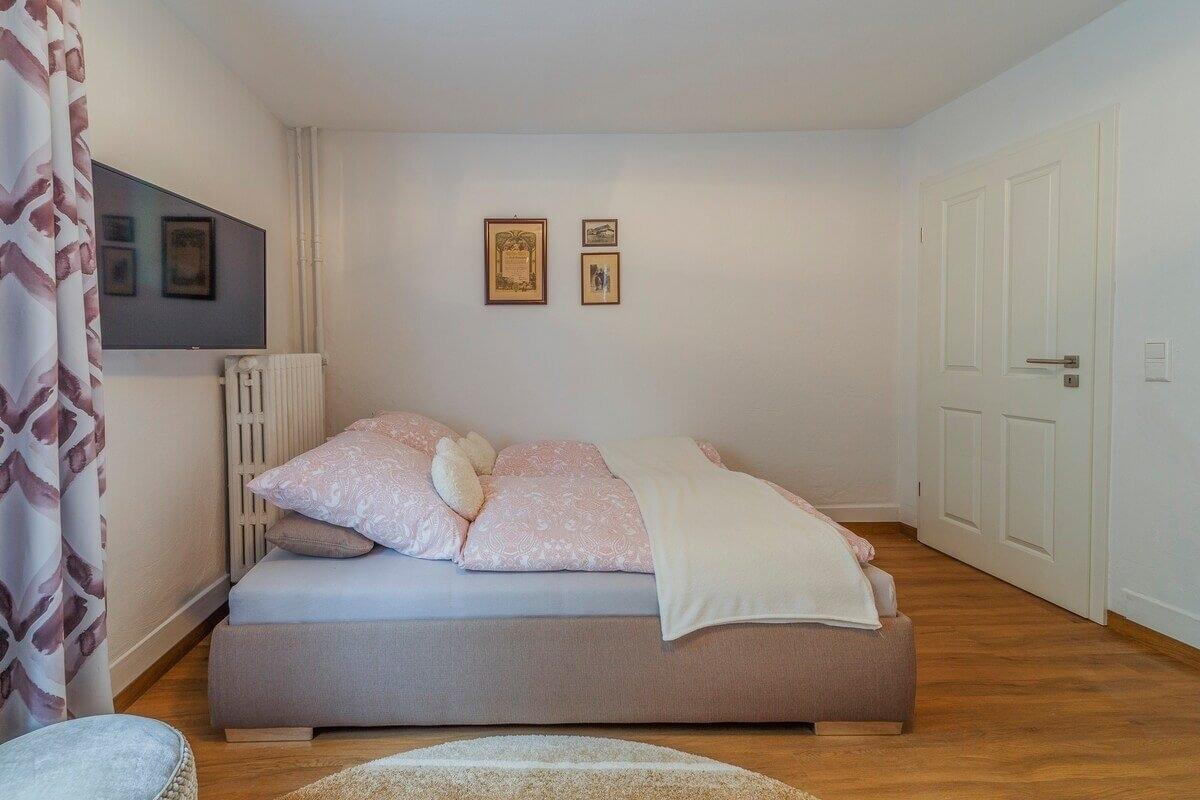 Das große (ca.35qm) Apartment befindet sich im 1.OG im Gästehaus und verfügt über ein gemütliches Schlafzimmer, eine gut ausgestattete Wohnküche mit Esstisch und 4 Stühlen und ein ansprechendes Badezimmer (Dusche/WC). Eingerichtet ist das Apartment mit hochwertigen, historischen Möbeln und einem TV, einem Designer-Bett (1,80 x 2,00) im Schlafzimmer und einem hochwertigen Boxspring-Schlafsofa (1,60 x 2,00).
