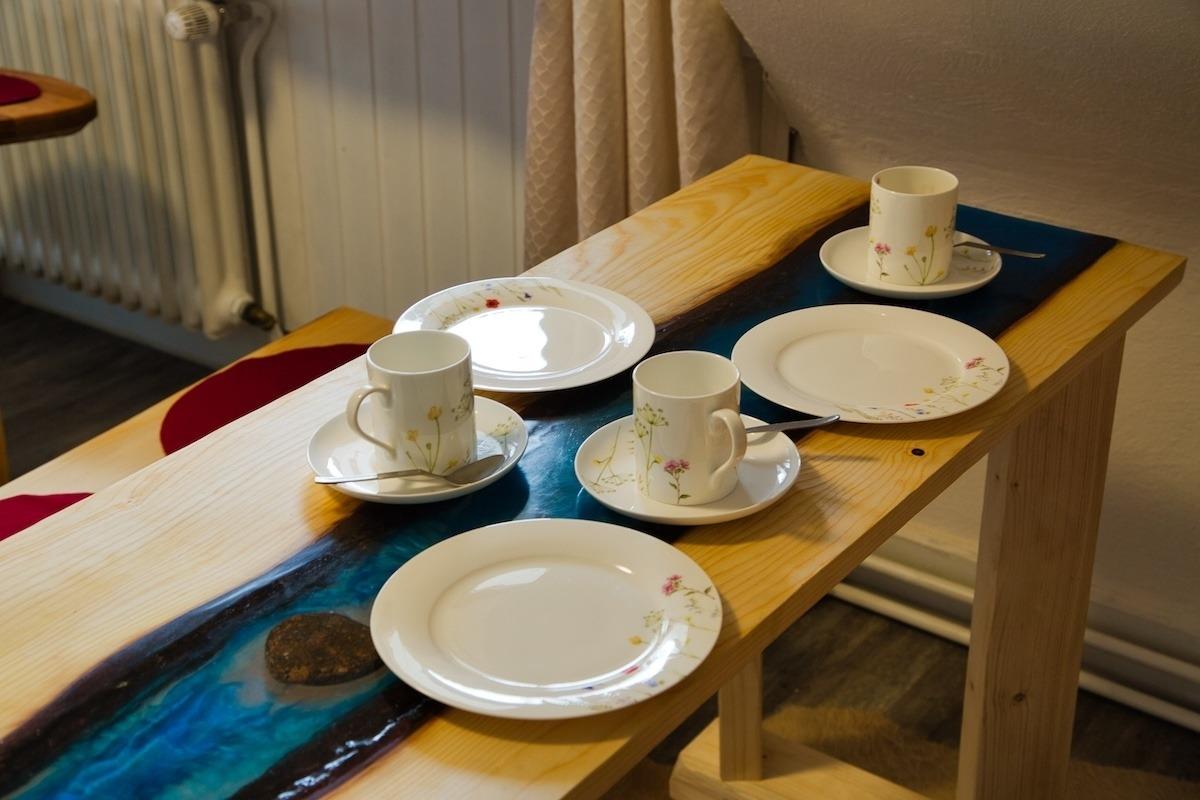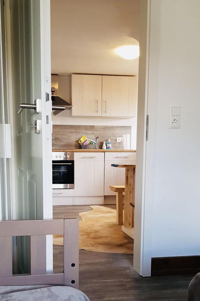 Das 2 Zimmer Apartment (21,5 qm) befindet sich im 2.OG im Gästehaus. Es verfügt über 1 Schlafzimmer und eine gut ausgestattete Küche und einem Badzimmer (Dusche/WC) im Flur gegenüber des Schlafzimmers. Eingerichtet ist das Apartment im Schwarzwald Stil mit rustikalen Schwarzwaldmöbeln von Bruni Bächle. Ein Esstisch mit 2 Bänken, zwei Upcycling-Hocker an rustikaler Fenster-Bar mit Blick Richtung See und einem TV. Im Schlafzimmer können Sie es sich auf dem hochwertigen Boxspring-Bett (1,60 x 2,00) gemütlich machen. Zusätzlich verfügt das Apartment über ein Kinderbett / Daybed (1,40 x 70).