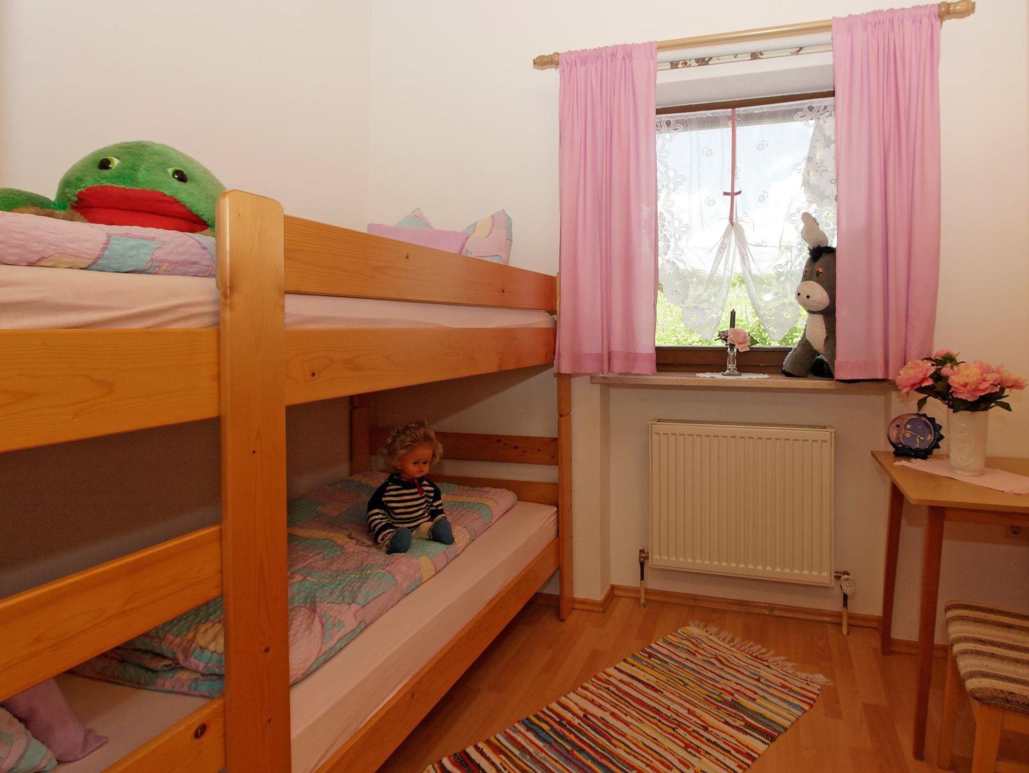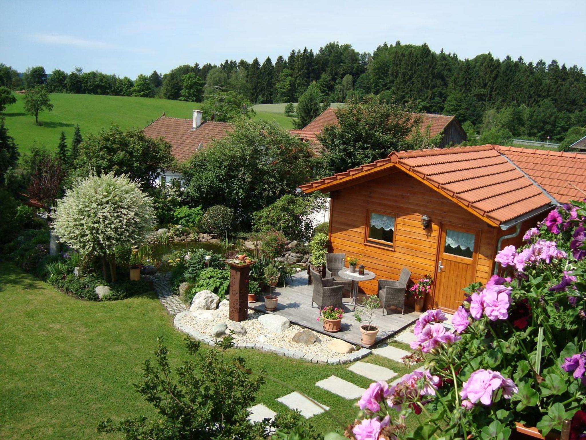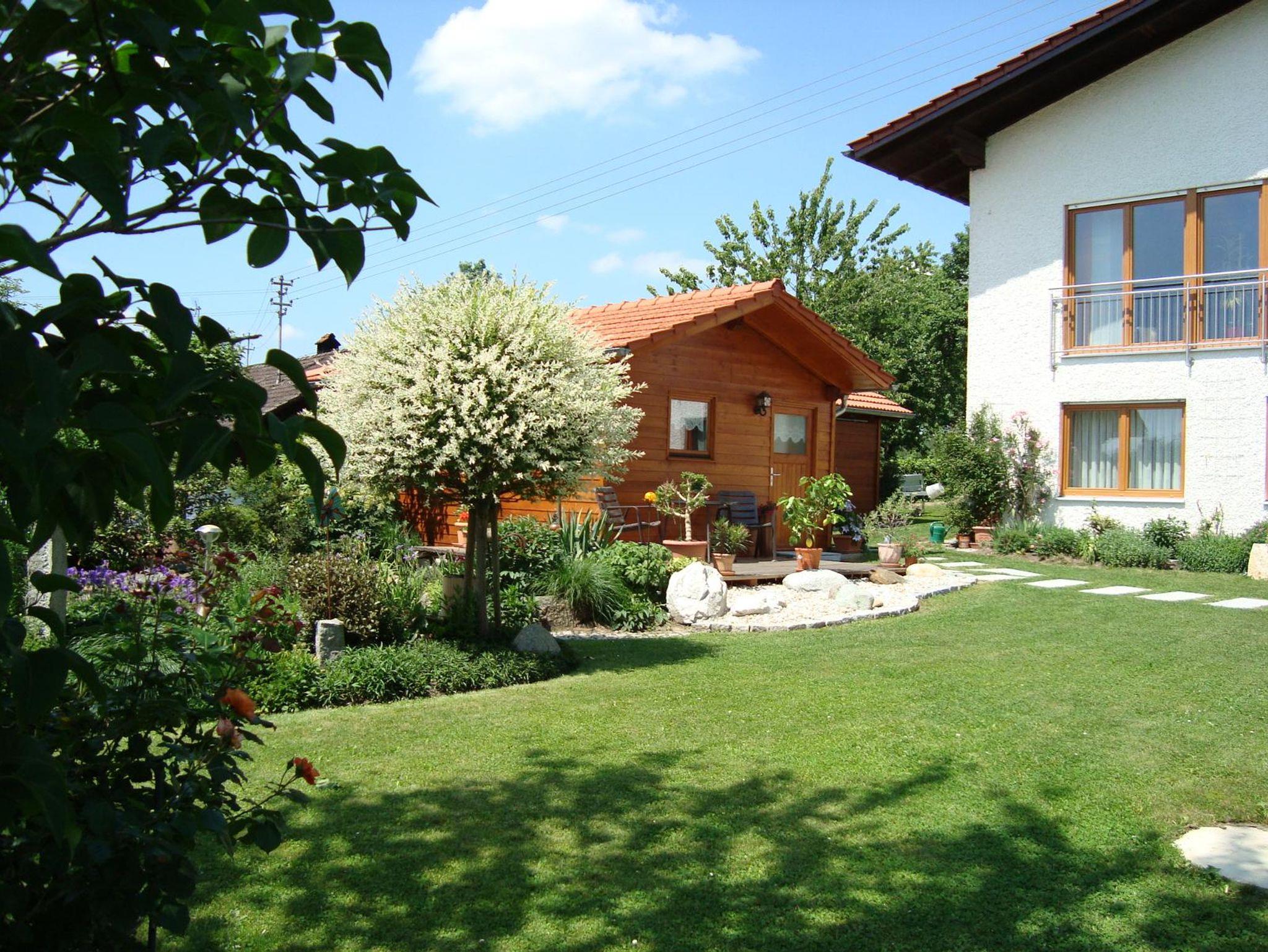 Unsere gemütliche Nichtraucher-Ferienwohnung befindet sich im 1. Obergeschoß und besteht aus Wohnküche, Wintergarten, Kinderzimmer mit Etagenbett, Wohn-Schlafzimmer und Dusche / WC. Am überdachten Balkon mit bequemen Gartenmöbeln können Sie sich vom Alltagsstress erholen. Von dort haben Sie einen Ausblick zu unserem Garten mit Teichanlage und Gartenhaus sowie in eine unverbaute Natur. Unser liebevoll angelegter Blumengarten lädt Sie zum Entspannen und Faulenzen ein (Gartenliegen sind vorhanden).