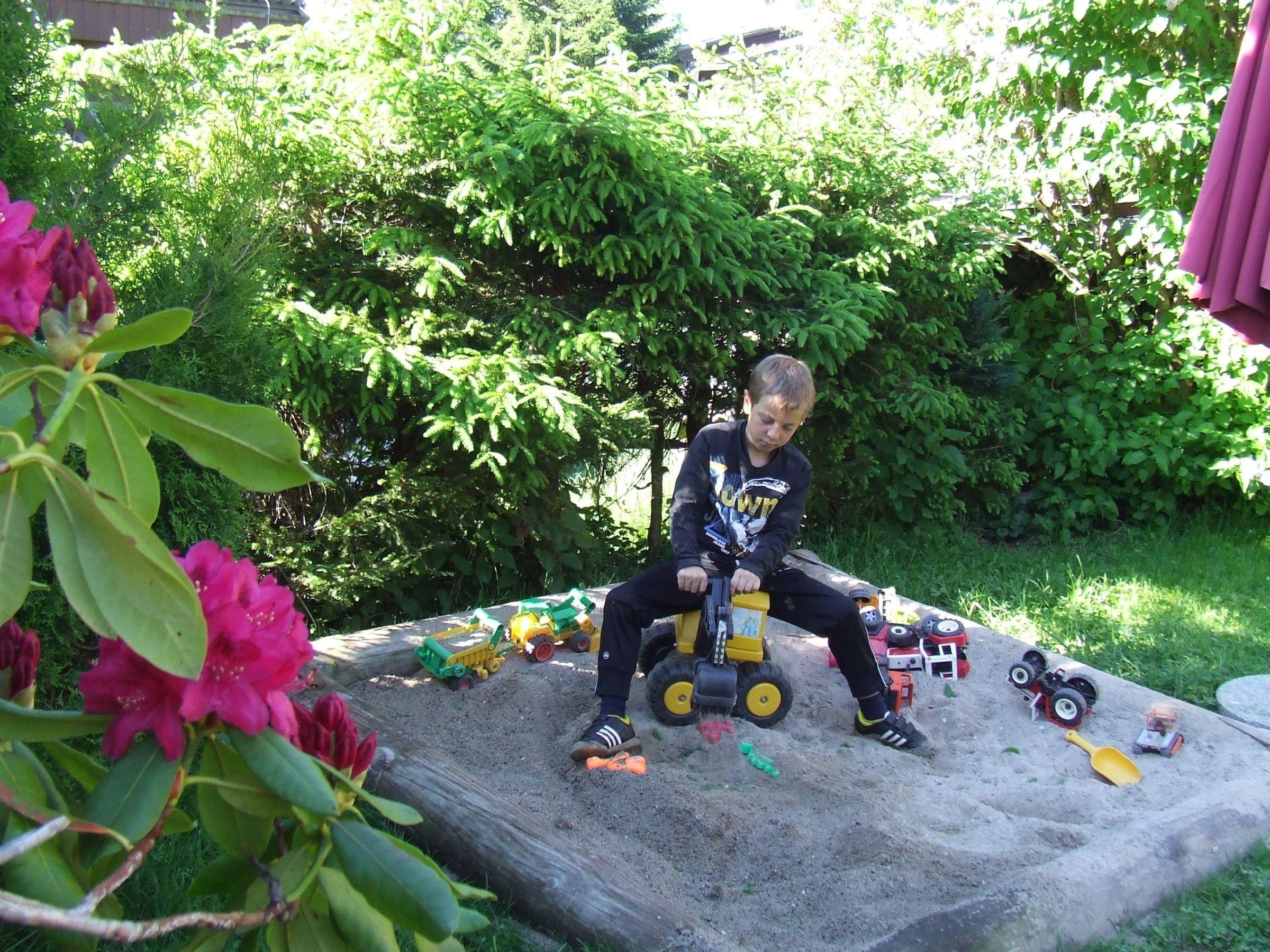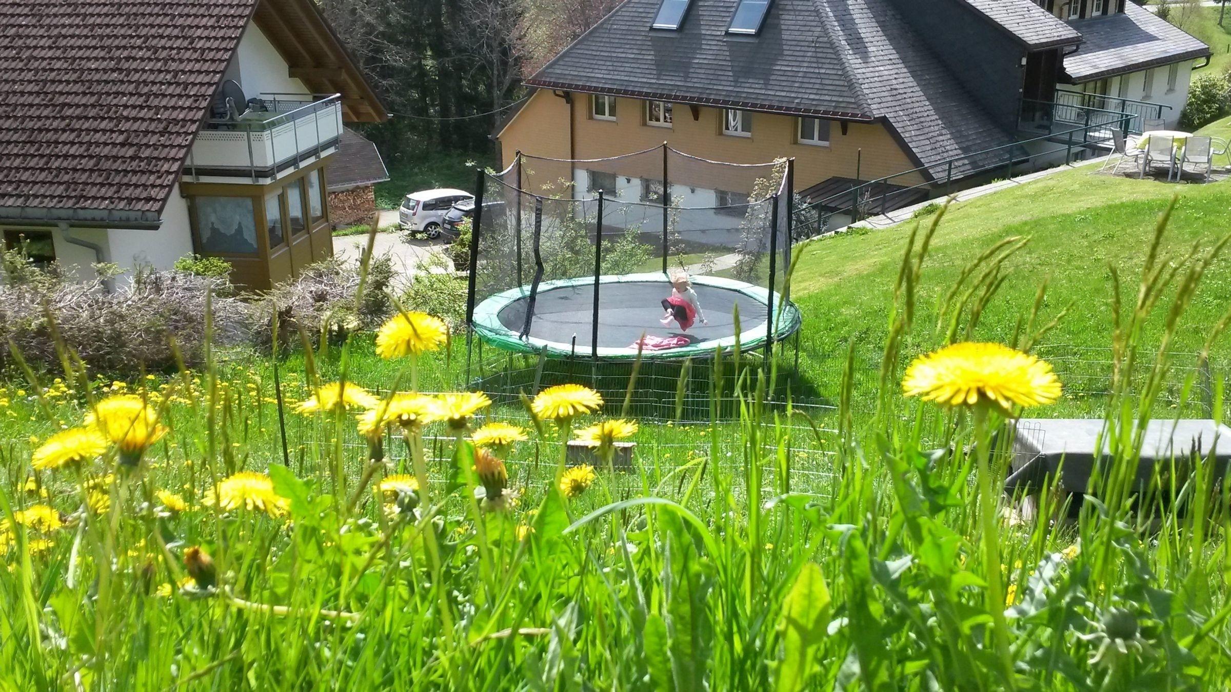 Draußen erwarten Euch Kinder im Sommer 2 Schaukeln, Trampolin, Sandkasten, Tischtennis, ein Baumhaus, sowie das Hasen-und Meerschweinchen-Gehege.