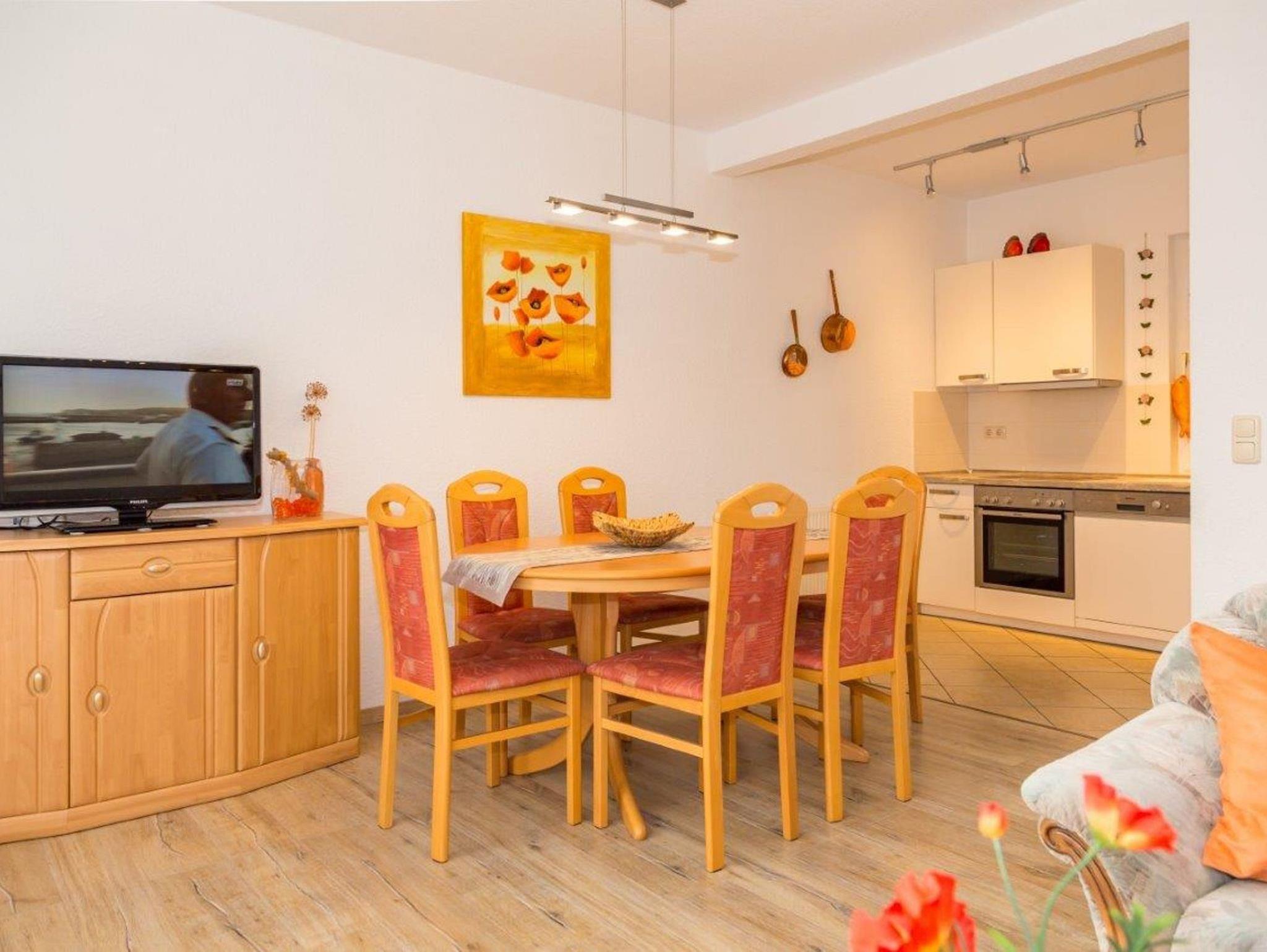 Der Wohnbereich verfügt über eine gemütliche Couch-Ecke, einen Flachbildfernseher und einen Essplatz für 6 Personen. Die moderne Küchenzeile schließt sich an den Wohnbereich an. Die Einbauküche ist komplett mit Backofen, Ceran-Herd, Spülmaschine, Mikrowelle, Kaffeemaschine, Toaster und viele Dinge mehr ausgestattet.