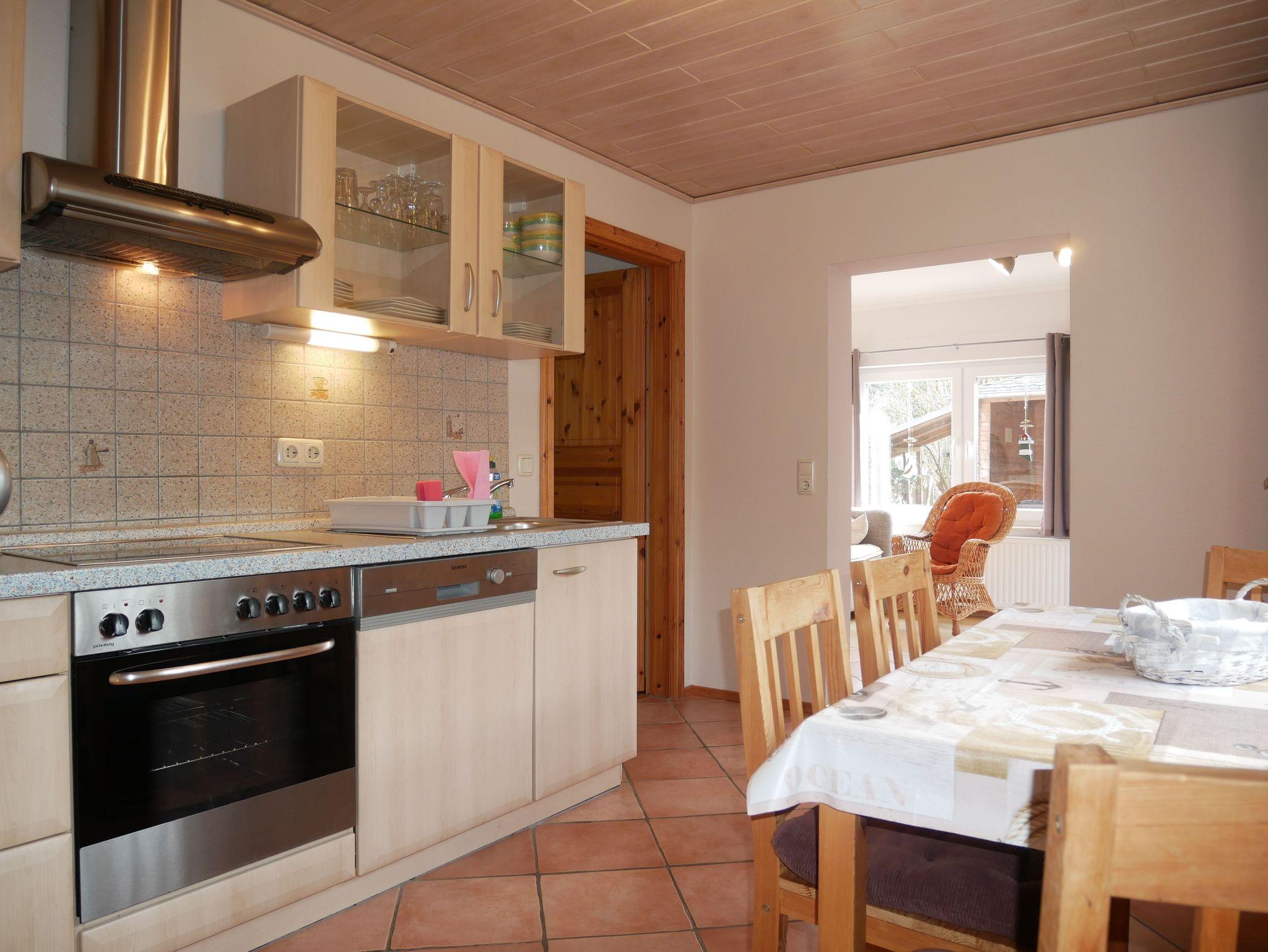 Die Unterkunft ist mit einer kompletten Einbauküche ausgestattet. Dazu gehören ein Geschirrspüler, ein Backofen, ein 4-Platten-Ceran-Kochfeld sowie ein Kühlschrank mit Gefrierfach. Ergänzt wird die Küchenausstattung durch Wasserkocher, Toaster und Kaffeemaschine.